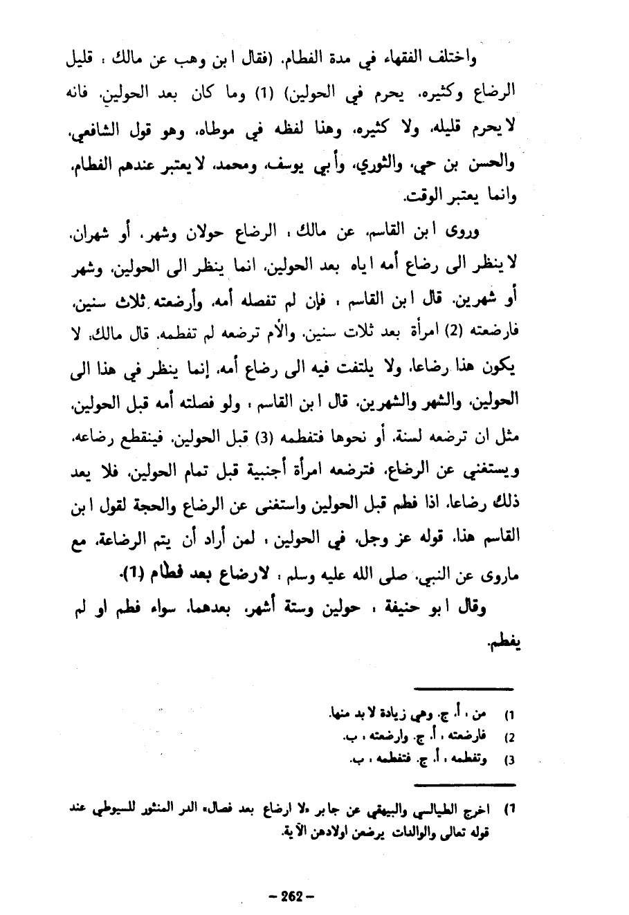 وَاخْتَلَفَ الْفُقَهَاءُ فِي مُدَّةِ الْفِطَامِ (فَقَالَ ابْنُ وَهْبٍ عَنْ مَالِكٍ قَلِيلُ الرَّضَاعِ وَكَثِيرُهُ يُحَرِّمُ فِي الْحَوْلَيْنِ) وَمَا كَانَ بَعْدَ الْحَوْلَيْنِ فَإِنَّهُ لَا يُحَرِّمُ قَلِيلُهُ وَلَا كَثِيرُهُ وَهَذَا لَفْظُهُ في موطأه وَهُوَ قَوْلُ الشَّافِعِيِّ وَالْحَسَنِ بْنِ حَيٍّ وَالثَّوْرِيِّ وَأَبِي يُوسُفَ وَمُحَمَّدٍ لَا يُعْتَبَرُ عِنْدَهُمُ الْفِطَامُ وَإِنَّمَا يُعْتَبَرُ الْوَقْتُ وَرَوَى ابْنُ الْقَاسِمِ عَنْ مَالِكٍ الرَّضَاعُ حَوْلَانِ وَشَهْرٌ أَوْ شَهْرَانِ لَا يُنْظَرُ إِلَى رَضَاعِ أُمِّهِ إِيَّاهُ بَعْدَ الْحَوْلَيْنِ إِنَّمَا يُنْظَرُ إِلَى الْحَوْلَيْنِ وَشَهْرٍ أَوْ شَهْرَيْنِ قَالَ ابْنُ الْقَاسِمِ فَإِنْ لَمْ تَفْصِلْهُ أُمُّهُ وَأَرْضَعَتْهُ ثَلَاثَ سِنِينَ فَأَرْضَعَتْهُ امْرَأَةٌ بَعْدَ ثَلَاثِ سِنِينَ وَالْأُمُّ تُرْضِعُهُ لَمْ تَفْطِمْهُ قَالَ مَالِكٌ لَا يَكُونُ هَذَا رَضَاعًا وَلَا يُلْتَفَتُ فِيهِ إِلَى رَضَاعِ أُمِّهِ إِنَّمَا يُنْظَرُ فِي هَذَا إِلَى الْحَوْلَيْنِ وَالشَّهْرِ وَالشَّهْرَيْنِ قَالَ ابْنُ الْقَاسِمِ وَلَوْ فَصَلَتْهُ أُمُّهُ قَبْلَ الْحَوْلَيْنِ مِثْلُ أَنْ تُرْضِعَهُ لِسَنَةٍ أَوْ نَحْوِهَا فَتَفْطِمُهُ قَبْلَ الْحَوْلَيْنِ فَيَنْقَطِعُ رَضَاعُهُ وَيَسْتَغْنِي عَنِ الرَّضَاعِ فَتُرْضِعُهُ امْرَأَةٌ أَجْنَبِيَّةٌ قَبْلَ تَمَامِ الْحَوْلَيْنِ فَلَا يُعَدُّ ذَلِكَ رَضَاعًا إِذَا فُطِمَ قَبْلَ الْحَوْلَيْنِ وَاسْتَغْنَى عَنِ الرَّضَاعِ وَالْحُجَّةُ لِقَوْلِ ابْنِ الْقَاسِمِ هَذَا قَوْلُهُ عَزَّ وَجَلَّ فِي الْحَوْلَيْنِ لِمَنْ أَرَادَ أَنْ يُتِمَّ الرَّضَاعَةَ مَعَ مَا رُوِيَ عَنِ النَّبِيِّ صَلَّى اللَّهُ عَلَيْهِ وَسَلَّمَ لَا رَضَاعَ بَعْدَ فِطَامٍ وَقَالَ أَبُو حَنِيفَةَ حَوْلَيْنِ وَسِتَّةَ أَشْهُرٍ بَعْدَهُمَا سَوَاءٌ فُطِمَ أَوْ لَمْ يُفْطَمْ
