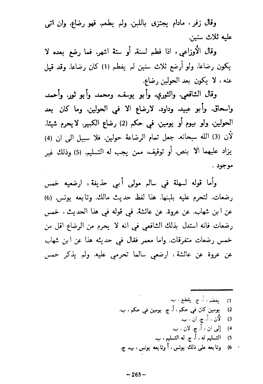 وَقَالَ زُفَرُ مَا دَامَ يَجْتَزِي بِاللَّبَنِ وَلَمْ يَطْعَمْ فَهُوَ رَضَاعٌ وَإِنْ أَتَى عَلَيْهِ ثَلَاثُ سِنِينَ وَقَالَ الْأَوْزَاعِيُّ إِذَا فُطِمَ لِسَنَةٍ أَوْ سِتَّةِ أَشْهُرٍ فَمَا رَضَعَ بَعْدَهُ لَا يَكُونُ رَضَاعًا وَلَوْ أُرْضِعَ ثَلَاثَ سِنِينَ لَمْ يُفْطَمْ كَانَ رَضَاعًا وَقَدْ قِيلَ عَنْهُ لَا يَكُونُ بَعْدَ الْحَوْلَيْنِ رَضَاعٌ وَقَالَ الشَّافِعِيُّ وَالثَّوْرِيُّ وَأَبُو يُوسُفَ وَمُحَمَّدٌ وَأَبُو ثَوْرٍ وَأَحْمَدُ وَإِسْحَاقُ وَأَبُو عُبَيْدٍ وَدَاوُدُ لَا رَضَاعَ إِلَّا فِي الْحَوْلَيْنِ وَمَا كَانَ بَعْدَ الْحَوْلَيْنِ وَلَوْ بِيَوْمٍ أَوْ يَوْمَيْنِ فِي حُكْمِ رَضَاعِ الْكَبِيرِ لَا يُحَرِّمُ شَيْئًا لِأَنَّ اللَّهَ سُبْحَانَهُ جَعَلَ تَمَامَ الرَّضَاعَةِ حَوْلَيْنِ فَلَا سَبِيلَ إِلَى أَنْ يُزَادَ عَلَيْهِمَا إِلَّا بِنَصٍّ أَوْ تَوْقِيفٍ مِمَّنْ يَجِبُ لَهُ التَّسْلِيمُ وَذَلِكَ غَيْرُ مَوْجُودٍ وَأَمَّا قَوْلُهُ لِسَهْلَةَ فِي سَالِمٍ مَوْلَى أَبِي حُذَيْفَةَ أَرْضِعِيهِ خَمْسَ رَضَعَاتٍ لِتَحْرُمَ عَلَيْهِ بِلَبَنِهَا هَذَا لَفْظُ حَدِيثِ مَالِكٍ وَتَابَعَهُ يُونُسُ عَنِ ابْنِ شِهَابٍ عَنْ عُرْوَةَ عَنْ عَائِشَةَ فِي قَوْلِهِ فِي هَذَا الْحَدِيثِ خَمْسَ رَضَعَاتٍ فَإِنَّهُ اسْتَدَلَّ بِذَلِكَ الشَّافِعِيُّ فِي أَنَّهُ لَا يُحَرِّمُ مِنَ الرَّضَاعِ أَقَلُّ مِنْ خَمْسِ رَضَعَاتٍ مُتَفَرِّقَاتٍ وَأَمَّا مَعْمَرٌ فَقَالَ فِي حَدِيثِهِ هَذَا عَنِ ابْنِ شِهَابٍ عَنْ عُرْوَةَ عَنْ عَائِشَةَ أَرْضِعِي سَالِمًا تَحْرُمِي عَلَيْهِ وَلَمْ يَذْكُرْ خَمْسَ