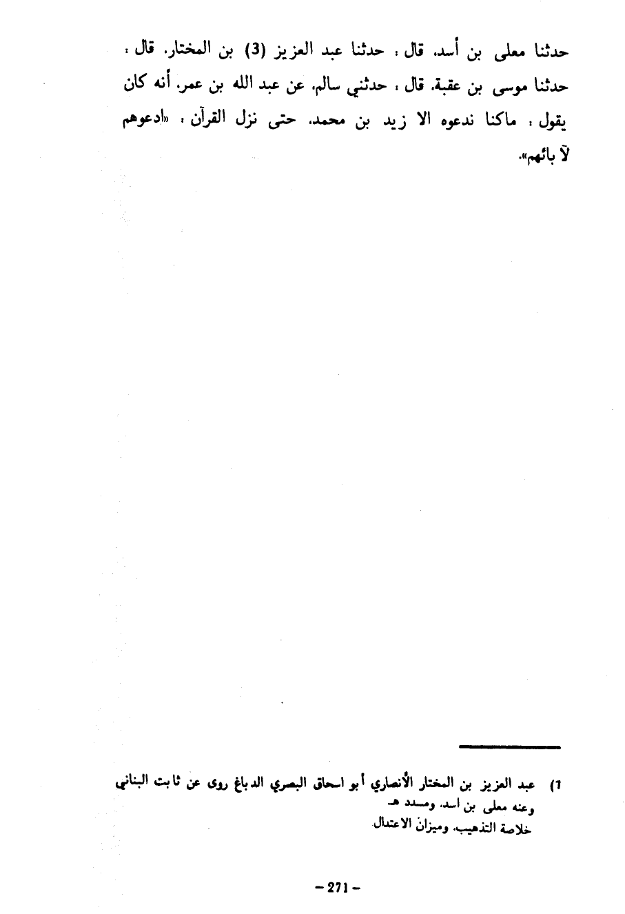 65 - دثنا مُعَلَّى بْنُ أَسَدٍ قَالَ حَدَّثَنَا عَبْدُ الْعَزِيزِ بْنُ الْمُخْتَارِ قَالَ حَدَّثَنَا مُوسَى بْنُ عُقْبَةَ قَالَ حَدَّثَنِي سَالِمٌ عَنْ عَبْدِ اللَّهِ بْنِ عُمَرَ أَنَّهُ كَانَ يَقُولُ مَا كُنَّا نَدْعُوهُ إِلَّا زَيْدَ بْنَ مُحَمَّدٍ حَتَّى نَزَلَ الْقُرْآنُ ادعوهم لآبائهم