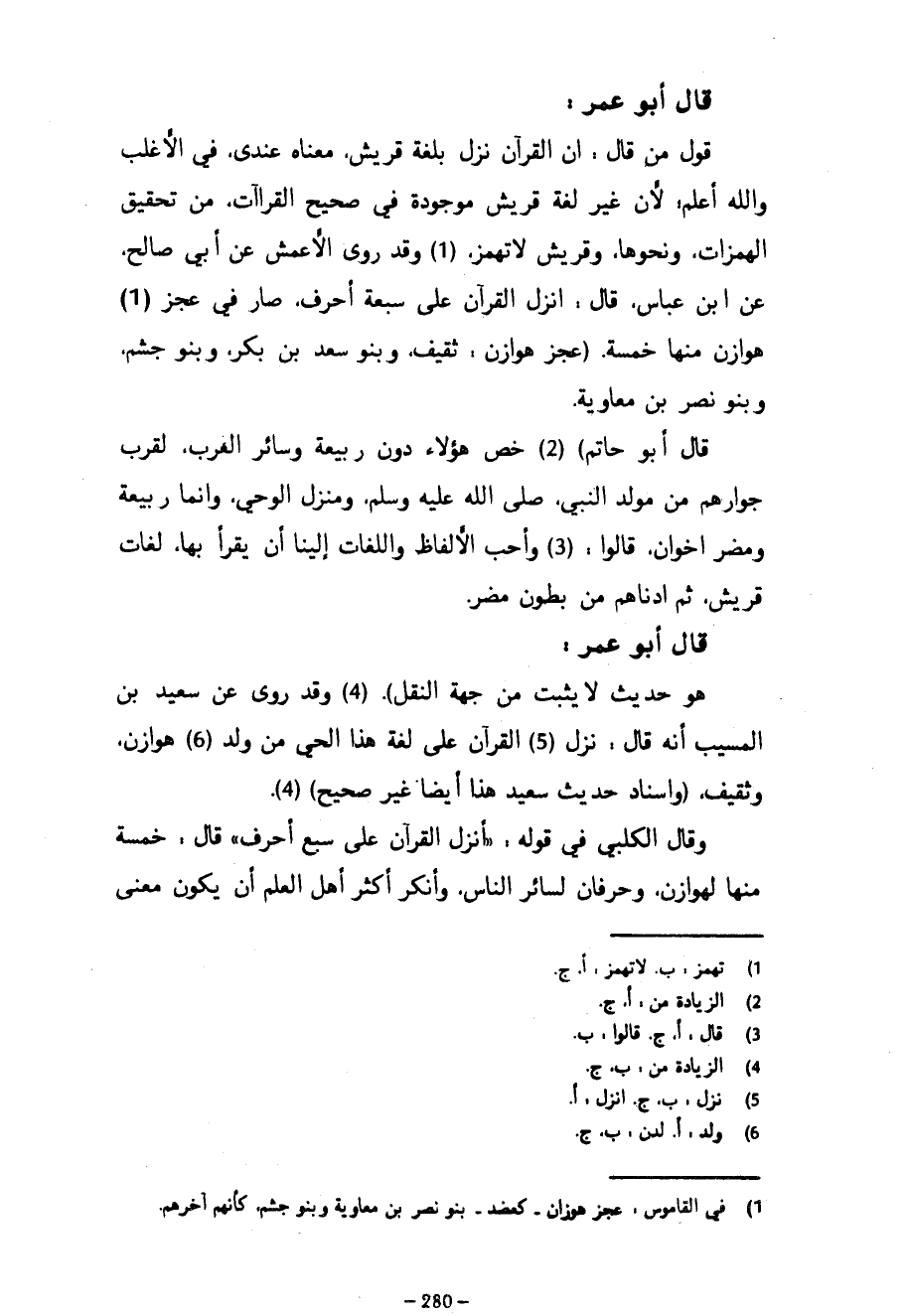 - قَالَ أَبُو عُمَرَ قَوْلُ مَنْ قَالَ إِنَّ الْقُرْآنَ نَزَلَ بِلُغَةِ قُرَيْشٍ مَعْنَاهُ عِنْدِي فِي الْأَغْلَبِ وَاللَّهُ أَعْلَمُ لِأَنَّ غَيْرَ لُغَةِ قُرَيْشٍ موجودة في صحيح القراآت مِنْ تَحْقِيقِ الْهَمَزَاتِ وَنَحْوِهَا وَقُرَيْشٌ لَا تَهْمِزُ وَقَدْ رَوَى الْأَعْمَشُ عَنْ أَبِي صَالِحٍ عَنِ ابْنِ عَبَّاسٍ قَالَ أُنْزِلَ الْقُرْآنُ عَلَى سَبْعَةِ أَحْرُفٍ صَارَ فِي عَجُزِ هَوَازِنَ مِنْهَا خَمْسَةٌ (عَجُزُ هَوَازِنَ ثَقِيفٌ وَبَنُو سَعْدِ بْنِ بَكْرٍ وَبَنُو جُشَمَ وَبَنُو نَصْرِ بْنِ مُعَاوِيَةَ قَالَ أَبُو حَاتِمٍ) خَصَّ هَؤُلَاءِ دُونَ رَبِيعَةَ وَسَائِرِ الْعَرَبِ لِقُرْبِ جِوَارِهِمْ مِنْ مَوْلِدِ النَّبِيِّ صَلَّى اللَّهُ عَلَيْهِ وَسَلَّمَ وَمَنْزِلِ الْوَحْيِ وَإِنَّمَا رَبِيعَةُ وَمُضَرُ إِخْوَانٌ قَالُوا وَأَحَبُّ الْأَلْفَاظِ وَاللُّغَاتِ إِلَيْنَا أَنْ يُقْرَأَ بِهَا لُغَاتُ قُرَيْشٍ ثُمَّ أَدْنَاهُمْ مِنْ بُطُونِ مُضَرَ - قَالَ أَبُو عُمَرَ هُوَ حَدِيثٌ لَا يَثْبُتُ مِنْ جِهَةِ النَّقْلِ) وَقَدْ رُوِيَ عَنْ سَعِيدِ بْنِ الْمُسَيَّبِ أَنَّهُ قَالَ نَزَلَ الْقُرْآنُ عَلَى لُغَةِ هَذَا الْحَيِّ مِنْ وَلَدِ هَوَازِنَ وَثَقِيفٍ (وَإِسْنَادُ حَدِيثِ سَعِيدٍ هَذَا أَيْضًا غَيْرُ صَحِيحٍ) وَقَالَ الْكَلْبِيُّ فِي قَوْلِهِ أنزل القرآن على سبع أَحْرُفٍ قَالَ خَمْسَةٌ مِنْهَا لِهَوَازِنَ وَحَرْفَانِ لِسَائِرِ النَّاسِ وَأَنْكَرَ أَكْثَرُ أَهْلِ الْعِلْمِ أَنْ يَكُونَ معنى