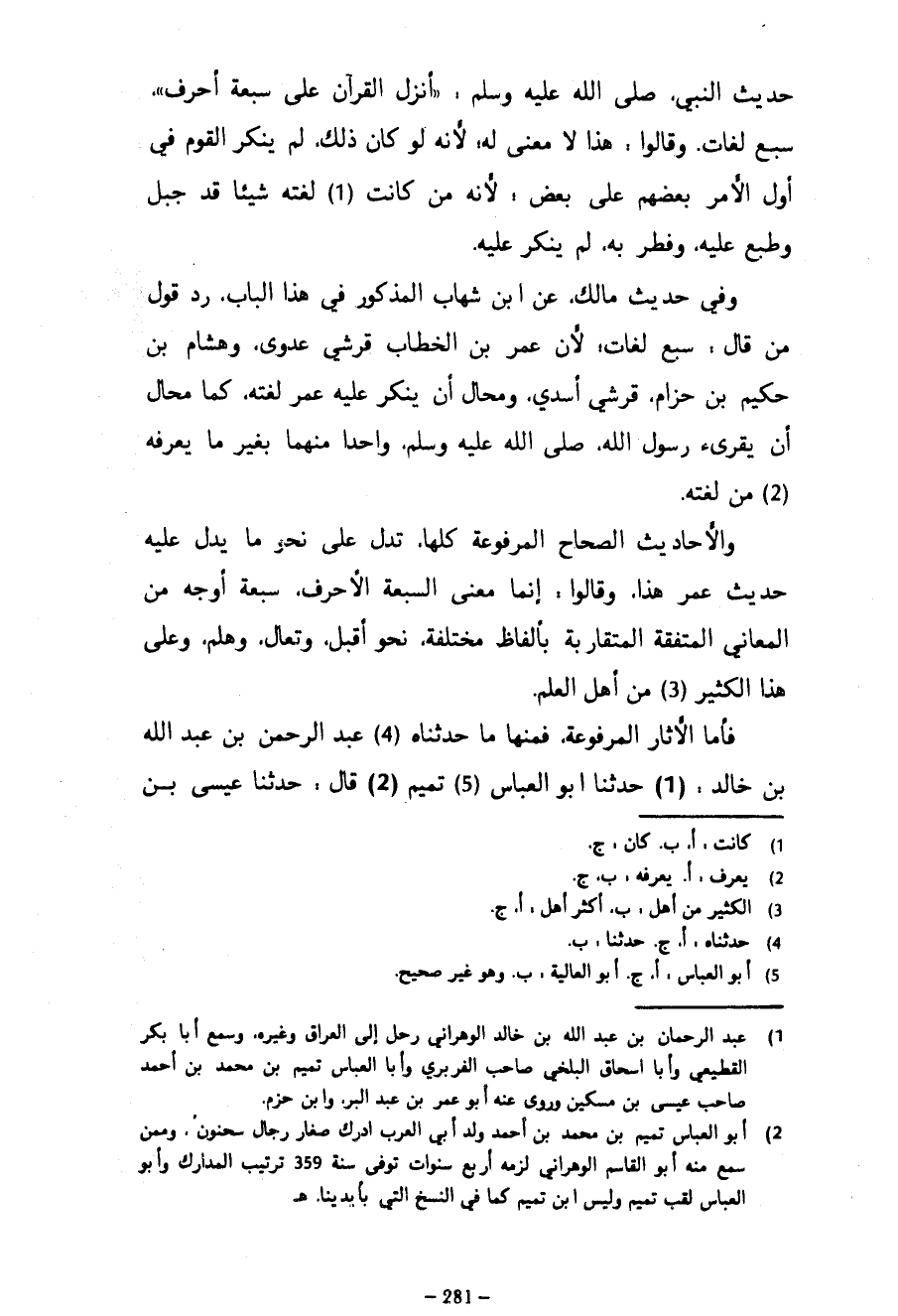 حَدِيثِ النَّبِيِّ صَلَّى اللَّهُ عَلَيْهِ وَسَلَّمَ أُنْزِلَ الْقُرْآنُ عَلَى سَبْعَةِ أَحْرُفٍ سَبْعَ لُغَاتٍ وَقَالُوا هَذَا لَا مَعْنَى لَهُ لِأَنَّهُ لَوْ كَانَ ذَلِكَ لَمْ يُنْكِرِ الْقَوْمُ فِي أَوَّلِ الْأَمْرِ بَعْضُهُمْ عَلَى بَعْضٍ لِأَنَّهُ مَنْ كَانَتْ لُغَتُهُ شَيْئًا قَدْ جُبِلَ وَطُبِعَ عَلَيْهِ وَفُطِرَ بِهِ لَمْ يُنْكَرْ عَلَيْهِ وَفِي حَدِيثُ مَالِكٍ عَنِ ابْنِ شِهَابٍ الْمَذْكُورُ فِي هَذَا الْبَابِ رَدُّ قَوْلِ مَنْ قَالَ سَبْعُ لُغَاتٍ لِأَنَّ عُمَرَ بْنَ الْخَطَّابِ قُرَشِيٌّ عَدَوِيٌّ وَهِشَامُ بْنُ حَكِيمِ بْنِ حِزَامٍ قُرَشِيٌّ أَسَدِيٌّ وَمُحَالٌ أَنْ يُنْكِرَ عليه عمر لغته كما محال أن يقرىء رَسُولُ اللَّهِ صَلَّى اللَّهُ عَلَيْهِ وَسَلَّمَ وَاحِدًا مِنْهُمَا بِغَيْرِ مَا يَعْرِفُهُ مِنْ لُغَتِهِ وَالْأَحَادِيثُ الصِّحَاحُ الْمَرْفُوعَةُ كُلُّهَا تَدُلُّ عَلَى نَحْوِ مَا يَدُلُّ عَلَيْهِ حَدِيثُ عُمَرَ هَذَا وَقَالُوا إِنَّمَا مَعْنَى السَّبْعَةِ الْأَحْرُفِ سَبْعَةُ أَوْجَهٍ مِنَ الْمَعَانِي الْمُتَّفِقَةِ الْمُتَقَارِبَةِ بِأَلْفَاظٍ مُخْتَلِفَةٍ نَحْوُ أَقْبِلْ وَتَعَالَ وَهَلُمَّ وَعَلَى هَذَا الْكَثِيرُ مِنْ أَهْلِ الْعِلْمِ فَأَمَّا الْآثَارُ الْمَرْفُوعَةُ فَمِنْهَا مَا حَدَّثَنَاهُ عَبْدُ الرَّحْمَنِ بْنُ عَبْدِ اللَّهِ بْنِ خَالِدٍ حَدَّثَنَا أَبُو الْعَبَّاسِ تَمِيمٌ قَالَ حَدَّثَنَا عِيسَى بْنُ