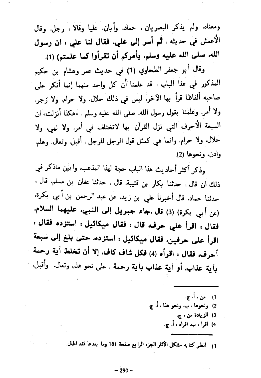 وَمَعْنَاهُ وَلَمْ يَذْكُرِ الْبَصْرِيَّانِ حَمَّادٌ وَأَبَانٌ عَلِيًّا وقالا رجل وَقَالَ الْأَعْمَشُ فِي حَدِيثِهِ ثُمَّ أَسَرَّ إِلَى عَلِيٍّ فَقَالَ لَنَا عَلَى أَنَّ رَسُولَ اللَّهِ صَلَّى اللَّهُ عَلَيْهِ وسلم يأمركم أن تقرأوا كَمَا عَلِمْتُمْ) وَقَالَ أَبُو جَعْفَرٍ الطَّحَاوِيُّ فِي حَدِيثِ عُمَرَ وَهِشَامِ بْنِ حَكِيمٍ الْمَذْكُورِ فِي هَذَا الْبَابِ قَدْ عَلِمْنَا أَنَّ كُلَّ وَاحِدٍ مِنْهُمَا إِنَّمَا أَنْكَرَ عَلَى صَاحِبِهِ أَلْفَاظًا قَرَأَ بِهَا الْآخَرُ لَيْسَ فِي ذَلِكَ حَلَالٌ وَلَا حَرَامٌ وَلَا زَجْرٌ وَلَا أَمْرٌ وَعِلْمَنَا بِقَوْلِ رَسُولِ اللَّهِ صَلَّى اللَّهُ عَلَيْهِ وَسَلَّمَ هَكَذَا أُنْزِلَتْ أَنَّ السَّبْعَةَ الْأَحْرُفَ الَّتِي نَزَلَ الْقُرْآنُ بِهَا لَا تَخْتَلِفُ فِي أَمْرٍ وَلَا نَهْيٍ ولا حلال ولا حرام وإنما هي كمثل قَوْلُ الرَّجُلِ لِلرَّجُلِ أَقْبِلْ وَتَعَالَ وَهَلُمَّ وَادْنُ وَنَحْوَهَا وَذَكَرَ أَكْثَرَ أَحَادِيثِ هَذَا الْبَابِ حُجَّةً لهذا المذهب وبين مَا ذَكَرَ فِي ذَلِكَ أَنْ قَالَ حَدَّثَنَا بَكَّارُ بْنُ قُتَيْبَةَ قَالَ حَدَّثَنَا عَفَّانُ بْنُ مُسْلِمٍ قَالَ حَدَّثَنَا حَمَّادٌ قَالَ أَخْبَرَنَا عَلِيِّ بْنِ زَيْدٍ عَنْ عَبْدِ الرَّحْمَنِ بْنِ أَبِي بَكْرَةَ (عَنْ أَبِي بَكْرَةَ) قَالَ جَاءَ جِبْرِيلُ إلى النبي عليهما السلام فقال اقرأ علي حرف قال فقال ميكائيل استزده فقال اقرأ عَلَى حَرْفَيْنِ فَقَالَ مِيكَائِيلُ اسْتَزِدْهُ حَتَّى بَلَغَ إِلَى سَبْعَةِ أَحْرُفٍ فَقَالَ اقْرَأْهُ فَكُلٌّ شَافٍ كَافٍ إِلَّا أَنْ تَخْلِطَ آيَةَ رَحْمَةٍ بِآيَةِ عَذَابٍ أَوْ آيَةَ عَذَابٍ بِآيَةِ رَحْمَةٍ عَلَى نَحْوِ هَلُمَّ وَتَعَالَ وَأَقْبِلْ