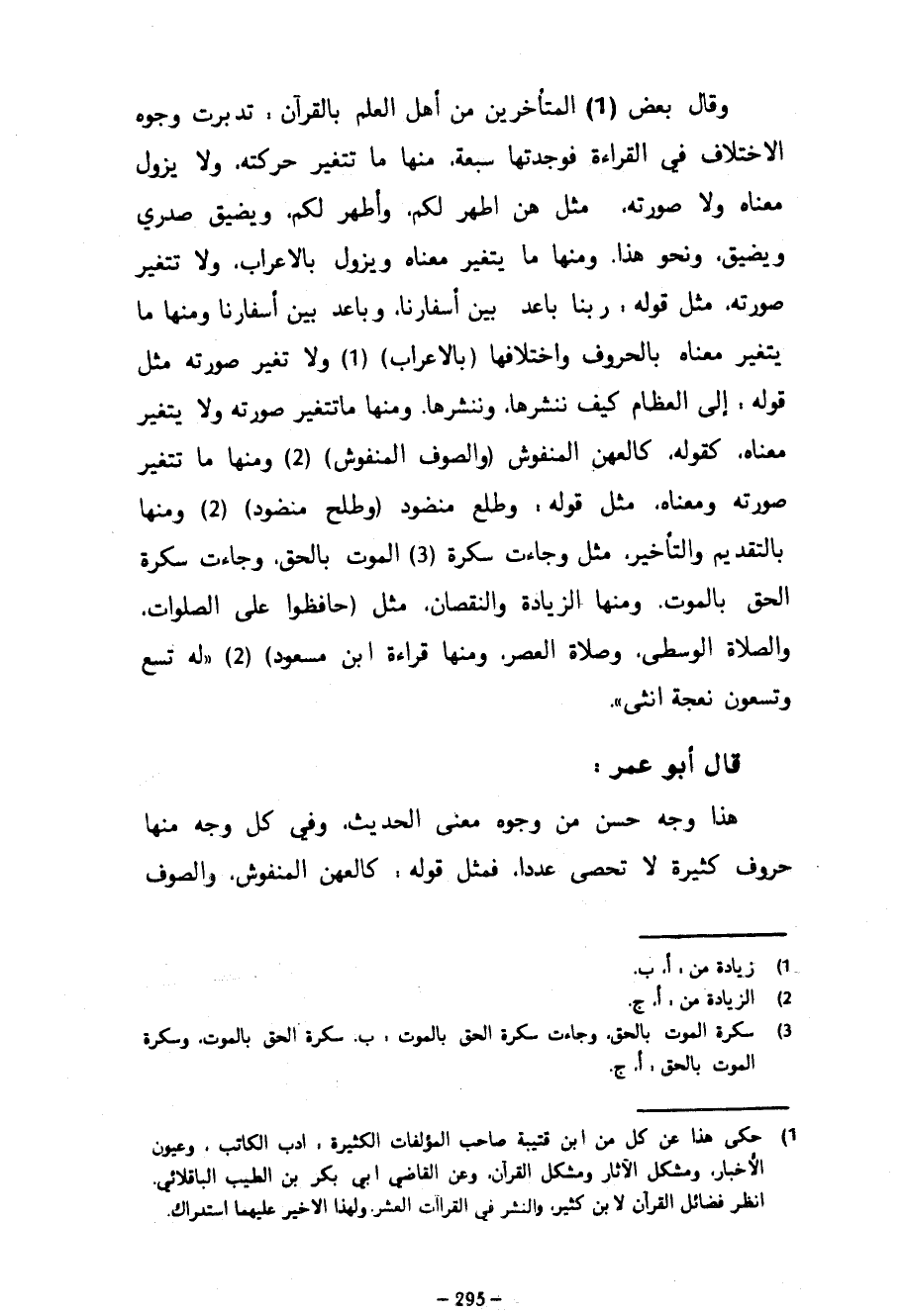 وَقَالَ بَعْضُ الْمُتَأَخِّرِينَ مِنْ أَهْلِ الْعِلْمِ بِالْقُرْآنِ تَدَبَّرْتُ وُجُوهَ الِاخْتِلَافِ فِي الْقِرَاءَةِ فَوَجَدْتُهَا سَبْعَةً مِنْهَا مَا تَتَغَيَّرُ حَرَكَتُهُ وَلَا يَزُولُ مَعْنَاهُ وَلَا صُورَتُهُ مِثْلُ هُنَّ أَطْهَرُ لَكُمْ وَأَطْهَرَ لَكُمْ وَيَضِيقُ صَدْرِي وَيَضِيقَ وَنَحْوُ هَذَا وَمِنْهَا مَا يَتَغَيَّرُ مَعْنَاهُ وَيَزُولُ بِالْإِعْرَابِ وَلَا تَتَغَيَّرُ صُورَتُهُ مِثْلُ قَوْلِهِ رَبَّنَا بَاعِدْ بَيْنَ أَسْفَارِنَا وَبَاعَدَ بَيْنَ أَسْفَارِنَا وَمِنْهَا مَا يَتَغَيَّرُ مَعْنَاهُ بالحروف واختلافها (بالأعراب) ولا تغير صورته مثل قوله إلى العظام كيف ننشرها! وَنَنْشُرُهَا وَمِنْهَا مَا تَتَغَيَّرُ صُورَتُهُ وَلَا يَتَغَيَّرُ مَعْنَاهُ كَقَوْلِهِ كَالْعِهْنِ الْمَنْفُوشِ (وَالصُّوفِ الْمَنْفُوشِ) وَمِنْهَا مَا تَتَغَيَّرُ صُورَتُهُ وَمَعْنَاهُ مِثْلُ قَوْلِهِ وَطَلْعٍ مَنْضُودٍ (وَطَلْحٍ مَنْضُودٍ) وَمِنْهَا بِالتَّقْدِيمِ وَالتَّأْخِيرِ مِثْلُ وَجَاءَتْ سَكْرَةُ الْمَوْتِ بِالْحَقِّ وَجَاءَتْ سَكْرَةُ الْحَقِّ بِالْمَوْتِ وَمِنْهَا الزِّيَادَةُ وَالنُّقْصَانُ مِثْلُ (حَافِظُوا عَلَى الصَّلَوَاتِ وَالصَّلَاةِ الْوُسْطَى وَصَلَاةِ الْعَصْرِ وَمِنْهَا قِرَاءَةُ ابْنِ مَسْعُودٍ) لَهُ تِسْعٌ وَتِسْعُونَ نَعْجَةً أُنْثَى - قَالَ أَبُو عُمَرَ هَذَا وَجْهٌ حَسَنٌ مِنْ وُجُوهِ مَعْنَى الْحَدِيثِ وَفِي كُلِّ وَجْهٍ مِنْهَا حُرُوفٌ كَثِيرَةٌ لَا تُحْصَى عَدَدًا فَمِثْلُ قَوْلِهِ كَالْعِهْنِ الْمَنْفُوشِ وَالصُّوفِ