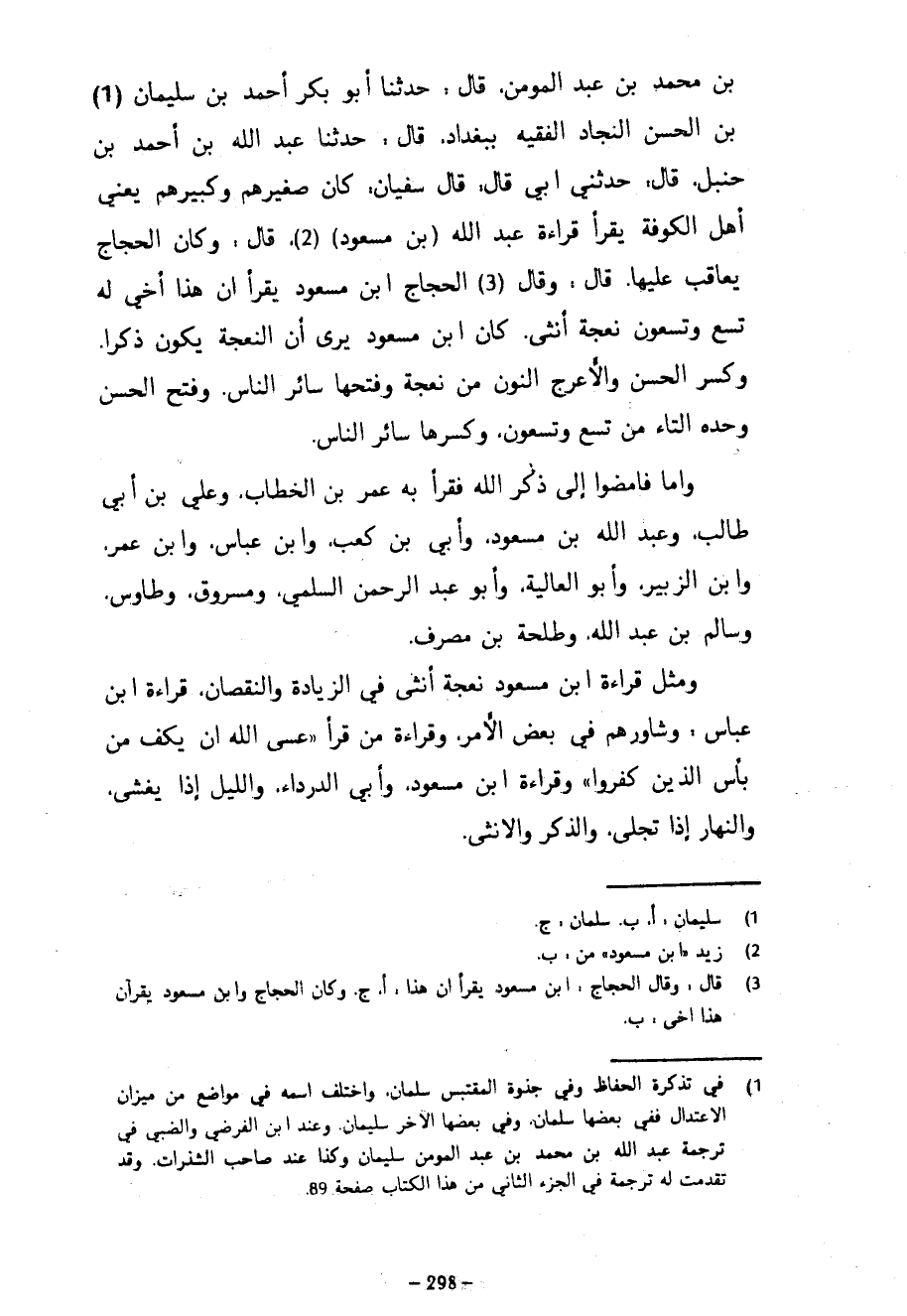ابن مُحَمَّدِ بْنِ عَبْدِ الْمُؤْمِنِ قَالَ حَدَّثَنَا أَبُو بَكْرٍ أَحْمَدُ بْنُ سُلَيْمَانَ بْنِ الْحَسَنِ النَّجَّادُ الْفَقِيهُ بِبَغْدَادَ قَالَ حَدَّثَنَا عَبْدُ اللَّهِ بْنُ أَحْمَدَ بْنِ حَنْبَلٍ قَالَ حَدَّثَنِي أَبِي قَالَ قَالَ سُفْيَانُ كَانَ صَغِيرُهُمْ وَكَبِيرُهُمْ يَعْنِي أَهْلَ الْكُوفَةِ يَقْرَأُ قِرَاءَةَ عَبْدِ اللَّهِ (بْنِ مَسْعُودٍ) قَالَ وَكَانَ الْحَجَّاجُ يُعَاقِبُ عَلَيْهَا قَالَ وَقَالَ الحجاج بن مَسْعُودٍ يَقْرَأُ إِنَّ هَذَا أَخِي لَهُ تِسْعٌ وَتِسْعُونَ نَعْجَةً أُنْثَى كَانَ ابْنُ مَسْعُودٍ يَرَى أَنَّ النَّعْجَةَ يَكُونُ ذَكَرًا وَكَسَرَ الْحَسَنُ وَالْأَعْرَجُ النُّونَ مِنْ نَعْجَةٍ وَفَتَحَهَا سَائِرُ النَّاسِ وَفَتَحَ الْحَسَنُ وَحْدَهُ التَّاءَ مِنْ تِسْعٍ وَتِسْعُونَ وَكَسَرَهَا سَائِرُ النَّاسِ وَأَمَّا فَامْضُوا إِلَى ذِكْرِ اللَّهِ فَقَرَأَ بِهِ عُمَرَ بْنِ الْخَطَّابِ وَعَلِيِّ بْنِ أَبِي طَالِبٍ وَعَبْدُ اللَّهِ بْنُ مَسْعُودٍ وَأُبَيُّ بْنُ كَعْبٍ وَابْنُ عَبَّاسٍ وَابْنُ عُمَرَ وَابْنُ الزُّبَيْرِ وَأَبُو الْعَالِيَةِ وَأَبُو عَبْدِ الرَّحْمَنِ السُّلَمِيُّ وَمَسْرُوقٌ وَطَاوُسٌ وَسَالِمُ بْنُ عَبْدِ اللَّهِ وَطَلْحَةُ بْنُ مُصَرِّفٍ وَمِثْلُ قِرَاءَةِ ابْنِ مَسْعُودٍ نَعْجَةً أُنْثَى فِي الزِّيَادَةِ وَالنُّقْصَانِ قِرَاءَةُ ابْنِ عَبَّاسٍ وَشَاوِرْهُمْ فِي بَعْضِ الْأَمْرِ وَقِرَاءَةُ مَنْ قَرَأَ عَسَى اللَّهُ أَنْ يَكُفَّ مِنْ بَأْسِ الَّذِينَ كَفَرُوا وَقِرَاءَةُ ابْنِ مَسْعُودٍ وَأَبِي الدَّرْدَاءِ وَاللَّيْلِ إِذَا يَغْشَى وَالنَّهَارِ إِذَا تَجَلَّى وَالذَّكَرِ وَالْأُنْثَى