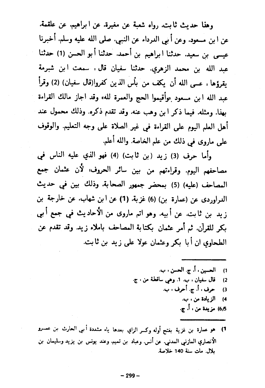 وَهَذَا حَدِيثٌ ثَابِتٌ رَوَاهُ شُعْبَةُ عَنْ مُغِيرَةَ عَنْ إِبْرَاهِيمَ عَنْ عَلْقَمَةَ عَنِ ابْنِ مَسْعُودٍ وَعَنْ أَبِي الدَّرْدَاءِ عَنِ النَّبِيِّ صَلَّى اللَّهُ عَلَيْهِ وَسَلَّمَ أَخْبَرَنَا عِيسَى بْنُ سَعِيدٍ حَدَّثَنَا إِبْرَاهِيمُ بْنُ أَحْمَدَ حَدَّثَنَا أَبُو الْحَسَنِ حَدَّثَنَا عَبْدُ اللَّهِ بْنُ مُحَمَّدٍ الزُّهْرِيُّ حَدَّثَنَا سُفْيَانُ قَالَ سَمِعْتُ ابْنَ شُبْرُمَةَ يَقْرَؤُهَا عَسَى اللَّهُ أَنْ يَكُفَّ مِنْ بَأْسِ الَّذِينَ كَفَرُوا (قَالَ سُفْيَانُ) وَقَرَأَ عَبْدُ اللَّهِ بْنُ مَسْعُودٍ وَأَقِيمُوا الْحَجَّ وَالْعُمْرَةَ لِلَّهِ وَقَدْ أَجَازَ مَالِكٌ الْقِرَاءَةَ بِهَذَا وَمِثْلِهِ فِيمَا ذَكَرَ ابْنُ وَهْبٍ عَنْهُ وَقَدْ تَقَدَّمَ ذِكْرُهُ وَذَلِكَ مَحْمُولٌ عِنْدَ أَهْلِ الْعِلْمِ الْيَوْمَ عَلَى الْقِرَاءَةِ فِي غَيْرِ الصَّلَاةِ عَلَى وَجْهِ التَّعْلِيمِ وَالْوُقُوفِ عَلَى مَا رُوِيَ فِي ذَلِكَ مِنْ عِلْمِ الْخَاصَّةِ وَاللَّهُ أَعْلَمُ وَأَمَّا حَرْفُ زَيْدِ (بْنِ ثَابِتٍ) فَهُوَ الَّذِي عَلَيْهِ النَّاسُ فِي مَصَاحِفِهِمُ الْيَوْمَ وَقِرَاءَتِهِمْ مِنْ بَيْنِ سَائِرِ الْحُرُوفِ لِأَنَّ عُثْمَانَ جَمَعَ الْمَصَاحِفَ (عَلَيْهِ) بِمَحْضَرِ جُمْهُورِ الصَّحَابَةِ وَذَلِكَ بَيِّنٌ فِي حديث الدراوردي عن (عمارة بن) غزبة عَنِ ابْنِ شِهَابٍ عَنْ خَارِجَةَ بْنِ زَيْدِ بْنِ ثَابِتٍ عَنْ أَبِيهِ وَهُوَ أَتَمُّ مَا رُوِيَ مِنَ الْأَحَادِيثِ فِي جَمْعِ أَبِي بَكْرٍ لِلْقُرْآنِ ثُمَّ أَمَرَ عُثْمَانُ بِكِتَابَةِ الْمَصَاحِفِ بِإِمْلَاءِ زَيْدٍ وَقَدْ تَقَدَّمَ عَنِ الطَّحَاوِيِّ أَنَّ أَبَا بَكْرٍ وَعُثْمَانَ عَوَّلَا عَلَى زَيْدِ بْنِ ثَابِتٍ