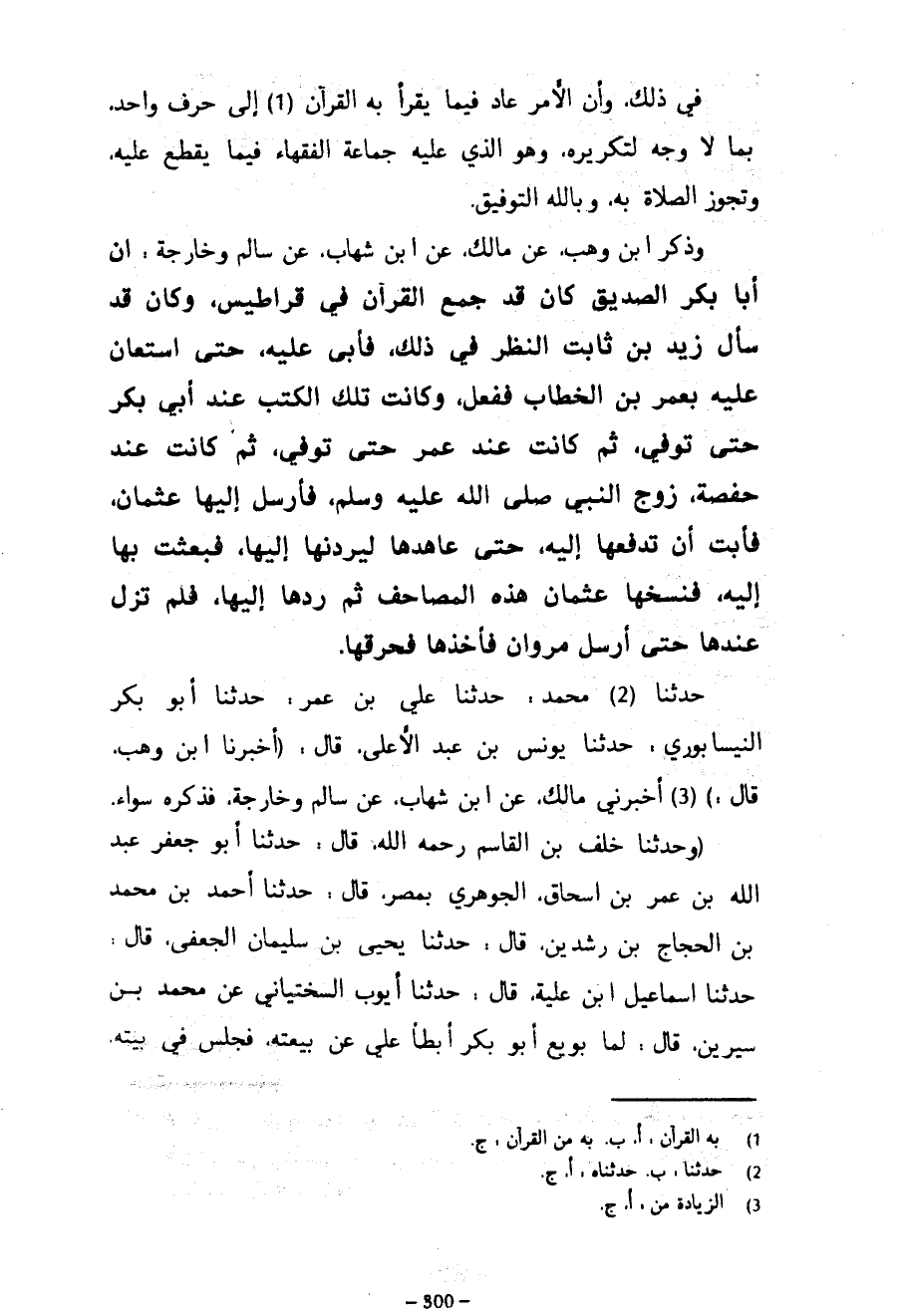 فِي ذَلِكَ وَأَنَّ الْأَمْرَ عَادَ فِيمَا يُقْرَأُ بِهِ الْقُرْآنَ إِلَى حَرْفٍ وَاحِدٍ بِمَا لَا وَجْهَ لِتَكْرِيرِهِ وَهُوَ الَّذِي عَلَيْهِ جَمَاعَةُ الْفُقَهَاءِ فِيمَا يُقْطَعُ عَلَيْهِ وَتَجُوزُ الصَّلَاةُ بِهِ وَبِاللَّهِ التَّوْفِيقُ وَذَكَرَ ابْنُ وَهْبٍ عَنْ مَالِكٍ عَنِ ابْنِ شِهَابٍ عَنْ سَالِمٍ وَخَارِجَةَ أَنَّ أَبَا بَكْرٍ الصِّدِّيقَ كَانَ قَدْ جَمَعَ الْقُرْآنَ فِي قَرَاطِيسَ وَكَانَ قَدْ سَأَلَ زَيْدَ بْنَ ثَابِتٍ النَّظَرَ فِي ذَلِكَ فَأَبَى عَلَيْهِ حَتَّى اسْتَعَانَ عَلَيْهِ بِعُمَرَ بْنِ الْخَطَّابِ فَفَعَلَ وَكَانَتْ تِلْكَ الْكُتُبُ عِنْدَ أَبِي بَكْرٍ حَتَّى تُوُفِّيَ ثُمَّ كَانَتْ عِنْدَ عُمَرَ حَتَّى تُوُفِّيَ ثُمَّ كَانَتْ عِنْدَ حَفْصَةُ زَوْجُ النَّبِيِّ صَلَّى اللَّهُ عَلَيْهِ وَسَلَّمَ فَأَرْسَلَ إِلَيْهَا عُثْمَانُ فَأَبَتْ أَنْ تَدْفَعَهَا إِلَيْهِ حَتَّى عَاهَدَهَا لَيَرُدَّنَّهَا إِلَيْهَا فَبَعَثَتْ بِهَا إِلَيْهِ فَنَسَخَهَا عُثْمَانُ هَذِهِ الْمَصَاحِفَ ثُمَّ رَدَّهَا إِلَيْهَا فَلَمْ تَزَلْ عِنْدَهَا حَتَّى أَرْسَلَ مَرْوَانُ فَأَخَذَهَا فَحَرَقَهَا حَدَّثَنَا مُحَمَّدٌ حَدَّثَنَا عَلِيُّ بْنُ عُمَرَ حَدَّثَنَا أَبُو بَكْرٍ النَّيْسَابُورِيُّ حَدَّثَنَا يُونُسُ بْنُ عَبْدِ الْأَعْلَى قَالَ (أَخْبَرَنَا ابْنُ وَهْبٍ قَالَ) أَخْبَرَنِي مَالِكٌ عَنِ ابْنِ شِهَابٍ عَنْ سَالِمٍ وَخَارِجَةَ فَذَكَرَهُ سَوَاءً (وَحَدَّثَنَا خَلَفُ بْنُ الْقَاسِمِ رَحِمَهُ اللَّهُ قَالَ حَدَّثَنَا أَبُو جَعْفَرٍ عَبْدُ اللَّهِ بْنُ عُمَرَ بْنِ إِسْحَاقَ الْجَوْهَرِيُّ بمصر قَالَ حَدَّثَنَا أَحْمَدُ بْنُ مُحَمَّدِ بْنِ الْحَجَّاجِ بْنِ رِشْدِينَ قَالَ حَدَّثَنَا يَحْيَى بْنُ سُلَيْمَانَ الجعفي قال حدثنا إسماعيل ابن عُلَيَّةَ قَالَ حَدَّثَنَا أَيُّوبُ السَّخْتِيَانِيُّ عَنْ مُحَمَّدِ بْنِ سِيرِينَ قَالَ لَمَّا بُويِعَ أَبُو بَكْرٍ أبطأ علي عن بيعته فجلس في بيته