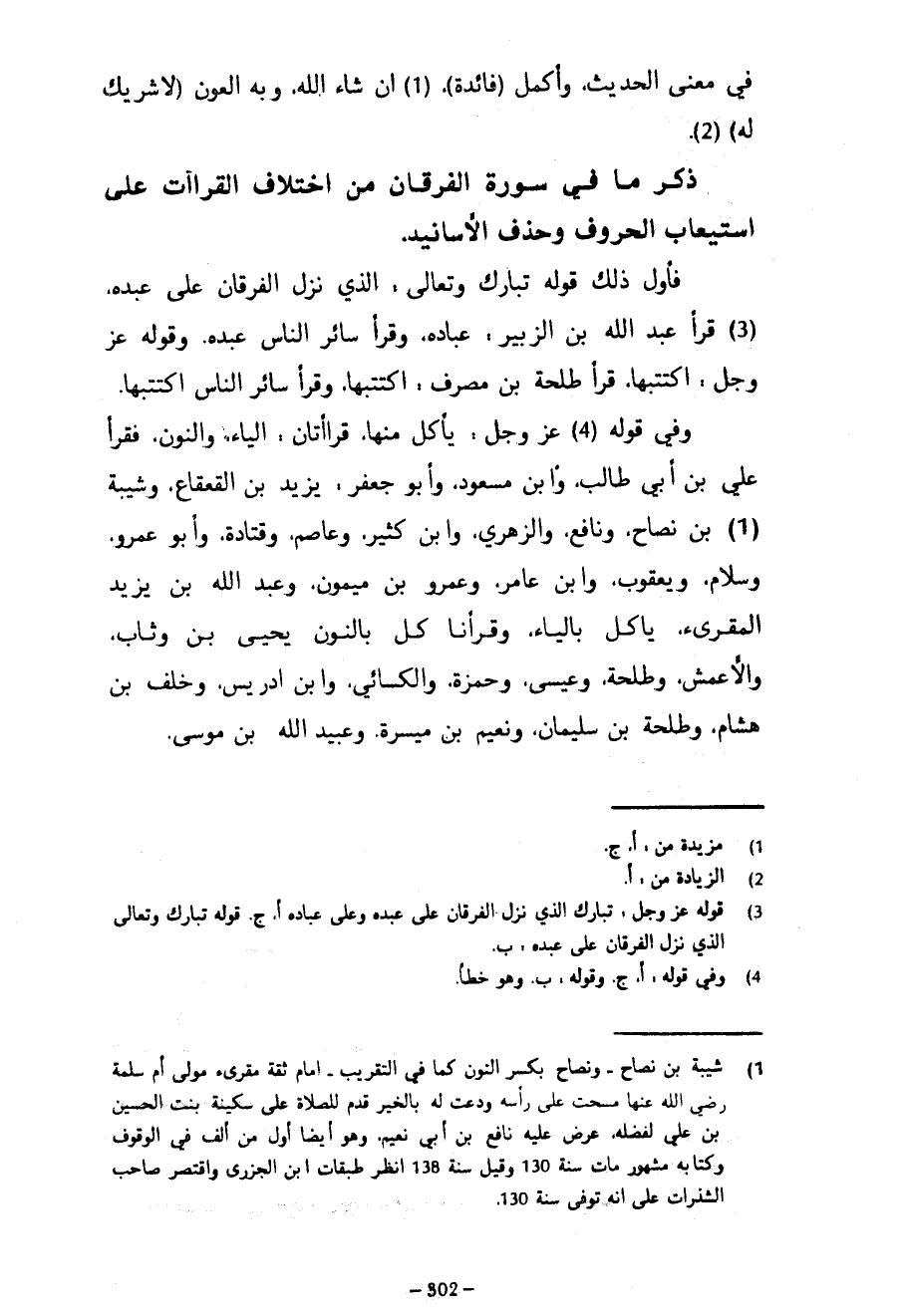 فِي مَعْنَى الْحَدِيثِ وَأَكْمَلَ (فَائِدَةً) إِنْ شَاءَ اللَّهُ وَبِهِ الْعَوْنُ (لَا شَرِيكَ لَهُ) ذِكْرُ ما في سورة الفرقان من اختلاف القراآت عَلَى اسْتِيعَابِ الْحُرُوفِ وَحَذْفِ الْأَسَانِيدِ فَأَوَّلُ ذَلِكَ قَوْلُهُ تَبَارَكَ وَتَعَالَى الَّذِي نَزَّلَ الْفُرْقَانَ عَلَى عَبْدِهِ قَرَأَ عَبْدُ اللَّهِ بْنُ الزُّبَيْرِ عِبَادِهِ وَقَرَأَ سَائِرُ النَّاسِ عَبْدِهِ وَقَوْلُهُ عَزَّ وَجَلَّ اكْتَتَبَهَا قَرَأَ طَلْحَةُ بْنُ مُصَرِّفٍ اكْتُتِبَهَا وَقَرَأَ سَائِرُ النَّاسِ اكْتَتَبَهَا وَفِي قَوْلِهِ عَزَّ وَجَلَّ يأكل منها قرآتان الْيَاءُ وَالنُّونُ فَقَرَأَ عَلِيُّ بْنُ أَبِي طَالِبٍ وَابْنُ مَسْعُودٍ وَأَبُو جَعْفَرٍ يَزِيدُ بْنُ الْقَعْقَاعِ وَشَيْبَةُ بْنُ نَصَّاحٍ وَنَافِعٌ وَالزُّهْرِيُّ وَابْنُ كَثِيرٍ وَعَاصِمٌ وَقَتَادَةُ وَأَبُو عَمْرٍو وَسَلَّامٌ وَيَعْقُوبُ وَابْنُ عَامِرٍ وَعَمْرُو بْنُ مَيْمُونٍ وَعَبْدُ اللَّهِ بْنُ يزيد المقرىء يَأْكُلُ بِالْيَاءِ وَقَرَأَ نَأْكُلُ بِالنُّونِ يَحْيَى بْنُ وَثَّابٍ وَالْأَعْمَشُ وَطَلْحَةُ وَعِيسَى وَحَمْزَةُ وَالْكِسَائِيُّ وَابْنُ إدريس وخلف بن هشام وطلحة بن سلميان وَنُعَيْمُ بْنُ مَيْسَرَةَ وَعُبَيْدُ اللَّهِ بْنُ مُوسَى