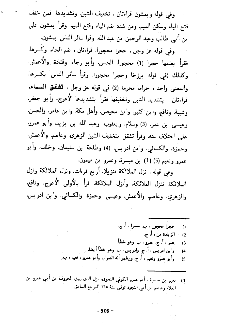 وَفِي قَوْلِهِ وَيَمْشُونَ قِرَاءَتَانِ تَخْفِيفُ الشِّينِ وَتَشْدِيدُهَا فَمَنْ خَفَّفَ فَتَحَ الْيَاءَ وَسَكَّنَ الْمِيمَ وَمَنْ شَدَّدَ ضَمَّ الْيَاءَ وَفَتَحَ الْمِيمَ وَقَرَأَ يُمَشُّونَ عَلِيُّ بْنُ أَبِي طَالِبٍ وَعَبْدُ الرَّحْمَنِ بْنُ عَبْدِ اللَّهِ وَقَرَأَ سَائِرُ النَّاسِ يَمْشُونَ وَفِي قَوْلِهِ عَزَّ وَجَلَّ حِجْرًا مَحْجُورًا قِرَاءَتَانِ ضَمُّ الْحَاءِ وَكَسْرِهَا فَقَرَأَ بِضَمِّهَا حُجْرًا مَحْجُورًا الْحَسَنُ وَأَبُو رَجَاءٍ وَقَتَادَةُ وَالْأَعْمَشُ وَكَذَلِكَ (فِي قَوْلِهِ بَرْزَخًا وَحِجْرًا مَحْجُورًا وَقَرَأَ سَائِرُ النَّاسِ بِكَسْرِهَا وَالْمَعْنَى وَاحِدٌ حَرَامًا مُحَرَّمًا (2) فِي قَوْلِهِ عَزَّ وَجَلَّ تَشَقَّقُ السَّمَاءُ قِرَاءَتَانِ بِتَشْدِيدِ الشِّينِ وَتَخْفِيفِهَا فَقَرَأَ بِتَشْدِيدِهَا الْأَعْرَجُ وَأَبُو جَعْفَرٍ وَشَيْبَةُ وَنَافِعٌ وَابْنُ كَثِيرٍ وَابْنُ مُحَيْصِنٍ وَأَهْلُ مَكَّةَ وَابْنُ عَامِرٍ وَالْحَسَنُ وَعِيسَى بْنُ عُمَرَ وَسَلَّامٌ وَيَعْقُوبُ وَعَبْدُ اللَّهِ بْنُ يَزِيدَ وَأَبُو عُمَرَ عَلَى اخْتِلَافٍ عَنْهُ وَقَرَأَ تَشَقَّقُ بِتَخْفِيفِ الشِّينِ الزُّهْرِيُّ وَعَاصِمٌ وَالْأَعْمَشُ وَحَمْزَةُ وَالْكِسَائِيُّ وَابْنُ إِدْرِيسَ وَطَلْحَةُ بْنُ سُلَيْمَانَ وَخَلَفٌ وَأَبُو عَمْرٍو وَنُعَيْمُ بْنُ مَيْسَرَةَ وَعَمْرُو بْنُ مَيْمُونٍ وَفِي قَوْلِهِ وَنُزِّلَ الملائكة تنزيلا أربع قراءات ونزل الملائكة ونزل الملائكة ننزل الملائكة وأنزل الْمَلَائِكَةَ قَرَأَ بِالْأُولَى الْأَعْرَجُ وَنَافِعٌ وَالزُّهْرِيُّ وَعَاصِمٌ وَالْأَعْمَشُ وَعِيسَى وَحَمْزَةُ وَالْكِسَائِيُّ وَابْنُ إِدْرِيسَ