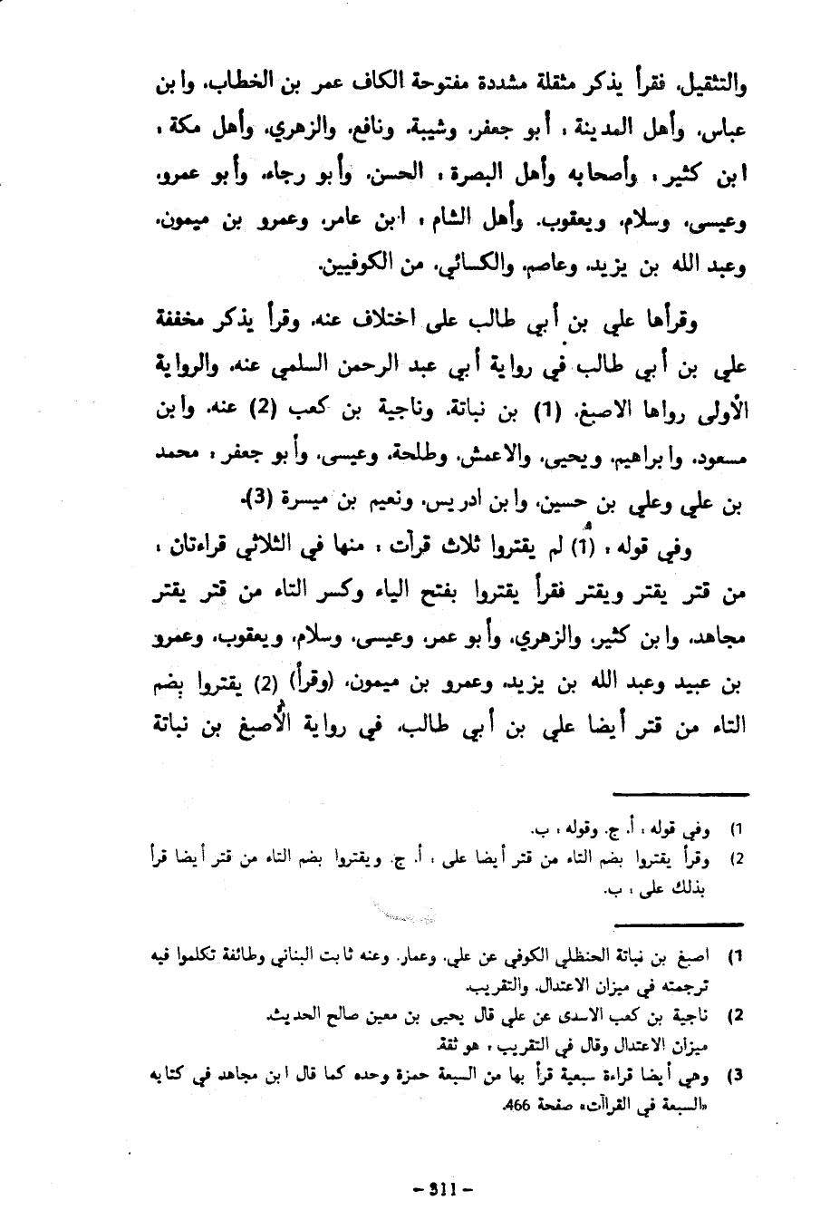 وَالتَّثْقِيلُ فَقَرَأَ يَذَّكَّرَ مُثَقَّلَةً مُشَدَّدَةً مَفْتُوحَةَ الْكَافِ عُمَرُ بْنُ الْخَطَّابِ وَابْنُ عَبَّاسٍ وَأَهْلُ الْمَدِينَةِ أَبُو جَعْفَرٍ وَشَيْبَةُ وَنَافِعٌ وَالزُّهْرِيُّ وَأَهْلُ مَكَّةَ ابْنُ كَثِيرٍ وَأَصْحَابُهُ وَأَهْلُ الْبَصْرَةِ الْحَسَنُ وَأَبُو رَجَاءٍ وَأَبُو عَمْرٍو وَعِيسَى وَسَلَّامٌ وَيَعْقُوبُ وَأَهْلُ الشَّامِ ابْنُ عَامِرٍ وَعَمْرُو بْنُ مَيْمُونٍ وَعَبْدُ اللَّهِ بْنُ يَزِيدَ وَعَاصِمٌ وَالْكِسَائِيُّ مِنَ الْكُوفِيِّينَ وَقَرَأَهَا عَلِيُّ بْنُ أَبِي طَالِبٍ عَلَى اخْتِلَافٍ عَنْهُ وَقَرَأَ يَذْكُرَ مُخَفَّفَةً عَلِيُّ بْنُ أَبِي طَالِبٍ فِي رِوَايَةِ أَبِي عَبْدِ الرَّحْمَنِ السُّلَمِيِّ عَنْهُ وَالرِّوَايَةُ الْأُولَى رَوَاهَا الْأَصْبَغُ بْنُ نُبَاتَةَ وَنَاجِيَةُ بْنُ كَعْبٍ عَنْهُ وَابْنُ مَسْعُودٍ وَإِبْرَاهِيمُ وَيَحْيَى وَالْأَعْمَشُ وَطَلْحَةُ وَعِيسَى وَأَبُو جَعْفَرٍ مُحَمَّدُ بْنُ عَلِيٍّ وَعَلِيُّ بْنُ حُسَيْنٍ وَابْنُ إِدْرِيسَ ونعيم بن ميسرة وفي قوله لم يقتروا ثلاث قرآت مِنْهَا فِي الثُّلَاثِيِّ قِرَاءَتَانِ مِنْ قَتَرَ يَقْتِرُ وَيَقْتُرُ فَقَرَأَ يَقْتِرُوا بِفَتْحِ الْيَاءِ وَكَسْرِ التَّاءِ مِنْ قَتَرَ يَقْتِرُ مُجَاهِدٌ وَابْنُ كَثِيرٍ وَالزُّهْرِيُّ وَأَبُو عُمَرَ وَعِيسَى وَسَلَّامٌ وَيَعْقُوبُ وَعَمْرُو بْنُ عُبَيْدٍ وَعَبَدُ اللَّهَ بْنُ يَزِيدَ وَعَمْرُو بْنُ مَيْمُونٍ (وَقَرَأَ) يَقْتُرُوا بِضَمِّ التَّاءِ مِنْ قَتَرَ أَيْضًا عَلِيُّ بْنُ أَبِي طَالِبٍ فِي رِوَايَةِ الْأَصْبَغِ بْنِ نُبَاتَةَ