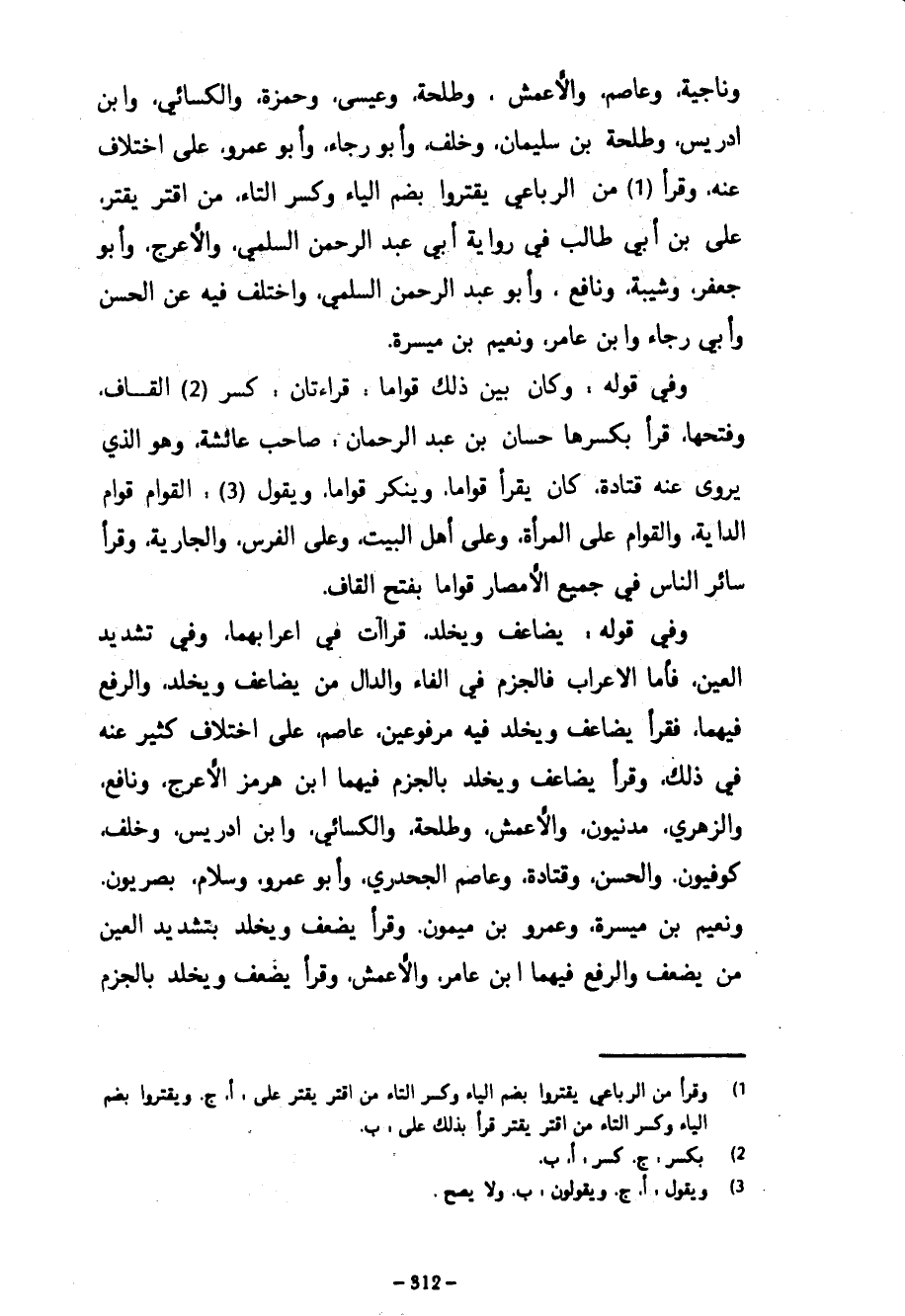 وَنَاجِيَةُ وَعَاصِمٌ وَالْأَعْمَشُ وَطَلْحَةُ وَعِيسَى وَحَمْزَةُ وَالْكِسَائِيُّ وَابْنُ إِدْرِيسَ وَطَلْحَةُ بْنُ سُلَيْمَانَ وَخَلَفٌ وَأَبُو رَجَاءٍ وَأَبُو عَمْرٍو عَلَى اخْتِلَافٍ عَنْهُ وَقَرَأَ مِنَ الرُّبَاعِيِّ يُقْتِرُوا بِضَمِّ الْيَاءِ وَكَسْرِ التَّاءِ مِنْ أَقْتَرَ يُقْتِرُ عَلِيُّ بْنُ أَبِي طَالِبٍ فِي رِوَايَةِ أَبِي عَبْدِ الرَّحْمَنِ السُّلَمِيِّ وَالْأَعْرَجُ وَأَبُو جَعْفَرٍ وَشَيْبَةُ وَنَافِعٌ وَأَبُو عَبْدِ الرَّحْمَنِ السُّلَمِيُّ وَاخْتُلِفَ فِيهِ عَنِ الْحَسَنِ وَأَبِي رَجَاءٍ وبن عَامِرٍ وَنُعَيْمِ بْنِ مَيْسَرَةَ وَفِي قَوْلِهِ وَكَانَ بَيْنَ ذَلِكَ قَوَامًا قِرَاءَتَانِ كَسْرُ الْقَافِ وَفَتْحُهَا قَرَأَ بِكَسْرِهَا حَسَّانُ بْنُ عَبْدِ الرَّحْمَنِ صَاحِبُ عَائِشَةَ وَهُوَ الَّذِي يَرْوِي عَنْهُ قَتَادَةُ كَانَ يَقْرَأُ قِوَامًا وَيُنْكِرُ قَوَامًا وَيَقُولُ الْقَوَامُ قَوَامُ الدَّابَّةِ وَالْقِوَامُ عَلَى الْمَرْأَةِ وَعَلَى أَهْلِ الْبَيْتِ وَعَلَى الْفَرَسِ وَالْجَارِيَةِ وَقَرَأَ سَائِرُ النَّاسِ فِي جَمِيعِ الْأَمْصَارِ قَوَامًا بِفَتْحِ الْقَافِ وَفِي قَوْلِهِ يضاعف ويخلد قراآت فِي إِعْرَابِهِمَا وَفِي تَشْدِيدِ الْعَيْنِ فَأَمَّا الْإِعْرَابُ فَالْجَزْمُ فِي الْفَاءِ وَالدَّالِ مِنْ يُضَاعِفْ وَيَخْلُدْ وَالرَّفْعُ فِيهِمَا فَقَرَأَ يُضَاعَفُ وَيَخْلُدُ فِيهِ مَرْفُوعَيْنِ عَاصِمٌ عَلَى اخْتِلَافٍ كَثِيرٍ عَنْهُ فِي ذَلِكَ وقرأ يُضَاعَفْ وَيَخْلُدْ بِالْجَزْمِ فِيهِمَا ابْنُ هُرْمُزَ الْأَعْرَجُ وَنَافِعٌ وَالزُّهْرِيُّ مَدَنِيُّونَ وَالْأَعْمَشُ وَطَلْحَةُ وَالْكِسَائِيُّ وَابْنُ إِدْرِيسَ وَخَلَفٌ كُوفِيُّونَ وَالْحَسَنُ وَقَتَادَةُ وَعَاصِمٌ الْجَحْدَرَيُّ وَأَبُو عَمْرٍو وَسَلَّامٌ بَصْرِيُّونَ وَنَعِيمُ بْنُ مَيْسَرَةَ وَعَمْرُو بْنُ مَيْمُونَ وَقَرَأَ يُضَعَّفُ وَيُخَلَّدُ بِتَشْدِيدِ الْعَيْنِ مِنْ يُضَعَّفُ وَالرَّفْعِ فِيهِمَا ابْنُ عَامِرٍ وَالْأَعْمَشُ وَقَرَأَ يُضَعَّفْ وَيُخَلَّدْ بِالْجَزْمِ
