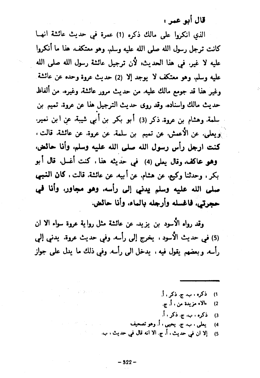 - قَالَ أَبُو عُمَرَ الَّذِي أَنْكَرُوا عَلَى مَالِكٍ ذِكْرَهُ عَمْرَةَ فِي حَدِيثِ عَائِشَةَ أَنَّهَا كَانَتْ تُرَجِّلُ رَسُولَ اللَّهِ صَلَّى اللَّهُ عَلَيْهِ وَسَلَّمَ وَهُوَ مُعْتَكِفٌ هَذَا مَا أَنْكَرُوا عَلَيْهِ لَا غَيْرَ فِي هَذَا الْحَدِيثِ لِأَنَّ تَرْجِيلَ عَائِشَةَ رَسُولَ اللَّهِ صَلَّى اللَّهُ عَلَيْهِ وَسَلَّمَ وهو مُعْتَكِفٌ لَا يُوجَدُ إِلَّا حَدِيثُ عُرْوَةَ وَحْدَهُ عَنْ عَائِشَةَ وَغَيْرُ هَذَا قَدْ جُومِعَ مَالِكٌ عَلَيْهِ مِنْ حَدِيثِ مُرُورِ عَائِشَةَ وَغَيْرِهِ مِنْ أَلْفَاظِ حَدِيثِ مَالِكٍ وَإِسْنَادِهِ وَقَدْ رَوَى حَدِيثَ التَّرْجِيلِ هَذَا عَنْ عُرْوَةَ تَمِيمُ بْنُ سَلَمَةَ وَهِشَامُ بْنُ عُرْوَةَ ذَكَرَ أَبُو بَكْرِ بْنُ أَبِي شَيْبَةَ عَنِ ابْنِ نُمَيْرٍ وَيَعْلَى عَنِ الْأَعْمَشِ عَنْ تَمِيمِ بْنِ سَلَمَةَ عَنْ عُرْوَةَ عَنْ عَائِشَةَ قَالَتْ كُنْتُ أُرَجِّلُ رَأْسَ رَسُولُ اللَّهِ صَلَّى اللَّهُ عَلَيْهِ وَسَلَّمَ وَأَنَا حَائِضٌ وَهُوَ عَاكِفٌ وَقَالَ يَعْلَى فِي حَدِيثِهِ هَذَا كُنْتُ أَغْسِلُ قَالَ أَبُو بَكْرٍ وَحَدَّثَنَا وَكِيعٌ عَنْ هِشَامٍ عَنْ أَبِيهِ عَنْ عَائِشَةَ قَالَتْ كَانَ النَّبِيُّ صَلَّى اللَّهُ عَلَيْهِ وَسَلَّمَ يُدْنِي إِلَيَّ رَأْسَهُ وَهُوَ مُجَاوِرٌ وَأَنَا فِي حُجْرَتِي فَأَغْسِلُهُ وَأُرَجِّلُهُ بِالْمَاءِ وَأَنَا حَائِضٌ وَقَدْ رَوَاهُ الْأَسْوَدُ بْنُ يَزِيدَ عَنْ عَائِشَةَ مِثْلَ رِوَايَةِ عُرْوَةَ سَوَاءً إِلَّا أَنَّ فِي حَدِيثِ الْأَسْوَدِ يُخْرِجُ إِلَيَّ رَأْسَهُ وَفِي حَدِيثِ عُرْوَةَ يُدْنِي إِلَيَّ رَأْسَهُ وَبَعْضُهُمْ يَقُولُ فِيهِ يُدْخِلُ إِلَيَّ رَأْسَهُ وَفِي ذَلِكَ مَا يَدُلُّ عَلَى جَوَازِ