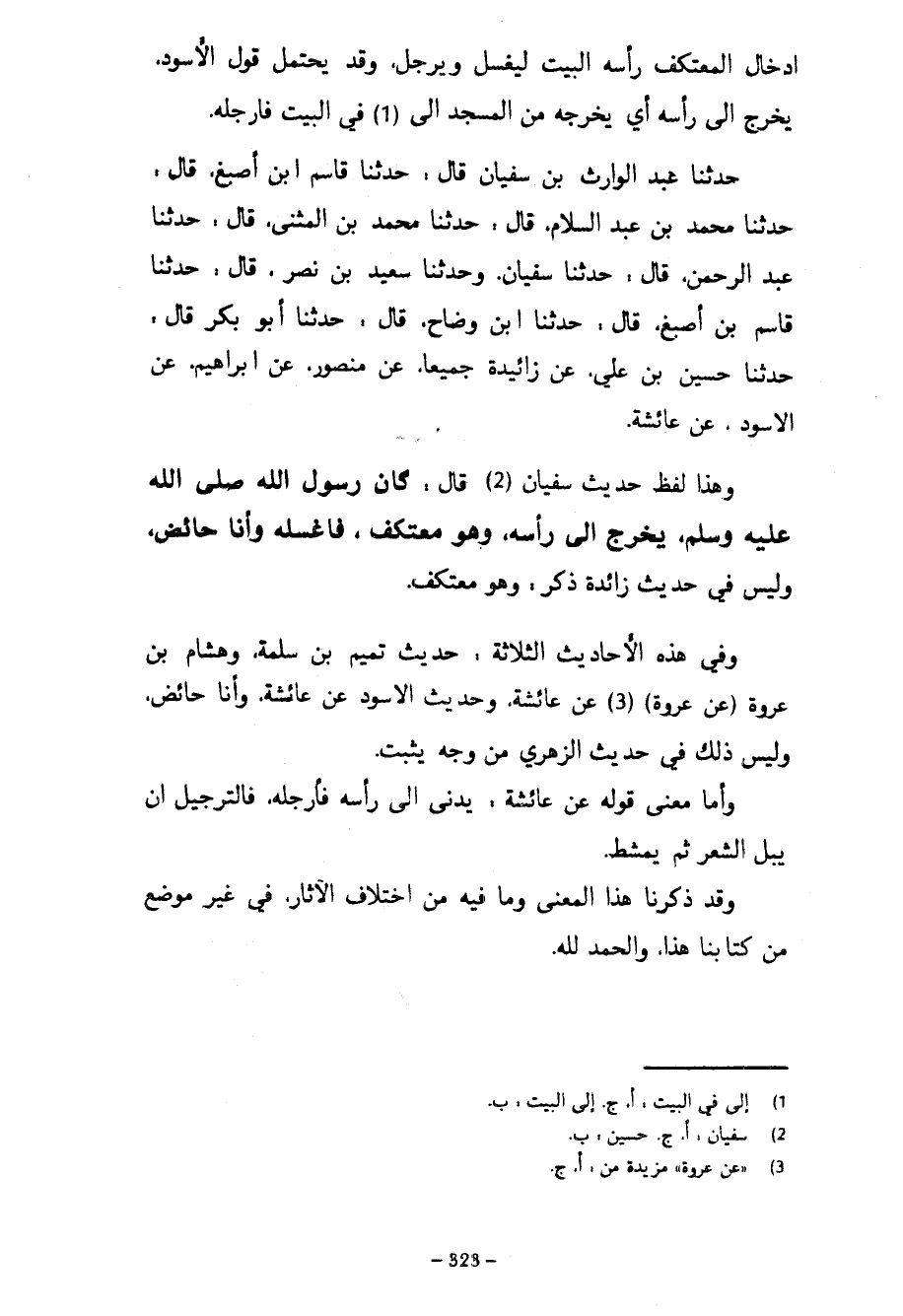 إِدْخَالِ الْمُعْتَكِفِ رَأْسَهُ الْبَيْتَ لِيُغْسَلَ وَيُرَجَّلَ وَقَدْ يُحْتَمَلُ قَوْلُ الْأَسْوَدِ يُخْرِجُ إِلَيَّ رَأْسَهُ أَيْ يُخْرِجُهُ مِنَ الْمَسْجِدِ إِلَيَّ فِي الْبَيْتِ فَأُرَجِّلُهُ حَدَّثَنَا عَبْدُ الْوَارِثِ بْنُ سُفْيَانَ قَالَ حَدَّثَنَا قَاسِمُ بْنُ أَصْبَغَ قَالَ حَدَّثَنَا مُحَمَّدُ بْنُ عَبْدِ السَّلَامِ قَالَ حَدَّثَنَا مُحَمَّدُ بْنُ الْمُثَنَّى قَالَ حَدَّثَنَا عَبْدُ الرَّحْمَنِ قَالَ حَدَّثَنَا سُفْيَانُ وَحَدَّثَنَا سَعِيدُ بْنُ نَصْرٍ قَالَ حَدَّثَنَا قَاسِمُ بْنُ أَصْبَغَ قَالَ حَدَّثَنَا ابْنُ وَضَّاحٍ قَالَ حَدَّثَنَا أَبُو بَكْرٍ قَالَ حَدَّثَنَا حُسَيْنُ بْنُ عَلِيٍّ عَنْ زَائِدَةَ جَمِيعًا عَنْ مَنْصُورٍ عَنْ إِبْرَاهِيمَ عَنِ الْأَسْوَدِ عَنْ عَائِشَةَ وَهَذَا لَفْظُ حَدِيثِ سُفْيَانَ قَالَ كَانَ رَسُولُ اللَّهِ صَلَّى اللَّهُ عَلَيْهِ وَسَلَّمَ يُخْرِجُ إِلَيَّ رَأْسَهُ وَهُوَ مُعْتَكِفٌ فَأَغْسِلُهُ وَأَنَا حَائِضٌ وَلَيْسَ فِي حَدِيثِ زَائِدَةَ ذِكْرُ وَهُوَ مُعْتَكِفٌ وَفِي هَذِهِ الْأَحَادِيثِ الثَّلَاثَةِ حَدِيثُ تَمِيمِ بْنِ سَلَمَةَ وَهِشَامِ بْنِ عُرْوَةَ (عَنْ عُرْوَةَ) عَنْ عَائِشَةَ وَحَدِيثُ الْأَسْوَدِ عَنْ عَائِشَةَ وَأَنَا حَائِضٌ وَلَيْسَ ذَلِكَ فِي حَدِيثِ الزُّهْرِيِّ مِنْ وَجْهٍ يَثْبُتُ وَأَمَّا مَعْنَى قَوْلِهِ عَنْ عَائِشَةَ يُدْنِي إِلَيَّ رَأْسَهُ فَأُرَجِّلُهُ فَالتَّرْجِيلُ أَنَّ يُبَلَّ الشَّعْرُ ثُمَّ يُمَشَّطُ وَقَدْ ذَكَرْنَا هَذَا الْمَعْنَى وَمَا فِيهِ مِنِ اخْتِلَافِ الْآثَارِ فِي غَيْرِ مَوْضِعٍ مِنْ كِتَابِنَا هَذَا وَالْحَمْدُ لله