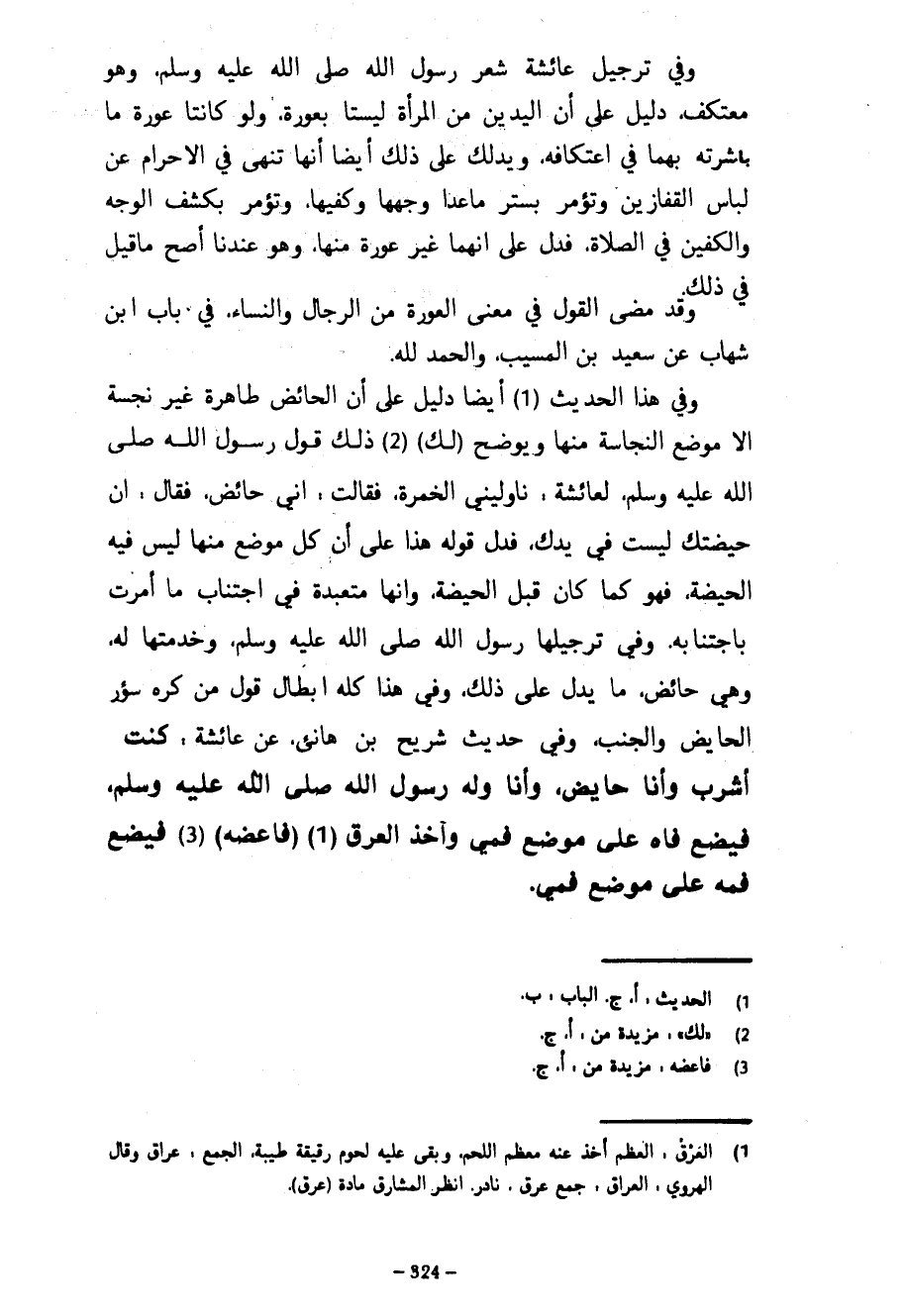 وَفِي تَرْجِيلِ عَائِشَةَ شَعْرُ رَسُولِ اللَّهِ صَلَّى اللَّهُ عَلَيْهِ وَسَلَّمَ وَهُوَ مُعْتَكِفٌ دَلِيلٌ عَلَى أَنَّ الْيَدَيْنِ مِنَ الْمَرْأَةِ لَيْسَتَا بِعَوْرَةٍ وَلَوْ كَانَتَا عَوْرَةً مَا بَاشَرَتْهُ بِهِمَا فِي اعْتِكَافِهِ وَيَدُلُّكَ عَلَى ذَلِكَ أَيْضًا أَنَّهَا تَنْهَى فِي الْإِحْرَامِ عَنْ لِبَاسِ الْقُفَّازَيْنِ وَتُؤْمَرُ بِسَتْرِ مَا عَدَا وَجْهَهَا وَكَفَّيْهَا وَتُؤْمَرُ بِكَشْفِ الْوَجْهِ وَالْكَفَّيْنِ فِي الصَّلَاةِ فَدَلَّ عَلَى أَنَّهُمَا غَيْرُ عَوْرَةٍ مِنْهَا وَهُوَ عِنْدَنَا أَصَحُّ مَا قِيلَ فِي ذَلِكَ وَقَدْ مَضَى الْقَوْلُ فِي مَعْنَى الْعَوْرَةِ مِنَ الرِّجَالِ وَالنِّسَاءِ فِي بَابِ ابْنِ شِهَابٍ عَنْ سَعِيدِ بْنِ الْمُسَيَّبِ وَالْحَمْدُ لِلَّهِ وَفِي هَذَا الْحَدِيثِ أَيْضًا دَلِيلٌ عَلَى أَنَّ الْحَائِضَ طَاهِرَةٌ غَيْرُ نَجِسَةٍ إِلَّا مَوْضِعَ النَّجَاسَةِ مِنْهَا وَيُوَضِّحُ (لَكَ) ذَلِكَ قَوْلُ رَسُولِ اللَّهِ صَلَّى اللَّهُ عَلَيْهِ وَسَلَّمَ لِعَائِشَةَ نَاوِلِينِي الْخُمْرَةَ فَقَالَتْ إِنِّي حَائِضٌ فَقَالَ إِنَّ حَيْضَتَكِ لَيْسَتْ فِي يَدِكِ فَدَلَّ قَوْلُهُ هَذَا عَلَى أَنَّ كُلَّ مَوْضِعٍ مِنْهَا لَيْسَ فِيهِ الْحَيْضَةُ فَهُوَ كَمَا كَانَ قَبْلَ الْحَيْضَةِ وَأَنَّهَا مُتَعَبِّدَةٌ فِي اجْتِنَابِ مَا أُمِرَتْ بِاجْتِنَابِهِ وَفِي تَرْجِيلِهَا رَسُولَ اللَّهِ صَلَّى اللَّهُ عَلَيْهِ وَسَلَّمَ وَخِدْمَتِهَا لَهُ وَهِيَ حَائِضٌ مَا يَدُلُّ عَلَى ذَلِكَ وَفِي هَذَا كُلِّهِ إِبْطَالُ قَوْلِ مَنْ كَرِهَ سُؤْرَ الْحَايِضِ والجنب وفي حديث شريح بن هانىء عَنْ عَائِشَةَ كُنْتُ أَشْرَبُ وَأَنَا حَايِضُ وَأُنَاوِلُهُ رَسُولَ اللَّهِ صَلَّى اللَّهُ عَلَيْهِ وَسَلَّمَ فَيَضَعُ فَاهُ عَلَى مَوْضِعِ فَمِي وَآخُذُ الْعَرَقَ (فَأَعَضُّهُ) فَيَضَعُ فَمَهُ عَلَى مَوْضِعِ فَمِي
