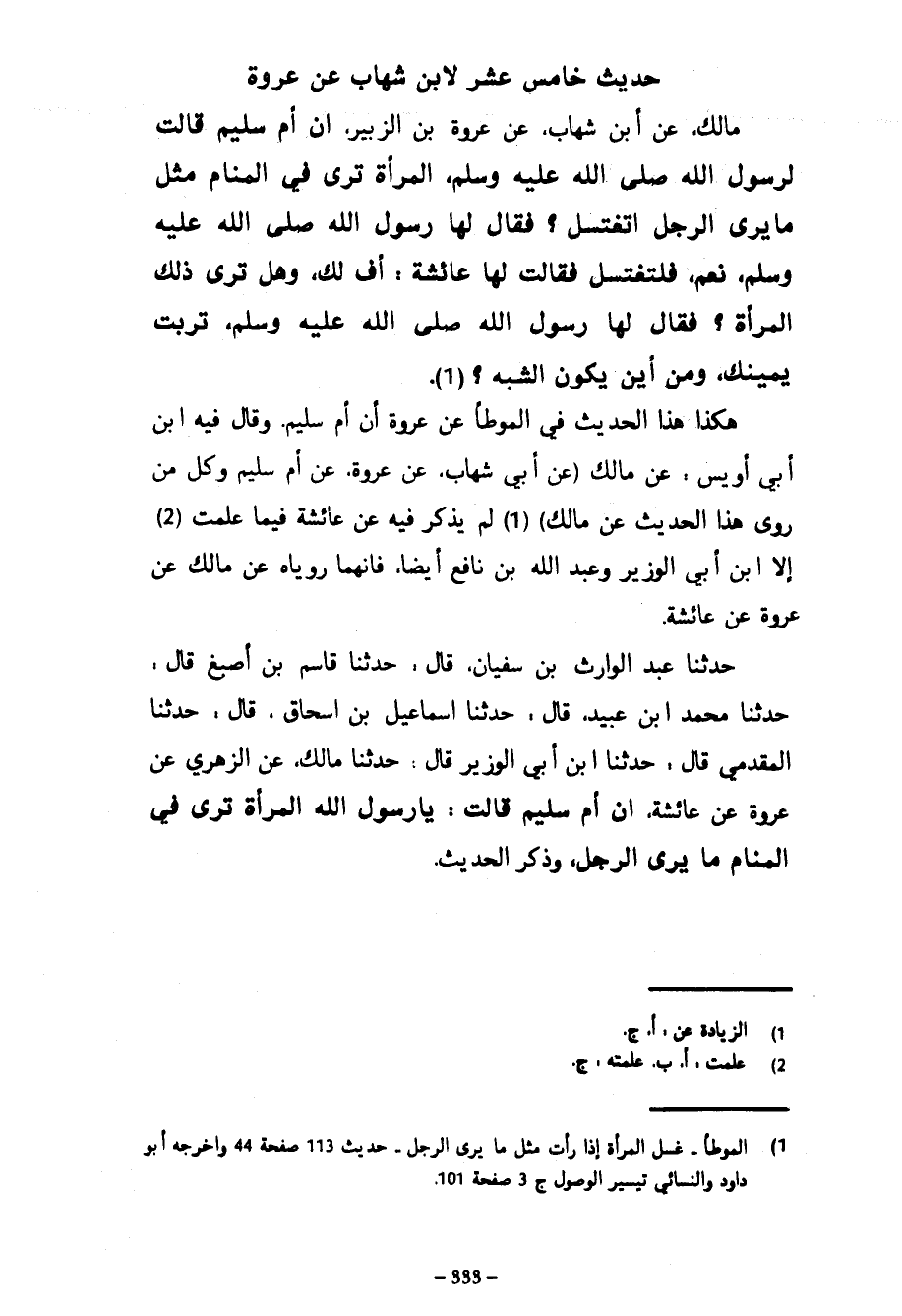 حَدِيثٌ خَامِسَ عَشَرَ لِابْنِ شِهَابٍ عَنْ عُرْوَةَ مَالِكٌ عَنِ ابْنِ شِهَابٍ عَنْ عُرْوَةَ بْنِ الزُّبَيْرِ أَنَّ أُمَّ سُلَيْمٍ قَالَتْ لِرَسُولِ اللَّهِ صَلَّى اللَّهُ عَلَيْهِ وَسَلَّمَ الْمَرْأَةُ تَرَى فِي الْمَنَامِ مِثْلَ مَا يَرَى الرَّجُلُ أَتَغْتَسِلُ فَقَالَ لَهَا رَسُولُ اللَّهِ صَلَّى اللَّهُ عَلَيْهِ وَسَلَّمَ نَعَمْ فَلْتَغْتَسِلْ فَقَالَتْ لَهَا عَائِشَةُ أُفٍّ لَكِ وَهَلْ تَرَى ذَلِكَ الْمَرْأَةُ فَقَالَ لَهَا رَسُولُ اللَّهِ صَلَّى اللَّهُ عَلَيْهِ وَسَلَّمَ تَرِبَتْ يَمِينُكِ وَمِنْ أَيْنَ يَكُونُ الشَّبَهُ هَكَذَا هَذَا الْحَدِيثُ فِي الْمُوَطَّإِ عَنْ عُرْوَةَ أَنَّ أُمَّ سُلَيْمٍ وَقَالَ فِيهِ ابْنُ أَبِي أُوَيْسٍ عَنْ مَالِكٍ (عَنْ أَبِي شِهَابٍ عَنْ عُرْوَةَ عَنْ أُمِّ سُلَيْمٍ وَكُلُّ مَنْ رَوَى هَذَا الْحَدِيثَ عَنْ مَالِكٍ) لَمْ يَذْكُرْ فِيهِ عَنْ عَائِشَةَ فِيمَا عَلِمْتُ إِلَّا ابْنَ أَبِي الْوَزِيرِ وَعَبْدَ اللَّهِ بْنَ نَافِعٍ أَيْضًا فَإِنَّهُمَا رَوَيَاهُ عَنْ مَالِكٍ عَنْ عُرْوَةَ عَنْ عَائِشَةَ حَدَّثَنَا عَبْدُ الْوَارِثِ بْنُ سُفْيَانَ قَالَ حَدَّثَنَا قَاسِمُ بْنُ أَصْبَغَ قَالَ حَدَّثَنَا مُحَمَّدُ بْنُ عُبَيْدٍ قَالَ حَدَّثَنَا إِسْمَاعِيلُ بْنُ إِسْحَاقَ قَالَ حَدَّثَنَا الْمُقَدَّمِيُّ قَالَ حَدَّثَنَا ابْنُ أَبِي الْوَزِيرِ قَالَ حَدَّثَنَا مَالِكٍ عَنِ الزُّهْرِيِّ عَنْ عُرْوَةَ عَنْ عَائِشَةَ أَنَّ أُمَّ سُلَيْمٍ قَالَتْ يَا رَسُولَ اللَّهِ الْمَرْأَةُ تَرَى فِي الْمَنَامِ مَا يَرَى الرَّجُلُ وَذَكَرَ الحديث
