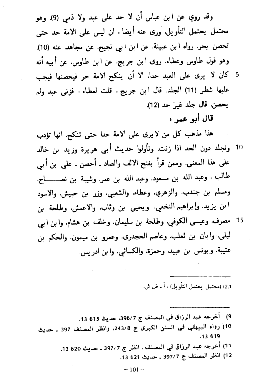 وَقَدْ رُوِيَ عَنِ ابْنِ عَبَّاسٍ أَنْ لَا حَدَّ عَلَى عَبْدٍ وَلَا ذِمِّيٍّ وَهُوَ مُحْتَمَلٌ يحتمل التأويل ورى عَنْهُ أَيْضًا أَنْ لَيْسَ عَلَى الْأَمَةِ حَدٌّ حَتَّى تُحْصَنَ بِحُرٍّ رَوَاهُ ابْنُ عُيَيْنَةَ عَنِ ابْنِ أَبِي نَجِيحٍ عَنْ مُجَاهِدٍ عَنْهُ وَهُوَ قَوْلُ طَاوُسٍ وَعَطَاءٍ رَوَى ابْنُ جُرَيْجٍ عَنِ ابْنِ طَاوُسٍ عَنْ أَبِيهِ أَنَّهُ كَانَ لَا يَرَى عَلَى الْعَبْدِ حَدًّا إِلَّا أَنْ يَنْكِحَ الْأَمَةَ حُرٌّ فَيُحْصِنُهَا فَيَجِبُ عَلَيْهَا شَطْرُ الْجَلْدِ قَالَ ابْنُ جُرَيْجٍ قُلْتُ لِعَطَاءٍ فَزَنَى عَبْدٌ وَلَمْ يُحْصَنْ قَالَ جَلْدٌ غَيْرُ حَدٍّ قَالَ أَبُو عُمَرَ هَذَا مَذْهَبُ كُلِّ مَنْ لَا يَرَى عَلَى الْأَمَةِ حَدًّا حَتَّى تُنْكَحَ أَنَّهَا تُؤَدَّبُ وَتُجْلَدُ دُونَ الْحَدِّ إِذَا زَنَتْ وَتَأَوَّلُوا حَدِيثَ أَبِي هُرَيْرَةَ وَزَيْدِ بْنِ خَالِدٍ عَلَى هَذَا الْمَعْنَى وَمِمَّنْ قَرَأَ بِفَتْحِ الْأَلِفِ وَالصَّادِ أَحْصَنَّ عَلِيِّ بْنِ أَبِي طَالِبٍ وَعَبْدِ اللَّهِ بْنِ مَسْعُودٍ وَعَبْدُ اللَّهِ بْنُ عُمَرَ وَشَيْبَةُ بْنُ نَصَّاحٍ وَمُسْلِمُ بْنُ جُنْدُبٍ وَالزُّهْرِيُّ وَعَطَاءٌ والشعبي وزر بن حبيش والأسود ابن يَزِيدَ وَإِبْرَاهِيمُ النَّخَعِيُّ وَيَحْيَى بْنُ وَثَّابٍ وَالْأَعْمَشُ وَطَلْحَةُ بْنُ مُصَرِّفٍ وَعِيسَى الْكُوفِيُّ وَطَلْحَةُ بْنُ سُلَيْمَانَ وَخَلَفُ بْنُ هِشَامٍ وَابْنُ أَبِي لَيْلَى وَأَبَانُ بْنُ ثَعْلَبٍ وَعَاصِمٌ الْحَجْدَرِيُّ وَعَمْرُو بْنُ مَيْمُونٍ وَالْحَكَمُ بْنُ عُتَيْبَةَ وَيُونُسُ بْنُ عُبَيْدٍ وَحَمْزَةُ وَالْكِسَائِيُّ وَابْنُ إِدْرِيسَ