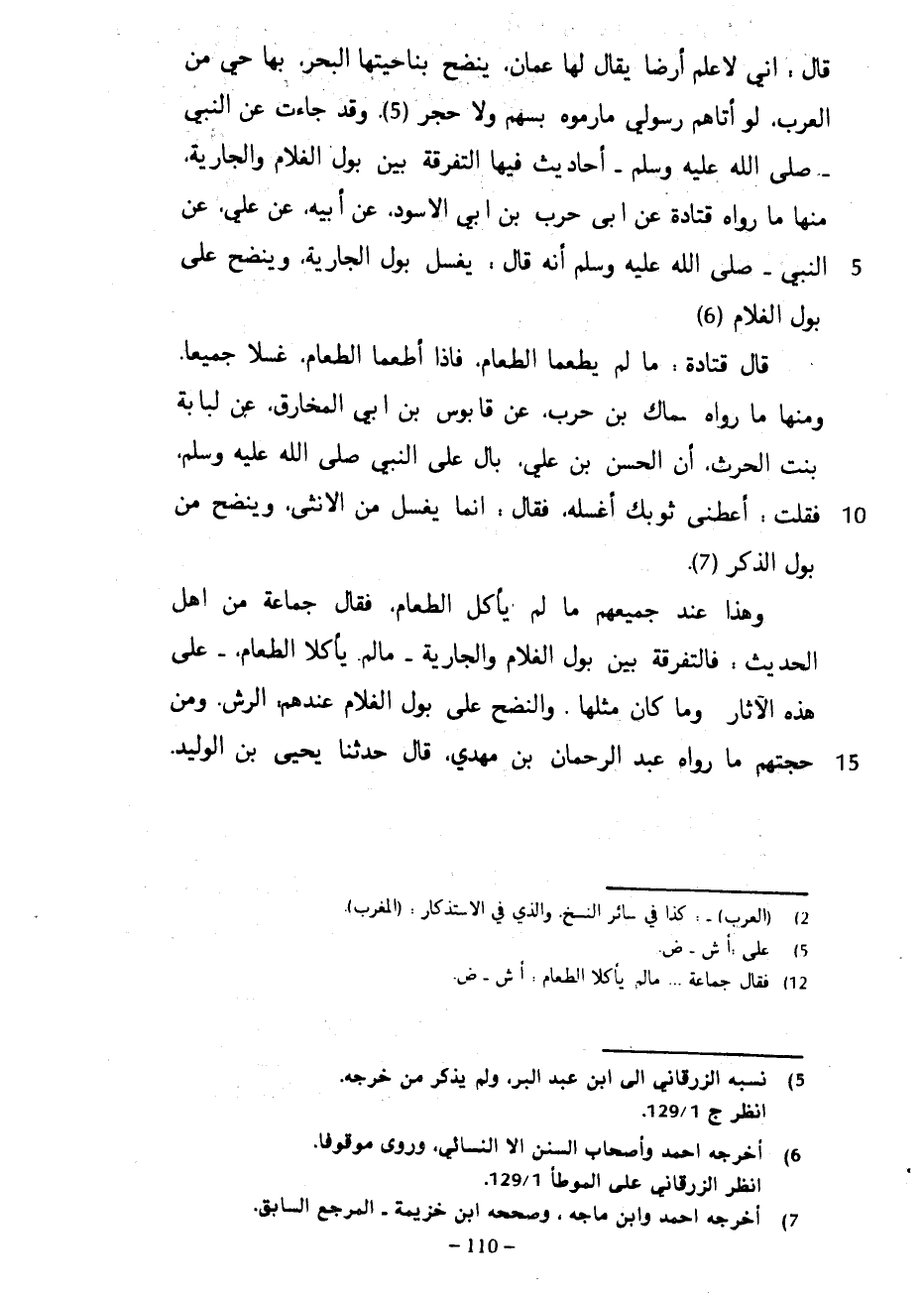 قَالَ إِنِّي لَأَعْلَمُ أَرْضًا يُقَالُ لَهَا عُمَانُ يَنْضَحُ بِنَاحِيَتِهَا الْبَحْرُ بِهَا حَيٌّ مِنَ الْعَرَبِ لَوْ أَتَاهُمْ رَسُولِي مَا رَمَوْهُ بِسَهْمٍ وَلَا حَجَرٍ وَقَدْ جَاءَتْ عَنِ النَّبِيِّ صَلَّى اللَّهُ عَلَيْهِ وَسَلَّمَ أَحَادِيثُ فِيهَا التَّفْرِقَةُ بَيْنَ بَوْلِ الْغُلَامِ وَالْجَارِيَةِ مِنْهَا مَا رَوَاهُ قَتَادَةُ عَنْ أَبِي حَرْبِ بْنِ أَبِي الْأَسْوَدِ عَنْ أَبِيهِ عَنْ عَلِيٍّ عَنِ النَّبِيِّ صَلَّى اللَّهُ عَلَيْهِ وَسَلَّمَ أَنَّهُ قَالَ يُغْسَلُ بَوْلُ الْجَارِيَةِ وَيُنْضَحُ عَلَى بَوْلِ الْغُلَامِ قَالَ قَتَادَةُ مَا لَمْ يُطْعَمَا الطَّعَامَ فَإِذَا أُطْعِمَا الطَّعَامَ غُسِلَا جَمِيعًا وَمِنْهَا مَا رَوَاهُ سِمَاكُ بْنُ حَرْبٍ عَنْ قَابُوسِ بْنِ أَبِي الْمُخَارِقِ عَنْ لُبَابَةَ بِنْتِ الحرث أَنَّ الْحَسَنَ بْنَ عَلِيٍّ بَالَ عَلَى النَّبِيِّ صَلَّى اللَّهُ عَلَيْهِ وَسَلَّمَ فَقُلْتُ أَعْطِنِي ثَوْبَكَ أَغْسِلْهُ فَقَالَ إِنَّمَا يُغْسَلُ مِنَ الْأُنْثَى وَيُنْضَحُ مِنْ بَوْلِ الذَّكَرِ وَهَذَا عِنْدَ جَمِيعِهِمْ مَا لَمْ يَأْكُلِ الطَّعَامَ فَقَالَ جَمَاعَةٌ مِنْ أَهْلِ الْحَدِيثِ فَالتَّفْرِقَةُ بَيْنَ بَوْلِ الْغُلَامِ وَالْجَارِيَةِ مَا لَمْ يَأْكُلَا الطَّعَامَ عَلَى هَذِهِ الْآثَارِ وَمَا كَانَ مِثْلَهَا وَالنَّضْحُ عَلَى بَوْلِ الْغُلَامِ عِنْدَهُمْ الرش ومن حجتهم ما رواه عبد الرحمان بْنُ مَهْدِيٍّ قَالَ حَدَّثَنَا يَحْيَى بْنُ الْوَلِيدِ