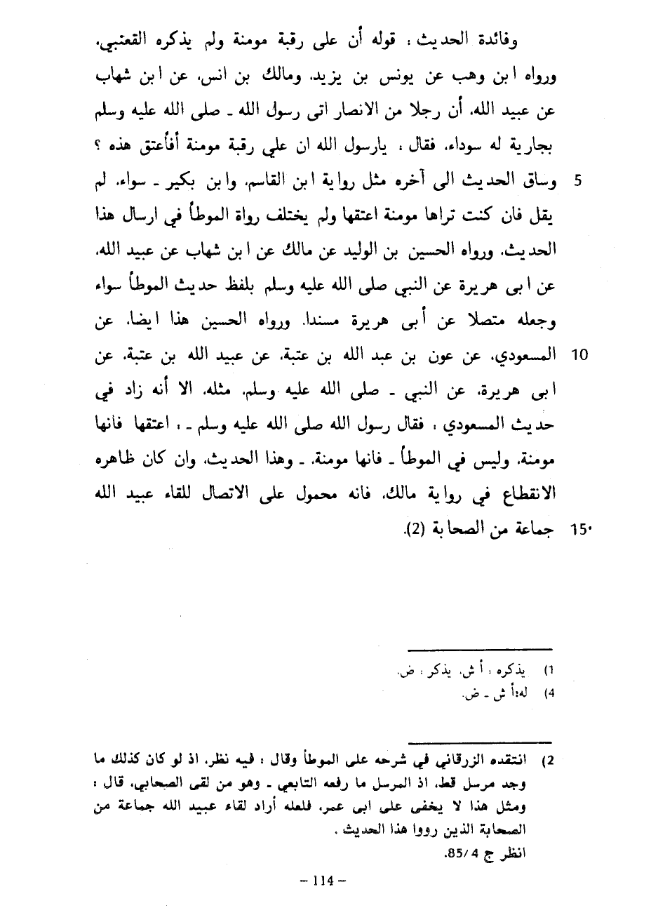 وَفَائِدَةُ الْحَدِيثِ قَوْلُهُ إِنَّ عَلَيَّ رَقَبَةً مُؤْمِنَةً وَلَمْ يَذْكُرْهُ الْقَعْنَبِيُّ وَرَوَاهُ ابْنُ وَهْبٍ عَنْ يُونُسَ بْنِ يَزِيدَ ومالك بْنُ أَنَسٍ عَنِ ابْنِ شِهَابٍ عَنْ عُبَيْدِ اللَّهِ أَنَّ رَجُلًا مِنَ الْأَنْصَارِ أَتَى رَسُولَ اللَّهِ صَلَّى اللَّهُ عَلَيْهِ وَسَلَّمَ بِجَارِيَةٍ لَهُ سَوْدَاءَ فَقَالَ يَا رَسُولَ اللَّهِ إِنَّ عَلَيَّ رَقَبَةً مُؤْمِنَةً أَفَأُعْتِقُ هَذِهِ وَسَاقَ الْحَدِيثَ إِلَى آخِرِهِ مِثْلَ رِوَايَةِ ابْنِ الْقَاسِمِ وَابْنِ بُكَيْرٍ سَوَاءً لَمْ يَقُلْ فَإِنْ كُنْتَ تَرَاهَا مُؤْمِنَةً أُعْتِقُهَا وَلَمْ يَخْتَلِفْ رُوَاةُ الْمُوَطَّأِ فِي إِرْسَالِ هَذَا الْحَدِيثِ وَرَوَاهُ الْحُسَيْنُ بْنُ الْوَلِيدِ عَنْ مَالِكٍ عَنِ ابْنِ شِهَابٍ عَنْ عُبَيْدِ اللَّهِ عَنْ أَبِي هُرَيْرَةَ عَنِ النَّبِيِّ صَلَّى اللَّهُ عَلَيْهِ وَسَلَّمَ بِلَفْظِ حَدِيثِ الْمُوَطَّأِ سَوَاءً وَجَعَلَهُ مُتَّصِلًا عَنْ أَبِي هُرَيْرَةَ مُسْنَدًا وَرَوَاهُ الْحُسَيْنُ هَذَا أَيْضًا عَنِ الْمَسْعُودِيِّ عَنْ عَوْنِ بْنِ عَبْدِ اللَّهِ بْنِ عُتْبَةَ عَنْ عُبَيْدِ اللَّهِ بْنِ عُتْبَةَ عَنْ أَبِي هُرَيْرَةَ عَنِ النَّبِيِّ صَلَّى اللَّهُ عَلَيْهِ وَسَلَّمَ مِثْلَهُ إِلَّا أَنَّهُ زَادَ فِي حَدِيثِ الْمَسْعُودِيِّ فَقَالَ رَسُولُ اللَّهِ صَلَّى اللَّهُ عَلَيْهِ وَسَلَّمَ أَعْتِقْهَا فَإِنَّهَا مُؤْمِنَةٌ وَلَيْسَ فِي الْمُوَطَّأِ فَإِنَّهَا مُؤْمِنَةٌ وَهَذَا الْحَدِيثُ وإن كان ظاهره الانقطاع فِي رِوَايَةِ مَالِكٍ فَإِنَّهُ مَحْمُولٌ عَلَى الِاتِّصَالِ لِلِقَاءِ عُبَيْدِ اللَّهِ جَمَاعَةً مِنَ الصَّحَابَةِ