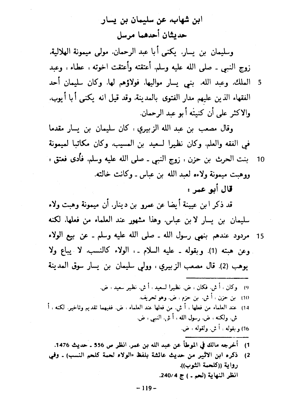 ابْنُ شِهَابٍ عَنْ سُلَيْمَانَ بْنِ يَسَارٍ حَدِيثَانِ أَحَدُهُمَا مُرْسَلٌ وَسُلَيْمَانُ بْنُ يَسَارٍ يُكْنَى أَبَا عبد الرحمان مَوْلَى مَيْمُونَةَ الْهِلَالِيَّةِ زَوْجِ النَّبِيِّ صَلَّى اللَّهُ عَلَيْهِ وَسَلَّمَ أَعْتَقَتْهُ وَأَعْتَقَتْ إِخْوَتَهُ عَطَاءً وَعَبْدَ الْمَلِكِ وَعَبْدَ اللَّهِ بَنِي يَسَارٍ مَوَالِيَهَا فَوَلَاؤُهُمْ لَهَا وَكَانَ سُلَيْمَانُ أَحَدَ الْفُقَهَاءِ الَّذِينَ عَلَيْهِمْ مَدَارُ الْفَتْوَى بِالْمَدِينَةِ وَقَدْ قِيلَ إِنَّهُ يُكْنَى أَبَا أَيُّوبَ وَالْأَكْثَرُ عَلَى أَنَّ كُنْيَتَهُ أَبُو عبد الرحمان وَقَالَ مُصْعَبُ بْنُ عَبْدِ اللَّهِ الزُّبَيْرِيُّ كَانَ سُلَيْمَانُ بْنُ يَسَارٍ مُقَدَّمًا فِي الْفِقْهِ وَالْعِلْمِ وَكَانَ نَظِيرًا لِسَعِيدِ بْنِ الْمُسَيَّبِ وَكَانَ مُكَاتِبًا لميمونة بنت الحرث بْنِ حَزْنٍ زَوْجِ النَّبِيِّ صَلَّى اللَّهُ عَلَيْهِ وَسَلَّمَ فَأَدَّى فَعُتِقَ وَوَهَبَتْ مَيْمُونَةُ وَلَاءَهُ لِعَبْدِ اللَّهِ بْنِ عَبَّاسٍ وَكَانَتْ خَالَتَهُ قَالَ أَبُو عُمَرَ قَدْ ذَكَرَ ابْنُ عُيَيْنَةَ أَيْضًا عَنْ عَمْرِو بْنِ دِينَارٍ أَنَّ مَيْمُونَةَ وَهَبَتْ وَلَاءَ سُلَيْمَانَ بْنِ يَسَارٍ لِابْنِ عَبَّاسٍ وَهَذَا مَشْهُورٌ عِنْدَ الْعُلَمَاءِ مِنْ فِعْلِهَا لَكِنَّهُ مَرْدُودٌ عِنْدَهُمْ بِنَهْيِ رَسُولِ اللَّهِ صَلَّى اللَّهُ عَلَيْهِ وَسَلَّمَ عن بيع الولاء وَعَنْ هِبَتِهِ وَبِقَوْلِهِ عَلَيْهِ السَّلَامُ الْوَلَاءُ كَالنَّسَبِ لَا يُبَاعُ وَلَا يُوهَبُ قَالَ مُصْعَبٌ الزُّبَيْرِيُّ وَوَلِيَ سُلَيْمَانُ بْنُ يَسَارٍ سُوقَ الْمَدِينَةِ