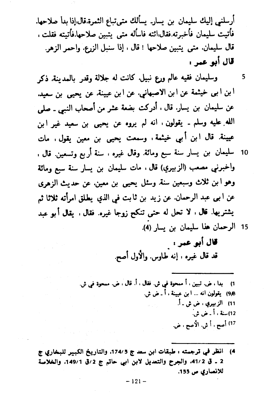 أَرْسَلَنِي إِلَيْكَ سُلَيْمَانُ بْنُ يَسَارٍ يَسْأَلُكَ مَتَى تُبَاعُ الثَّمَرَةُ قَالَ إِذَا بَدَا صَلَاحُهَا فَأَتَيْتُ سُلَيْمَانَ فَأَخْبَرْتُهُ فَقَالَ ائْتِهِ فَاسْأَلْهُ مَتَى يَتَبَيَّنُ صَلَاحُهَا فَأَتَيْتُهُ فَقُلْتُ قَالَ سُلَيْمَانُ مَتَى يَتَبَيَّنُ صَلَاحُهَا قَالَ إِذَا سَنْبَلَ الزَّرْعُ وَاحْمَرَّ الزَّهْرُ قَالَ أَبُو عُمَرَ وَسُلَيْمَانُ فَقِيهٌ عَالِمٌ وَرِعٌ نَبِيلٌ كَانَتْ لَهُ جَلَالَةٌ وَقَدْرٌ بِالْمَدِينَةِ ذَكَرَ ابْنُ أَبِي خَيْثَمَةَ عَنِ ابْنِ الْأَصْبَهَانِيِّ عَنِ ابْنُ عُيَيْنَةَ عَنْ يَحْيَى بْنِ سَعِيدٍ عَنْ سُلَيْمَانَ بْنِ يَسَارٍ قَالَ أَدْرَكْتُ بِضْعَةَ عَشَرَ مِنْ أَصْحَابِ النَّبِيِّ صَلَّى اللَّهُ عَلَيْهِ وَسَلَّمَ يَقُولُونَ إِنَّهُ لَمْ يَرْوِهِ عَنْ يَحْيَى بْنِ سَعِيدٍ غَيْرُ ابْنِ عُيَيْنَةَ قَالَ ابْنُ أَبِي خَيْثَمَةَ وَسَمِعْتُ يَحْيَى بْنَ مَعِينٍ يَقُولُ مَاتَ سُلَيْمَانُ بْنُ يَسَارٍ سَنَةَ سَبْعٍ وَمِائَةٍ وَقَالَ غَيْرُهُ سَنَةَ أَرْبَعٍ وَتِسْعِينَ قَالَ وَأَخْبَرَنِي مُصْعَبٌ الزُّبَيْرِيُّ قَالَ مَاتَ سُلَيْمَانُ بْنُ يَسَارٍ سَنَةَ سَبْعٍ وَمِائَةٍ وَهُوَ ابْنُ ثَلَاثٍ وَسَبْعِينَ سَنَةً وسئل يحيى ين مَعِينٍ عَنْ حَدِيثِ الزُّهْرِيِّ عَنْ أَبِي عَبْدِ الرحمان عَنْ زَيْدِ بْنِ ثَابِتٍ فِي الَّذِي يُطَلِّقُ امْرَأَتَهُ ثَلَاثًا ثُمَّ يَشْتَرِيهَا قَالَ لَا تَحِلُّ لَهُ حَتَّى تَنْكِحَ زَوْجًا غَيْرَهُ فَقَالَ يُقَالُ أبو عبد الرحمان هَذَا سُلَيْمَانُ بْنُ يَسَارٍ قَالَ أَبُو عُمَرَ قَدْ قَالَ غَيْرُهُ إِنَّهُ طَاوُسٌ وَالْأَوَّلُ أَصَحُّ