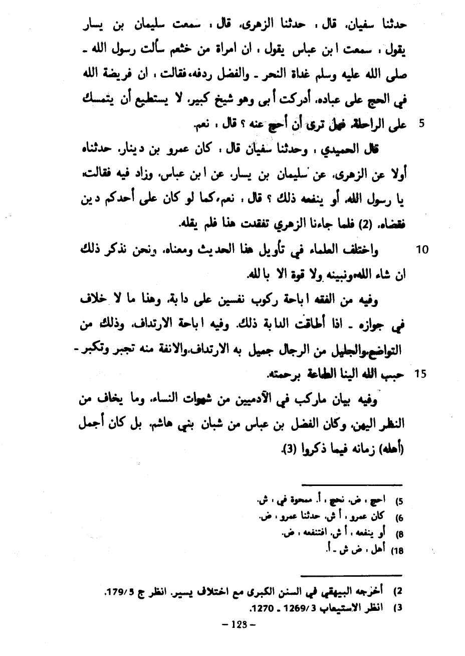 حَدَّثَنَا سُفْيَانُ قَالَ حَدَّثَنَا الزُّهْرِيُّ قَالَ سَمِعْتُ سُلَيْمَانَ بْنَ يَسَارٍ يَقُولُ سَمِعْتُ ابْنَ عَبَّاسٍ يَقُولُ أَنَّ امْرَأَةً مِنْ خَثْعَمَ سَأَلَتْ رَسُولَ اللَّهِ صَلَّى اللَّهُ عَلَيْهِ وَسَلَّمَ غَدَاةَ النَّحْرِ وَالْفَضْلُ رِدْفُهُ فَقَالَتْ إِنَّ فَرِيضَةَ اللَّهِ فِي الْحَجِّ عَلَى عِبَادِهِ أَدْرَكَتْ أَبِي وَهُوَ شَيْخٌ كَبِيرٌ لَا يَسْتَطِيعُ أَنْ يَتَمَسَّكَ عَلَى الرَّاحِلَةِ فَهَلْ تَرَى أَنْ أَحُجَّ عَنْهُ قَالَ نَعَمْ قَالَ الْحُمَيْدِيُّ وَحَدَّثَنَا سُفْيَانُ قَالَ كَانَ عَمْرُو بْنُ دِينَارٍ حَدَّثَنَاهُ أَوَّلًا عَنِ الزُّهُرِيُّ عَنْ سُلَيْمَانَ بْنِ يَسَارٍ عَنِ ابْنِ عَبَّاسٍ وَزَادَ فيه فقالت يا رسول الله أو ينفعه ذَلِكَ قَالَ نَعَمْ كَمَا لَوْ كَانَ عَلَى أَحَدِكُمْ دَيْنٌ فَقَضَاهُ فَلَمَّا جَاءَنَا الزُّهْرِيُّ تَفَقَّدْتُ هَذَا فَلَمْ يَقُلْهُ وَاخْتَلَفَ الْعُلَمَاءُ فِي تَأْوِيلِ هَذَا الْحَدِيثِ وَمَعْنَاهُ وَنَحْنُ نَذْكُرُ ذَلِكَ إِنْ شَاءَ اللَّهُ وَنُبَيِّنُهُ وَلَا قُوَّةَ إِلَّا بِاللَّهِ وَفِيهِ مِنَ الْفِقْهِ إِبَاحَةُ رُكُوبِ نَفْسَيْنِ عَلَى دَابَّةٍ وَهَذَا مَا لَا خِلَافَ فِي جَوَازِهِ إِذَا أَطَاقَتِ الدَّابَّةُ ذَلِكَ وَفِيهِ إِبَاحَةُ الِارْتِدَافِ وَذَلِكَ مِنَ التَّوَاضُعِ وَالْجَلِيلُ مِنَ الرِّجَالِ جَمِيلٌ بِهِ الِارْتِدَافُ وَالْأَنَفَةُ مِنْهُ تَجَبُّرٌ وَتَكَبُّرٌ حَبَّبَ اللَّهُ إِلَيْنَا الطَّاعَةَ بِرَحْمَتِهِ وَفِيهِ بَيَانُ مَا رُكِّبَ فِي الْآدَمِيِّينَ مِنْ شَهَوَاتِ النِّسَاءِ وَمَا يُخَافُ مِنَ النَّظَرِ إِلَيْهِنَّ وَكَانَ الْفَضْلُ بْنُ عَبَّاسٍ مِنْ شُبَّانِ بَنِي هَاشِمٍ بَلْ كَانَ أجمل أهله زَمَانِهِ فِيمَا ذَكَرُوا