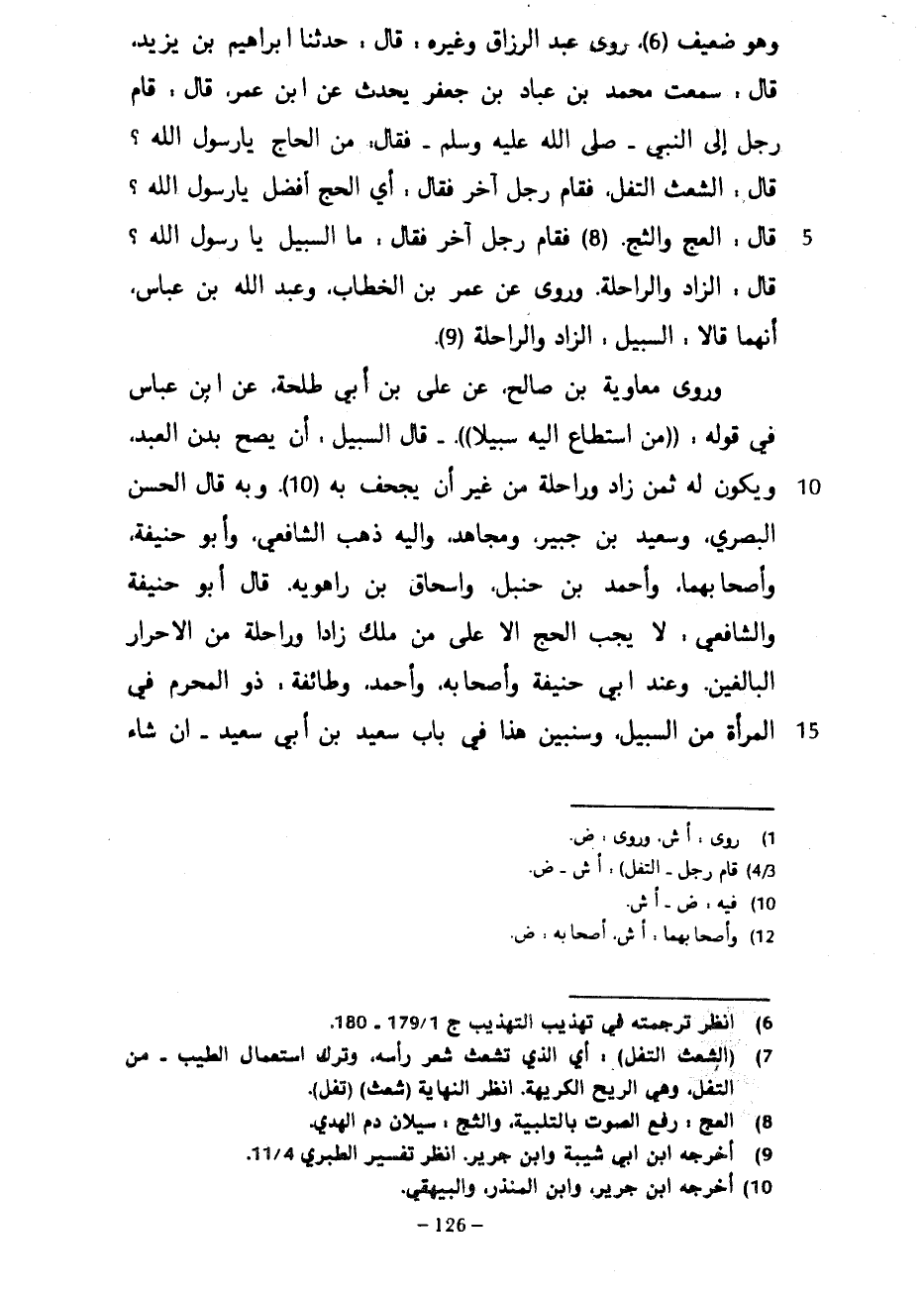 وَهُوَ ضَعِيفٌ رَوَى عَبْدُ الرَّزَّاقِ وَغَيْرُهُ قَالَ حَدَّثَنَا إِبْرَاهِيمُ بْنُ يَزِيدَ قَالَ سَمِعْتُ مُحَمَّدَ بْنَ عَبَّادِ بْنِ جَعْفَرٍ يُحَدِّثُ عَنِ ابْنِ عُمَرَ قَالَ قَامَ رَجُلٌ إِلَى النَّبِيِّ صَلَّى اللَّهُ عَلَيْهِ وَسَلَّمَ فَقَالَ مَنِ الْحَاجُّ يَا رَسُولَ اللَّهِ قَالَ الشَّعِثُ التَّفِلُ فَقَامَ رَجُلٌ آخَرُ فَقَالَ أَيُّ الْحَجِّ أَفْضَلُ يَا رَسُولَ اللَّهِ قَالَ الْعَجُّ وَالثَّجُّ فَقَامَ رَجُلٌ آخَرُ فَقَالَ مَا السَّبِيلُ يَا رَسُولَ اللَّهِ قَالَ الزَّادُ وَالرَّاحِلَةُ وَرُوِيَ عَنْ عُمَرَ بْنِ الْخَطَّابِ وَعَبْدِ اللَّهِ بْنِ عَبَّاسٍ أَنَّهُمَا قَالَا السَّبِيلُ الزَّادُ وَالرَّاحِلَةُ وَرَوَى مُعَاوِيَةُ بْنُ صَالِحٍ عَنْ عَلِيِّ بْنِ أَبِي طَلْحَةَ عَنِ ابْنِ عَبَّاسٍ فِي قَوْلِهِ مَنِ اسْتَطَاعَ إِلَيْهِ سَبِيلًا قَالَ السَّبِيلُ أَنْ يَصِحَّ بَدَنُ الْعَبْدِ وَيَكُونُ لَهُ ثم زَادٍ وَرَاحِلَةٍ مِنْ غَيْرِ أَنْ يُجْحِفَ بِهِ وَبِهِ قَالَ الْحَسَنُ الْبَصْرِيُّ وَسَعِيدُ بْنُ جُبَيْرٍ وَمُجَاهِدٌ وَإِلَيْهِ ذَهَبَ الشَّافِعِيُّ وَأَبُو حَنِيفَةَ وَأَصْحَابُهُمَا وَأَحْمَدُ بْنُ حَنْبَلٍ وَإِسْحَاقُ بْنُ رَاهَوَيْهِ قَالَ أَبُو حَنِيفَةَ وَالشَّافِعِيُّ لَا يَجِبُ الْحَجُّ إِلَّا عَلَى مَنْ مَلَكَ زَادًا وَرَاحِلَةً مِنَ الْأَحْرَارِ الْبَالِغِينَ وَعِنْدَ أَبِي حَنِيفَةَ وَأَصْحَابِهِ وَأَحْمَدَ وَطَائِفَةٍ ذُو الْمَحْرَمِ فِي الْمَرْأَةِ مِنَ السَّبِيلِ وَسَنُبَيِّنُ هَذَا فِي بَابِ سَعِيدِ بْنِ أَبِي سَعِيدٍ إِنْ شاء