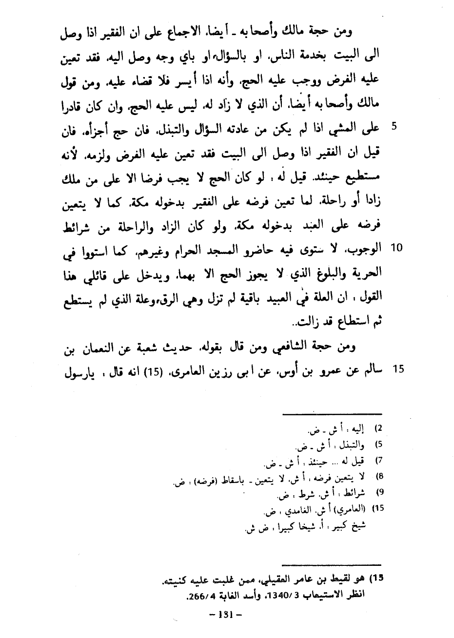 وَمِنْ حُجَّةِ مَالِكٍ وَأَصْحَابِهِ أَيْضًا الْإِجْمَاعُ عَلَى أَنَّ الْفَقِيرَ إِذَا وَصَلَ إِلَى الْبَيْتِ بِخِدْمَةِ النَّاسِ أَوْ بِالسُّؤَالِ أَوْ بِأَيِّ وَجْهٍ وَصَلَ إليه فقد تعين عليه الفرض ووجب عَلَيْهِ الْحَجُّ وَأَنَّهُ إِذَا أَيْسَرَ فَلَا قَضَاءَ عَلَيْهِ وَمِنْ قَوْلِ مَالِكٍ وَأَصْحَابِهِ أَيْضًا أَنَّ الَّذِي لَا زَادَ لَهُ لَيْسَ عَلَيْهِ الْحَجُّ وَإِنْ كَانَ قَادِرًا عَلَى الْمَشْيِ إِذَا لَمْ يَكُنْ مِنْ عَادَتِهِ السُّؤَالُ وَالتَّبَذُّلُ فَإِنْ حَجَّ أَجَزَأَهُ فَإِنْ قِيلَ إِنَّ الْفَقِيرَ إِذَا وَصَلَ إِلَى الْبَيْتِ فَقَدْ تَعَيَّنَ عَلَيْهِ الْفَرْضُ وَلَزِمَهُ لِأَنَّهُ مُسْتَطِيعٌ حِينَئِذٍ قِيلَ لَهُ لَوْ كَانَ الْحَجُّ لَا يَجِبُ فَرْضًا إِلَّا عَلَى مَنْ مَلَكَ زَادًا أَوْ رَاحِلَةً لَمَا تَعَيَّنَ فَرْضُهُ عَلَى الْفَقِيرِ بِدُخُولِهِ مَكَّةَ كَمَا لَا يَتَعَيَّنُ فَرْضُهُ عَلَى الْعَبْدِ بِدُخُولِهِ مَكَّةَ وَلَوْ كَانَ الزاد والراحلة من شرائط الوجوب لا ستوى فِيهِ حَاضِرُو الْمَسْجِدِ الْحَرَامِ وَغَيْرُهُمْ كَمَا اسْتَوَوْا فِي الْحُرِّيَّةِ وَالْبُلُوغِ الَّذِي لَا يَجُوزُ الْحَجُّ إِلَّا بِهِمَا وَيَدْخُلُ عَلَى قَائِلِي هَذَا الْقَوْلِ إِنَّ الْعِلَّةَ فِي الْعَبِيدِ بَاقِيَةٌ لَمْ تَزُلْ وَهِيَ الرِّقُّ وَعِلَّةُ الَّذِي لَمْ يَسْتَطِعْ ثُمَّ اسْتَطَاعَ قَدْ زَالَتْ وَمِنْ حُجَّةِ الشَّافِعِيِّ وَمَنْ قَالَ بِقَوْلِهِ حَدِيثُ شُعْبَةَ عَنِ النُّعْمَانِ بْنِ سَالِمٍ عَنْ عَمْرِو بْنِ أَوْسٍ عَنْ أَبِي رَزِينٍ الْعَامِرِيِّ أَنَّهُ قَالَ يَا رَسُولَ