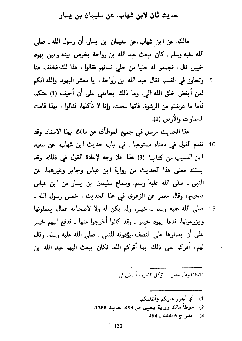 حَدِيثٌ ثَانٍ لِابْنِ شِهَابٍ عَنْ سُلَيْمَانَ بْنِ يَسَارٍ مَالِكٍ عَنِ ابْنِ شِهَابٍ عَنْ سُلَيْمَانَ بْنِ يَسَارٍ أَنَّ رَسُولَ اللَّهِ صَلَّى اللَّهُ عَلَيْهِ وَسَلَّمَ كَانَ يَبْعَثُ عَبْدَ اللَّهِ بْنَ رَوَاحَةَ يَخْرُصُ بَيْنَهُ وَبَيْنَ يَهُودِ خَيْبَرَ قَالَ فَجَمَعُوا لَهُ حَلْيًا مِنْ حَلْيِ نِسَائِهِمْ فَقَالُوا هذا لك فخفف عنا وَتَجَاوَزْ فِي الْقَسْمِ فَقَالَ عَبْدُ اللَّهِ بْنُ رَوَاحَةَ يَا مَعْشَرَ الْيَهُودِ وَاللَّهِ إِنَّكُمْ لَمِنْ أَبْغَضِ خَلْقِ اللَّهِ إِلَيَّ وَمَا ذَلِكَ بِحَامِلِي على أن أحيف عنكم فَأَمَّا مَا عَرَضْتُمْ مِنَ الرِّشْوَةِ فَإِنَّهَا سُحْتٌ وَإِنَّا لَا نَأْكُلُهَا فَقَالُوا بِهَذَا قَامَتِ السَّمَاوَاتُ وَالْأَرْضُ هَذَا الْحَدِيثُ مُرْسَلٌ فِي جَمِيعِ الْمُوَطَّآتِ عَنْ مَالِكٍ بِهَذَا الْإِسْنَادِ وَقَدْ تَقَدَّمَ الْقَوْلُ فِي مَعْنَاهُ مُسْتَوْعَبًا فِي بَابِ حَدِيثِ ابْنِ شهاب عن سعيد ابن الْمُسَيَّبِ مِنْ كِتَابِنَا هَذَا فَلَا وَجْهَ لِإِعَادَةِ الْقَوْلِ فِي ذَلِكَ وَقَدْ يَسْتَنِدُ مَعْنَى هَذَا الْحَدِيثِ مِنْ رِوَايَةِ ابْنِ عَبَّاسٍ وَجَابِرٍ وَغَيْرِهِمَا عَنِ النَّبِيِّ صَلَّى اللَّهُ عَلَيْهِ وَسَلَّمَ وَسَمَاعُ سُلَيْمَانَ بْنِ يَسَارٍ مِنْ ابْنِ عَبَّاسٍ صَحِيحٌ وَقَالَ مَعْمَرٌ عَنِ الزُّهْرِيِّ فِي هَذَا الْحَدِيثِ خَمَّسَ رَسُولُ اللَّهِ صَلَّى اللَّهُ عَلَيْهِ وَسَلَّمَ خَيْبَرَ وَلَمْ يَكُنْ لَهُ وَلَا لِأَصْحَابِهِ عُمَّالٌ يَعْمَلُونَهَا وَيَزْرَعُونَهَا فَدَعَا يَهُودَ خَيْبَرَ وَقَدْ كَانُوا أُخْرِجُوا مِنْهَا فَدَفَعَ إِلَيْهِمْ خَيْبَرَ عَلَى أَنْ يَعْمَلُوهَا عَلَى النِّصْفِ يُؤَدُّونَهُ لِلنَّبِيِّ صَلَّى اللَّهُ عَلَيْهِ وَسَلَّمَ وَقَالَ لَهُمْ أُقِرُّكُمْ عَلَى ذَلِكَ بما أَقَرَّكُمُ اللَّهُ فَكَانَ يَبْعَثُ إِلَيْهِمْ عَبْدَ اللَّهِ بن