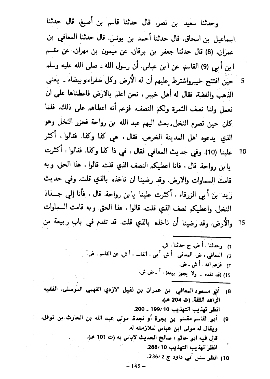 وَحَدَّثَنَا سَعِيدُ بْنُ نَصْرٍ قَالَ حَدَّثَنَا قَاسِمُ بْنُ أَصْبَغَ قَالَ حَدَّثَنَا إِسْمَاعِيلُ بْنُ إِسْحَاقَ قَالَ حَدَّثَنَا أَحْمَدُ بْنُ يُونُسَ قَالَ حَدَّثَنَا الْمُعَافَى بْنُ عِمْرَانَ قَالَ حَدَّثَنَا جَعْفَرُ بْنُ بُرْقَانَ عَنْ مَيْمُونِ بْنِ مِهْرَانَ عَنْ مِقْسَمِ ابن أَبِي الْقَاسِمِ عَنِ ابْنِ عَبَّاسٍ أَنَّ رَسُولَ اللَّهِ صَلَّى اللَّهُ عَلَيْهِ وَسَلَّمَ حِينَ افْتَتَحَ خَيْبَرَ وَاشْتَرَطَ عَلَيْهِمْ أَنَّ لَهُ الْأَرْضَ وَكُلَّ صَفْرَاءَ وَبَيْضَاءَ يَعْنِي الذَّهَبَ وَالْفِضَّةَ فَقَالَ لَهُ أَهْلُ خَيْبَرَ نَحْنُ أَعْلَمُ بِالْأَرْضِ فَأَعْطِنَاهَا عَلَى أَنْ نَعْمَلَ وَلَنَا نِصْفُ الثَّمَرَةِ وَلَكُمُ النِّصْفُ فَزَعَمَ أَنَّهُ أَعْطَاهُمْ عَلَى ذَلِكَ فَلَمَّا كَانَ حِينَ تَصَرَّمَ النَّخْلُ بَعَثَ إِلَيْهِمْ عَبْدَ اللَّهِ بْنَ رَوَاحَةَ فَحَزَرَ النَّخْلَ وَهُوَ الَّذِي يَدْعُوهُ أَهْلُ الْمَدِينَةِ الْخَرْصَ فَقَالَ هِيَ كَذَا وَكَذَا فقالوا أكثر علينا وفي حدثنا الْمُعَافَى فَقَالَ فِي ذَا كَذَا وَكَذَا فَقَالُوا أكثرت يا بن رَوَاحَةَ قَالَ فَأَنَا أُعْطِيكُمُ النِّصْفَ الَّذِي قُلْتُ قَالُوا هَذَا الْحَقُّ وَبِهِ قَامَتِ السَّمَاوَاتُ وَالْأَرْضُ وَقَدْ رَضِينَا أَنْ نَأْخُذَهُ بِالَّذِي قُلْتَ وَفِي حَدِيثِ زَيْدِ بْنِ أَبِي الزَّرْقَاءِ أَكْثَرْتَ عَلَيْنَا يا بن رَوَاحَةَ قَالَ فَأَنَا أَلِي جُذَاذَ النَّخْلِ وَأُعْطِيكُمْ نِصْفَ الَّذِي قُلْتُ قَالُوا هَذَا الْحَقُّ وَبِهِ قَامَتِ السَّمَاوَاتُ وَالْأَرْضُ وَقَدْ رَضِينَا أَنْ نَأْخُذَهُ بِالَّذِي قُلْتَ قَدْ تَقَدَّمَ فِي بَابِ رَبِيعَةَ من