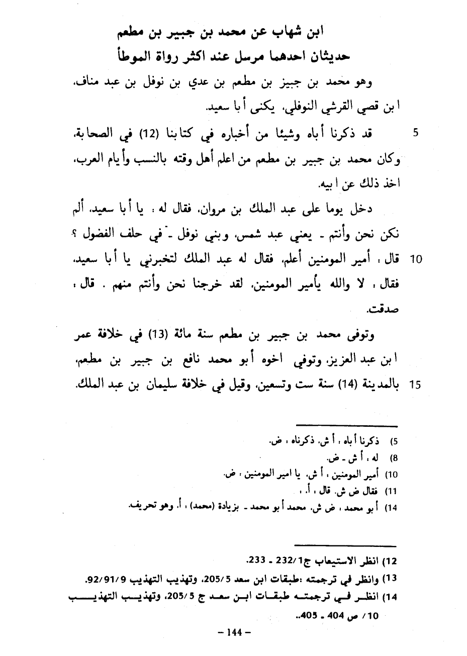 ابن شهاب عن محمد بن جبير بن مُطْعِمٍ حَدِيثَانِ أَحَدُهُمَا مُرْسَلٌ عِنْدَ أَكْثَرِ رُوَاةِ الموطأ وهو محمد بن جبيز بْنِ مُطْعِمِ بْنِ عَدِيِّ بْنِ نَوْفَلِ بْنِ عبد مناف ابن قُصَيٍّ الْقُرَشِيُّ النَّوْفَلِيُّ يُكْنَى أَبَا سَعِيدٍ قَدْ ذَكَرْنَا أَبَاهُ وَشَيْئًا مِنْ أَخْبَارِهِ فِي كِتَابِنَا فِي الصَّحَابَةِ وَكَانَ مُحَمَّدُ بْنُ جُبَيْرِ بْنِ مُطْعِمٍ مِنْ أَعْلَمِ أَهْلِ وَقْتِهِ بِالنَّسَبِ وَأَيَّامِ الْعَرَبِ أَخَذَ ذَلِكَ عَنْ أَبِيهِ دَخَلَ يَوْمًا عَلَى عَبْدِ الْمَلِكِ بْنِ مَرْوَانَ فَقَالَ لَهُ يَا أَبَا سَعِيدٍ أَلَمْ نَكُنْ نَحْنُ وَأَنْتُمْ يَعْنِي عَبْدَ شَمْسٍ وَبَنِي نَوْفَلٍ فِي حِلْفِ الْفُضُولِ قَالَ أَمِيرُ الْمُؤْمِنِينَ أَعْلَمُ فَقَالَ لَهُ عَبْدُ الْمَلِكِ لَتُخْبِرَنِّي يَا أَبَا سَعِيدٍ فَقَالَ لا والله يأمير الْمُؤْمِنِينَ لَقَدْ خَرَجْنَا نَحْنُ وَأَنْتُمْ مِنْهُمْ قَالَ صَدَقْتَ وَتُوُفِّيَ مُحَمَّدُ بْنُ جُبَيْرِ بْنِ مُطْعِمٍ سنة مائة في خلافة عمر ابن عَبْدِ الْعَزِيزِ وَتُوُفِّيَ أَخُوهُ أَبُو مُحَمَّدٍ نَافِعُ بْنُ جُبَيْرِ بْنِ مُطْعِمٍ بِالْمَدِينَةِ سَنَةَ سِتٍّ وَتِسْعِينَ وَقِيلَ فِي خِلَافَةِ سُلَيْمَانَ بْنِ عَبْدِ الملك