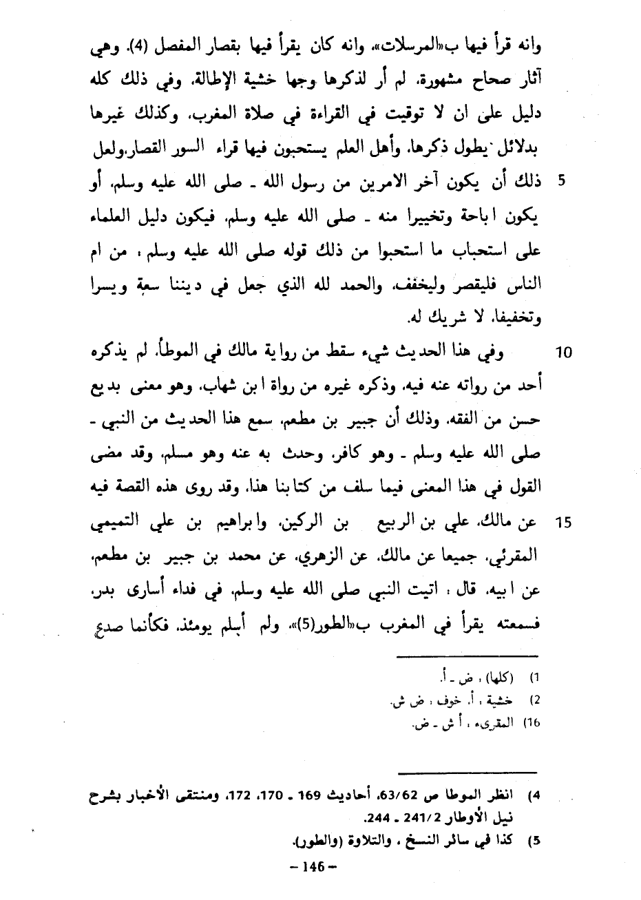 وَأَنَّهُ قَرَأَ فِيهَا بِ الْمُرْسَلَاتِ وَأَنَّهُ كَانَ يَقْرَأُ فِيهَا بِقِصَارِ الْمُفَصَّلِ وَهِيَ آثَارٌ صِحَاحٌ مَشْهُورَةٌ لَمْ أَرَ لِذِكْرِهَا وَجْهًا خَشْيَةَ الْإِطَالَةِ وَفِي ذَلِكَ كُلِّهِ دَلِيلٌ عَلَى أَنْ لَا تَوْقِيتَ فِي الْقِرَاءَةِ فِي صَلَاةِ الْمَغْرِبِ وَكَذَلِكَ غَيْرُهَا بِدَلَائِلَ يَطُولُ ذِكْرُهَا وَأَهْلُ الْعِلْمِ يَسْتَحِبُّونَ فيها قراء السُّوَرِ الْقِصَارِ وَلَعَلَّ ذَلِكَ أَنْ يَكُونَ آخِرُ الْأَمْرَيْنِ مِنْ رَسُولِ اللَّهِ صَلَّى اللَّهُ عَلَيْهِ وَسَلَّمَ أَوْ يَكُونَ إِبَاحَةً وَتَخْيِيرًا مِنْهُ صَلَّى اللَّهُ عَلَيْهِ وَسَلَّمَ فَيَكُونُ دَلِيلُ الْعُلَمَاءِ عَلَى اسْتِحْبَابِ مَا اسْتَحَبُّوا مِنْ ذَلِكَ قَوْلُهُ صَلَّى اللَّهُ عَلَيْهِ وَسَلَّمَ مَنْ أَمَّ النَّاسَ فَلْيُقَصِّرْ وَلْيُخَفِّفْ وَالْحَمْدُ لِلَّهِ الَّذِي جَعَلَ فِي دِينِنَا سَعَةً وَيُسْرًا وَتَخْفِيفًا لَا شَرِيكَ لَهُ وَفِي هَذَا الْحَدِيثِ شَيْءٌ سَقَطَ مِنْ رِوَايَةِ مَالِكٍ فِي الْمُوَطَّأِ لَمْ يَذْكُرْهُ أَحَدٌ مِنْ رُوَاتِهِ عَنْهُ فِيهِ وَذَكَرَهُ غَيْرُهُ مِنْ رُوَاةِ ابْنِ شِهَابٍ وَهُوَ مَعْنًى بَدِيعٌ حَسَنٌ مِنَ الْفِقْهِ وَذَلِكَ أَنَّ جُبَيْرَ بْنِ مُطْعِمٍ سَمِعَ هَذَا الْحَدِيثَ مِنَ النَّبِيِّ صَلَّى اللَّهُ عَلَيْهِ وَسَلَّمَ وَهُوَ كَافِرٌ وَحَدَّثَ بِهِ عَنْهُ وَهُوَ مُسْلِمٌ وَقَدْ مَضَى الْقَوْلُ فِي هَذَا الْمَعْنَى فِيمَا سَلَفَ مِنْ كِتَابِنَا هَذَا وَقَدْ رَوَى هَذِهِ الْقِصَّةَ فِيهِ عَنْ مَالِكٍ عَلِيُّ بْنُ الرَّبِيعِ بْنِ الرُّكَيْنِ وَإِبْرَاهِيمُ بْنُ عَلِيٍّ التَّمِيمِيُّ الْمَقْرَئِيُّ جَمِيعًا عَنْ مَالِكٍ عَنِ الزُّهْرِيِّ عَنْ مُحَمَّدِ بْنِ جُبَيْرِ بْنِ مطعم عَنْ أَبِيهِ قَالَ أَتَيْتُ النَّبِيَّ صَلَّى اللَّهُ عَلَيْهِ وَسَلَّمَ فِي فِدَاءِ أُسَارَى بَدْرٍ فَسَمِعْتُهُ يَقْرَأُ فِي الْمَغْرِبِ بِ الطُّورِ وَلَمْ أُسْلِمْ يَوْمَئِذٍ فَكَأَنَّمَا صَدَعَ