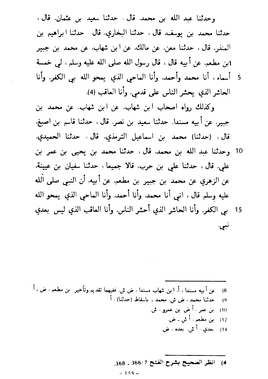 وَحَدَّثَنَا عَبْدُ اللَّهِ بْنُ مُحَمَّدٍ قَالَ حَدَّثَنَا سَعِيدُ بْنُ عُثْمَانَ قَالَ حَدَّثَنَا مُحَمَّدُ بْنُ يُوسُفَ قَالَ حَدَّثَنَا الْبُخَارِيُّ قَالَ حَدَّثَنَا إِبْرَاهِيمُ بْنُ الْمُنْذِرِ قَالَ حَدَّثَنَا مَعْنٌ عَنْ مَالِكٍ عن ابن شهاب عن محمد بن جبير بْنِ مُطْعِمٍ عَنْ أَبِيهِ قَالَ قَالَ رَسُولُ اللَّهِ صَلَّى اللَّهُ عَلَيْهِ وَسَلَّمَ لِي خَمْسَةُ أَسْمَاءٍ أَنَا مُحَمَّدٌ وَأَحْمَدُ وَأَنَا الْمَاحِي الَّذِي يَمْحُو اللَّهُ بِي الْكُفْرَ وَأَنَا الْحَاشِرُ الَّذِي يُحْشَرُ النَّاسُ عَلَى قَدَمِي وَأَنَا الْعَاقِبُ وَكَذَلِكَ رَوَاهُ أَصْحَابُ ابْنِ شِهَابٍ عَنِ ابْنِ شِهَابٍ عَنْ مُحَمَّدِ بْنِ جُبَيْرٍ عَنْ أَبِيهِ مُسْنَدًا حَدَّثَنَا سَعِيدُ بْنُ نَصْرٍ قَالَ حَدَّثَنَا قَاسِمُ بْنُ أَصْبَغَ قَالَ (حَدَّثَنَا) مُحَمَّدُ بْنُ إِسْمَاعِيلَ التِّرْمِذِيُّ قَالَ حَدَّثَنَا الْحُمَيْدِيُّ وَحَدَّثَنَا عَبْدُ اللَّهِ بْنُ مُحَمَّدٍ قَالَ حَدَّثَنَا مُحَمَّدُ بْنُ يَحْيَى بْنِ عُمَرَ بْنِ عَلِيٍّ قَالَ حَدَّثَنَا عَلِيُّ بْنُ حَرْبٍ قَالَا جَمِيعًا حَدَّثَنَا سُفْيَانُ بْنُ عُيَيْنَةَ عَنْ الزُّهْرِيِّ عَنْ مُحَمَّدِ بْنِ جُبَيْرِ بْنِ مُطْعِمٍ عَنْ أَبِيهِ أَنَّ النَّبِيَّ صَلَّى اللَّهُ عَلَيْهِ وَسَلَّمَ قَالَ إِنِّي أَنَا مُحَمَّدٌ وَأَنَا أَحْمَدُ وَأَنَا الْمَاحِي الَّذِي يَمْحُو اللَّهُ بِي الْكُفْرَ وَأَنَا الْحَاشِرُ الَّذِي أَحْشُرُ النَّاسَ وَأَنَا الْعَاقِبُ الَّذِي لَيْسَ بَعْدِي نَبِيٌّ