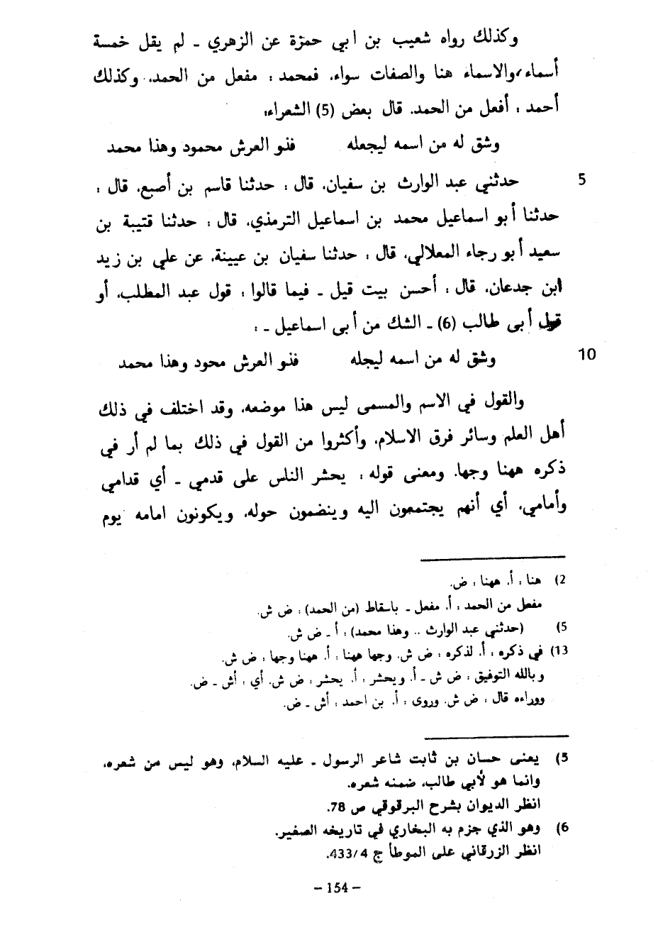 وَكَذَلِكَ رَوَاهُ شُعَيْبُ بْنُ أَبِي حَمْزَةَ عَنِ الزُّهْرِيِّ لَمْ يَقُلْ خَمْسَةُ أَسْمَاءٍ وَالْأَسْمَاءُ هُنَا الصفات سَوَاءٌ فَمُحَمَّدٌ مُفَعَّلٌ مِنَ الْحَمْدِ وَكَذَلِكَ أَحْمَدُ أَفْعَلُ مِنَ الْحَمْدِ قَالَ بَعْضُ الشُّعَرَاءِ ... وَشَقَّ له من اسمه ليجعله ... ... فَذُو الْعَرْشِ مَحْمُودٌ وَهَذَا مُحَمَّدُ ... حَدَّثَنِي عَبْدُ الْوَارِثِ بْنُ سُفْيَانَ قَالَ حَدَّثَنَا قَاسِمُ بْنُ أَصْبَغَ قَالَ حَدَّثَنَا أَبُو إِسْمَاعِيلَ مُحَمَّدُ بْنُ إِسْمَاعِيلَ التِّرْمِذِيُّ قَالَ حَدَّثَنَا قُتَيْبَةُ بْنُ سَعِيدٍ أَبُو رَجَاءٍ الْمِعْلَالِيُّ قَالَ حَدَّثَنَا سُفْيَانُ بْنُ عُيَيْنَةَ عَنْ عَلِيِّ بْنِ زَيْدِ بْنِ جُدْعَانَ قَالَ أَحْسَنُ بَيْتٍ قِيلَ فِيمَا قَالُوا قَوْلُ عَبْدِ الْمَطَّلِبِ أَوْ قَوْلُ أَبِي طَالِبٍ الشَّكُّ مِنْ أَبِي إِسْمَاعِيلَ ... وَشَقَّ لَهُ مِنَ اسْمِهِ لِيُجِلَّهُ ... ... فَذُو الْعَرْشِ مَحْمُودٌ وَهَذَا مُحَمَّدُ ... وَالْقَوْلُ فِي الِاسْمِ وَالْمُسَمَّى لَيْسَ هَذَا مَوْضِعَهُ وَقَدِ اخْتَلَفَ فِي ذَلِكَ أَهْلُ الْعِلْمِ وَسَائِرُ فِرَقِ الْإِسْلَامِ وَأَكْثَرُوا مِنَ الْقَوْلِ فِي ذَلِكَ بِمَا لَمْ أَرَ فِي ذِكْرِهِ هَهُنَا وَجْهًا وَمَعْنَى قَوْلِهِ يُحْشَرُ النَّاسُ عَلَى قَدَمِي أَيْ قُدَّامِي وَأَمَامِي أَيْ إِنَّهُمْ يَجْتَمِعُونَ إِلَيْهِ وَيَنْضَمُّونَ حَوْلَهُ وَيَكُونُونَ أَمَامَهُ يَوْمَ