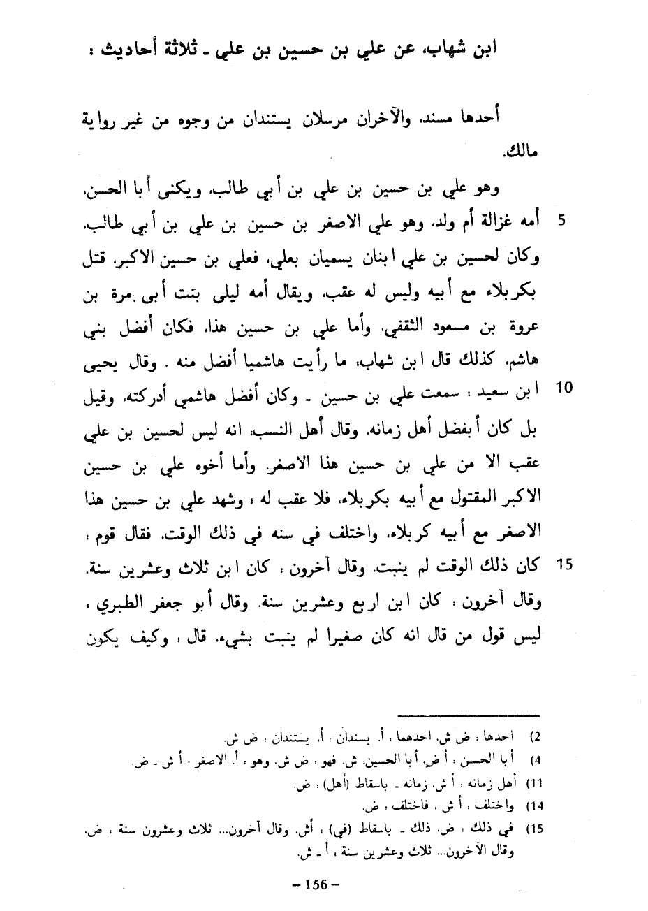 ابن شهاب عن علي بن حسين بن عَلِيٍّ ثَلَاثَةُ أَحَادِيثَ أَحَدُهَا مُسْنَدٌ وَالْآخَرَانِ مُرْسَلَانِ يستندان من وجوه من غير رِوَايَةِ مَالِكٍ وَهُوَ عَلِيِّ بْنِ حُسَيْنِ بْنِ عَلِيِّ بْنِ أَبِي طَالِبٍ وَيُكَنَّى أَبَا الْحَسَنِ أُمُّهُ غَزَالَةُ أُمُّ وَلَدٍ وَهُوَ عَلِيٌّ الْأَصْغَرُ بْنِ حُسَيْنِ بْنِ عَلِيِّ بْنِ أَبِي طَالِبٍ وَكَانَ لِحُسَيْنِ بْنِ عَلِيٍّ ابْنَانِ يُسَمَّيَانِ بِعَلِيٍّ فعلي بن حسين الأكبر قُتِلَ بِكَرْبَلَاءَ مَعَ أَبِيهِ وَلَيْسَ لَهُ عَقِبٌ ويقال أمه لَيْلَى بِنْتُ أَبِي مُرَّةَ بْنِ عُرْوَةَ بْنِ مَسْعُودٍ الثَّقَفِيِّ وَأَمَّا عَلِيُّ بْنُ حُسَيْنٍ هَذَا فكان أفضل بَنِي هَاشِمٍ كَذَلِكَ قَالَ ابْنُ شِهَابٍ مَا رَأَيْتُ هَاشِمِيًّا أَفْضَلَ مِنْهُ وَقَالَ يَحْيَى بْنُ سَعِيدٍ سَمِعْتُ عَلِيَّ بْنَ حُسَيْنٍ وَكَانَ أَفْضَلَ هَاشِمِيٍّ أَدْرَكْتُهُ وَقِيلَ بَلْ كَانَ أَفْضَلَ أَهْلِ زَمَانِهِ وَقَالَ أَهْلُ النَّسَبِ إِنَّهُ لَيْسَ لِحُسَيْنِ بْنِ عَلِيٍّ عَقِبٌ إِلَّا مِنْ عَلِيِّ بْنِ حُسَيْنٍ هَذَا الْأَصْغَرِ وَأَمَّا أَخُوهُ عَلِيُّ بْنُ حُسَيْنٍ الْأَكْبَرُ الْمَقْتُولُ مَعَ أَبِيهِ بِكَرْبَلَاءَ فَلَا عَقِبَ لَهُ وَشَهِدَ عَلِيُّ بْنُ حُسَيْنٍ هَذَا الْأَصْغَرُ مَعَ أَبِيهِ كَرْبَلَاءَ وَاخْتُلِفَ فِي سِنِّهِ فِي ذَلِكَ الْوَقْتِ فَقَالَ قَوْمٌ كَانَ ذَلِكَ الْوَقْتُ لَمْ يَنْبُتْ وَقَالَ آخَرُونَ كَانَ ابْنَ ثَلَاثٍ وَعِشْرِينَ سَنَةً وَقَالَ آخَرُونَ كَانَ ابْنَ أَرْبَعٍ وَعِشْرِينَ سَنَةً وَقَالَ أَبُو جَعْفَرٍ الطَّبَرِيُّ ليس قول من قال أنه كان صغيرا لَمْ يَنْبُتْ بِشَيْءٍ قَالَ وَكَيْفَ يَكُونُ