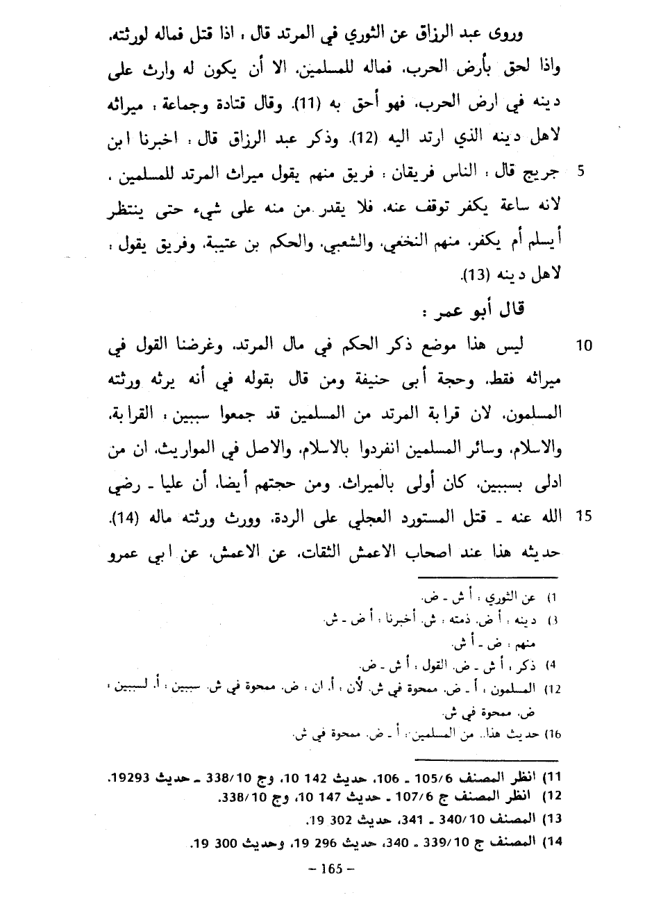وَرَوَى عَبْدُ الرَّزَّاقِ عَنِ الثَّوْرِيِّ فِي الْمُرْتَدِّ قَالَ إِذَا قُتِلَ فَمَالُهُ لِوَرَثَتِهِ وَإِذَا لَحِقَ بِأَرْضِ الْحَرْبِ فَمَالُهُ لِلْمُسْلِمِينَ إِلَّا أَنْ يَكُونَ لَهُ وَارِثٌ عَلَى دِينِهِ فِي أَرْضِ الْحَرْبِ فَهُوَ أَحَقُّ بِهِ وَقَالَ قَتَادَةُ وَجَمَاعَةٌ مِيرَاثُهُ لِأَهْلِ دِينِهِ الَّذِي ارْتَدَّ إِلَيْهِ وَذَكَرَ عَبْدُ الرَّزَّاقِ قَالَ أَخْبَرَنَا ابْنُ جُرَيْجٍ قَالَ النَّاسُ فَرِيقَانِ فَرِيقٌ مِنْهُمْ يَقُولُ مِيرَاثُ الْمُرْتَدِّ لِلْمُسْلِمِينَ لِأَنَّهُ سَاعَةَ يَكْفُرُ تُوقَفُ عَنْهُ فَلَا يَقْدِرُ مَنْ مِنْهُ عَلَى شَيْءٍ حَتَّى يَنْتَظِرَ أَيُسْلِمُ أَمْ يَكْفُرُ مِنْهُمْ النَّخَعِيِّ وَالشَّعْبِيُّ وَالْحَكَمُ بْنُ عُتَيْبَةَ وَفَرِيقٌ يَقُولُ لِأَهْلِ دِينِهِ قَالَ أَبُو عُمَرَ لَيْسَ هَذَا مَوْضِعَ ذِكْرِ الْحُكْمِ فِي مَالِ الْمُرْتَدِّ وَغَرَضُنَا الْقَوْلُ فِي مِيرَاثِهِ فَقَطْ وَحُجَّةُ أَبِي حَنِيفَةَ وَمَنْ قَالَ بِقَوْلِهِ فِي أَنَّهُ يَرِثُهُ وَرَثَتُهُ الْمُسْلِمُونَ لِأَنَّ قَرَابَةَ الْمُرْتَدِّ مِنَ الْمُسْلِمِينَ قَدْ جَمَعُوا سَبَبَيْنِ الْقَرَابَةَ وَالْإِسْلَامَ وَسَائِرُ الْمُسْلِمِينَ انْفَرَدُوا بِالْإِسْلَامِ وَالْأَصْلُ فِي الْمَوَارِيثِ أَنَّ مَنْ أَدْلَى بِسَبَبَيْنِ كَانَ أَوْلَى بِالْمِيرَاثِ وَمِنْ حُجَّتِهِمْ أَيْضًا أَنَّ عَلِيًّا رَضِيَ اللَّهُ عَنْهُ قَتَلَ الْمُسْتَوْرِدَ الْعَجَلِيَّ عَلَى الرِّدَّةِ وَوَرَّثَ وَرَثَتَهُ مَالَهُ حَدِيثُهُ هَذَا عِنْدَ أَصْحَابِ الْأَعْمَشِ الثِّقَاتِ عَنِ الْأَعْمَشِ عَنْ أَبِي عَمْرٍو