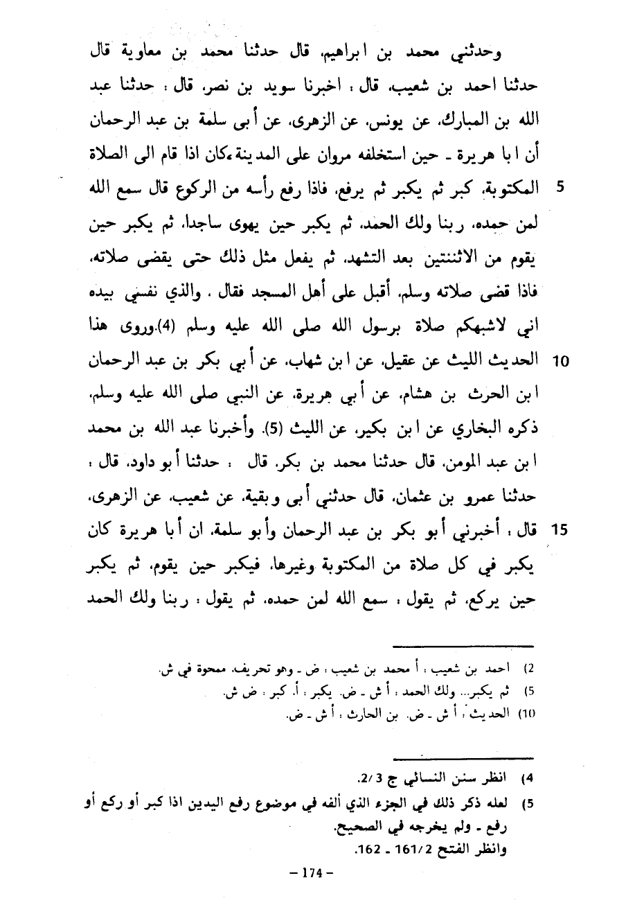 وَحَدَّثَنِي مُحَمَّدُ بْنُ إِبْرَاهِيمَ قَالَ حَدَّثَنَا مُحَمَّدُ بْنُ مُعَاوِيَةَ قَالَ حَدَّثَنَا أَحْمَدُ بْنُ شُعَيْبٍ قَالَ أَخْبَرَنَا سُوِيدُ بْنُ نَصْرٍ قَالَ حَدَّثَنَا عَبْدُ اللَّهِ بْنُ الْمُبَارَكِ عَنْ يُونُسَ عَنِ الزُّهْرِيُّ عَنْ أَبِي سَلَمَةَ بْنِ عَبْدِ الرحمان أَنَّ أَبَا هُرَيْرَةَ حِينَ اسْتَخْلَفَهُ مَرْوَانُ عَلَى الْمَدِينَةِ كَانَ إِذَا قَامَ إِلَى الصَّلَاةِ الْمَكْتُوبَةِ كَبَّرَ ثُمَّ يُكَبِّرُ ثُمَّ يَرْفَعُ فَإِذَا رَفَعَ رَأْسَهُ مِنَ الرُّكُوعِ قَالَ سَمِعَ اللَّهُ لِمَنْ حَمِدَهُ رَبَّنَا وَلَكَ الْحَمْدُ ثُمَّ يُكَبِّرُ حِينَ يَهْوِي سَاجِدًا ثُمَّ يُكَبِّرُ حِينَ يَقُومُ مِنَ الِاثْنَتَيْنِ بَعْدَ التَّشَهُّدِ ثُمَّ يَفْعَلُ مِثْلَ ذَلِكَ حَتَّى يَقْضِيَ صِلَاتَهُ فَإِذَا قَضَى صِلَاتَهُ وَسَلَّمَ أَقْبَلَ عَلَى أَهْلِ الْمَسْجِدِ فَقَالَ وَالَّذِي نَفْسِي بِيَدِهِ إِنِّي لَأَشْبَهُكُمْ صَلَاةً بِرَسُولِ اللَّهِ صَلَّى اللَّهُ عَلَيْهِ وَسَلَّمَ وَرَوَى هَذَا الْحَدِيثَ اللَّيْثُ عَنْ عُقَيْلٍ عَنِ ابْنِ شِهَابٍ عَنْ أَبِي بَكْرِ بْنِ عبد الرحمان بن الحرث بْنِ هِشَامٍ عَنْ أَبِي هُرَيْرَةَ عَنِ النَّبِيِّ صَلَّى اللَّهُ عَلَيْهِ وَسَلَّمَ ذَكَرَهُ الْبُخَارِيُّ عَنِ ابْنِ بُكَيْرٍ عَنِ اللَّيْثِ وَأَخْبَرَنَا عَبْدُ اللَّهِ بْنُ مُحَمَّدِ بْنِ عَبْدِ الْمُؤْمِنِ قَالَ حَدَّثَنَا مُحَمَّدُ بْنُ بَكْرٍ قَالَ حَدَّثَنَا أَبُو دَاوُدَ قَالَ حَدَّثَنَا عَمْرُو بْنُ عُثْمَانَ قَالَ حَدَّثَنِي أَبِي وَبَقِيَّةُ عَنْ شُعَيْبٍ عَنِ الزُّهْرِيِّ قَالَ أَخْبَرَنِي أَبُو بَكْرِ بن عبد الرحمان وَأَبُو سَلَمَةَ أَنَّ أَبَا هُرَيْرَةَ كَانَ يُكَبِّرُ فِي كُلِّ صَلَاةٍ مِنَ الْمَكْتُوبَةِ وَغَيْرِهَا فَيُكَبِّرُ حِينَ يَقُومُ ثُمَّ يُكَبِّرُ حِينَ يَرْكَعُ ثُمَّ يَقُولُ سَمِعَ اللَّهُ لِمَنْ حَمِدَهُ ثُمَّ يَقُولُ رَبَّنَا وَلَكَ الْحَمْدُ