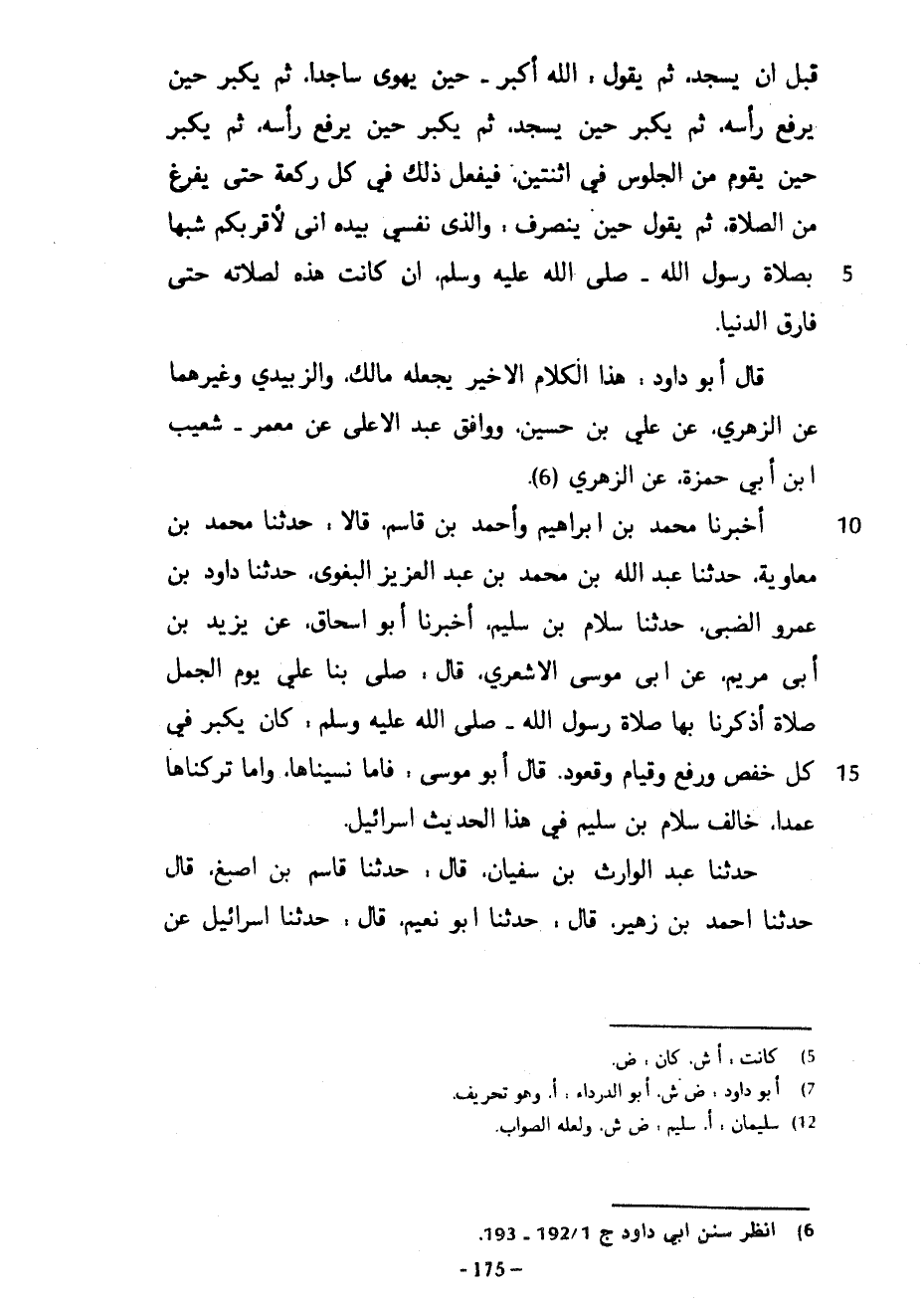 قَبْلَ أَنْ يَسْجُدَ ثُمَّ يَقُولُ اللَّهُ أَكْبَرُ حِينَ يَهْوِي سَاجِدًا ثُمَّ يُكَبِّرُ حِينَ يَرْفَعُ رَأْسَهُ ثُمَّ يُكَبِّرُ حِينَ يَسْجُدُ ثُمَّ يُكَبِّرُ حِينَ يَرْفَعُ رَأْسَهُ ثُمَّ يُكَبِّرُ حِينَ يَقُومُ مِنَ الْجُلُوسِ فِي اثْنَتَيْنِ فَيَفْعَلُ ذَلِكَ فِي كل ركعة حتى يفرغ مِنَ الصَّلَاةِ ثُمَّ يَقُولُ حِينَ يَنْصَرِفُ وَالَّذِي نَفْسِي بِيَدِهِ إِنِّي لَأَقْرَبُكُمْ شَبَهًا بِصَلَاةِ رَسُولِ اللَّهِ صَلَّى اللَّهُ عَلَيْهِ وَسَلَّمَ إِنْ كَانَتْ هَذِهِ لَصَلَاتُهُ حَتَّى فَارَقَ الدُّنْيَا قَالَ أَبُو دَاوُدَ هَذَا الْكَلَامُ الْأَخِيرُ يَجْعَلُهُ مَالِكٌ وَالزُّبَيْدِيُّ وَغَيْرُهُمَا عَنِ الزُّهْرِيِّ عَنْ عَلِيِّ بْنِ حُسَيْنٍ وَوَافَقَ عَبْدُ الْأَعْلَى عَنْ مَعْمَرٍ شُعَيْبَ بْنَ أَبِي حَمْزَةَ عَنِ الزُّهْرِيِّ أَخْبَرَنَا مُحَمَّدُ بْنُ إِبْرَاهِيمَ وَأَحْمَدُ بْنُ قَاسِمٍ قَالَا حَدَّثَنَا مُحَمَّدُ بْنُ مُعَاوِيَةَ حَدَّثَنَا عَبْدُ اللَّهِ بْنُ مُحَمَّدِ بْنِ عَبْدِ الْعَزِيزِ الْبَغَوِيُّ حَدَّثَنَا دَاوُدُ بْنُ عَمْرٍو الضَّبِّيُّ حَدَّثَنَا سَلَّامُ بْنُ سُلَيْمٍ أَخْبَرَنَا أَبُو إِسْحَاقَ عَنْ يَزِيدَ بْنِ أَبِي مَرْيَمَ عَنْ أَبِي مُوسَى الْأَشْعَرِيِّ قَالَ صَلَّى بِنَا عَلِيٌّ يَوْمَ الْجَمَلِ صَلَاةً أَذْكَرَنَا بِهَا صَلَاةَ رسول الله صلى الله عليه وسلم كان يُكَبِّرُ فِي كُلِّ خَفْضٍ وَرَفْعٍ وَقِيَامٍ وَقُعُودٍ قَالَ أَبُو مُوسَى فَإِمَّا نَسِينَاهَا وَإِمَّا تَرَكْنَاهَا عَمْدًا خَالَفَ سَلَّامُ بْنُ سُلَيْمٍ فِي هَذَا الْحَدِيثِ إِسْرَائِيلَ حَدَّثَنَا عَبْدُ الْوَارِثِ بْنُ سُفْيَانَ قَالَ حَدَّثَنَا قَاسِمُ بْنُ أَصْبَغَ قَالَ حَدَّثَنَا أَحْمَدُ بْنُ زُهَيْرٍ قَالَ حَدَّثَنَا أَبُو نُعَيْمٍ قَالَ حَدَّثَنَا إِسْرَائِيلُ عَنْ
