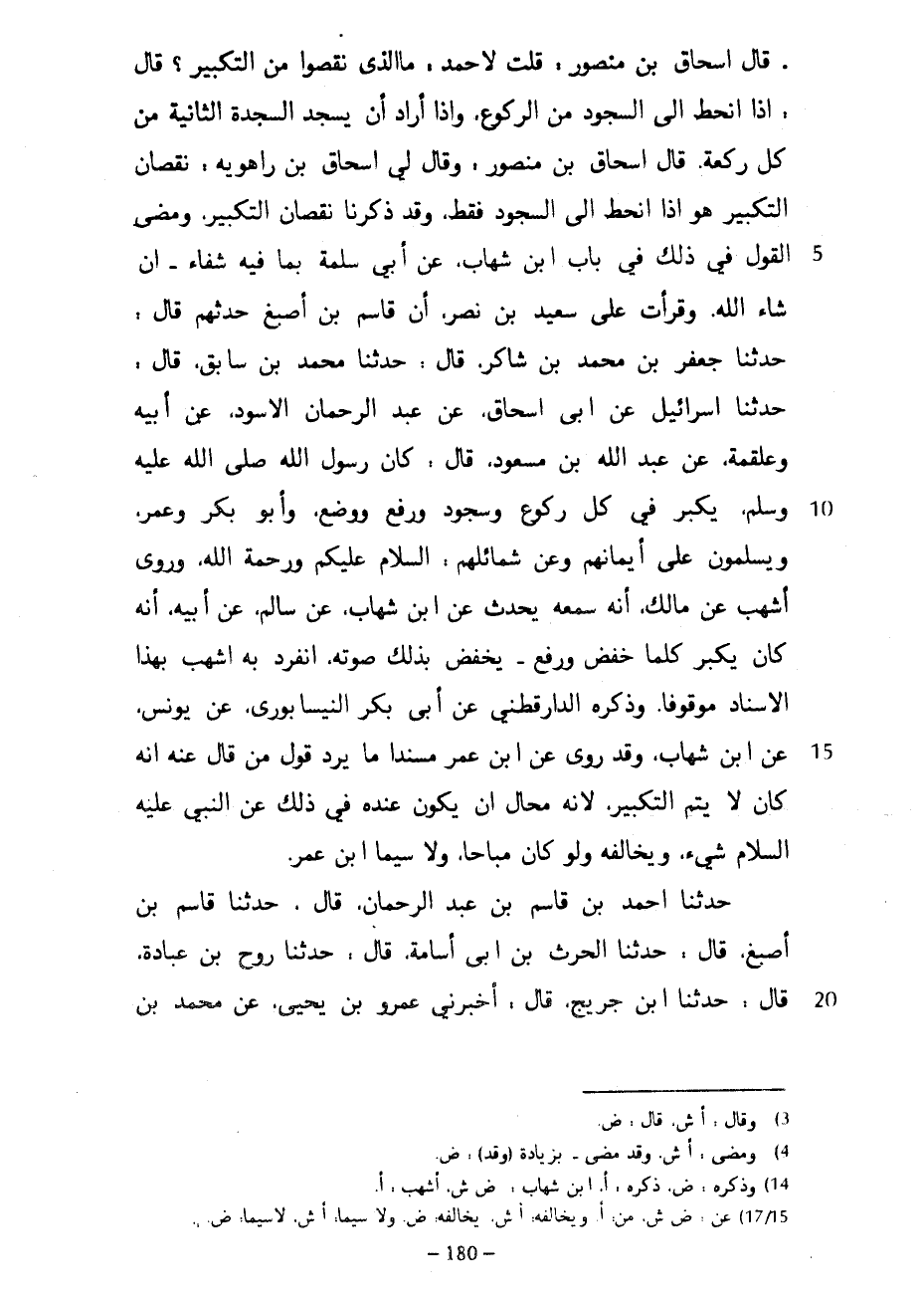 قَالَ إِسْحَاقُ بْنُ مَنْصُورٍ قُلْتُ لِأَحْمَدَ مَا الَّذِي نَقَصُوا مِنَ التَّكْبِيرِ قَالَ إِذَا انْحَطَّ إِلَى السُّجُودِ مِنَ الرُّكُوعِ وَإِذَا أَرَادَ أَنْ يَسْجُدَ السَّجْدَةَ الثَّانِيَةَ مِنْ كُلِّ رَكْعَةٍ قَالَ إِسْحَاقُ بْنُ مَنْصُورٍ وَقَالَ لِي إِسْحَاقُ بْنُ رَاهَوَيْهِ نُقْصَانُ التَّكْبِيرِ هُوَ إِذَا انْحَطَّ إِلَى السُّجُودِ فَقَطْ وَقَدْ ذَكَرْنَا نُقْصَانَ التَّكْبِيرِ وَمَضَى الْقَوْلُ فِي ذَلِكَ فِي بَابِ ابْنِ شِهَابٍ عَنِ أَبِي سَلَمَةَ بِمَا فِيهِ شِفَاءٌ إِنْ شَاءَ اللَّهُ وَقَرَأْتُ عَلَى سَعِيدِ بْنِ نَصْرٍ أَنَّ قَاسِمَ بْنَ أَصْبَغَ حَدَّثَهُمْ قَالَ حَدَّثَنَا جَعْفَرُ بْنُ مُحَمَّدِ بْنِ شَاكِرٍ قَالَ حَدَّثَنَا مُحَمَّدُ بْنُ سَابِقٍ قَالَ حَدَّثَنَا إِسْرَائِيلُ عَنْ أَبِي إِسْحَاقَ عَنْ عبد الرحمان الْأَسْوَدِ عَنِ أبِيهِ وَعَلْقَمَةَ عَنْ عَبْدِ اللَّهِ بْنِ مَسْعُودٍ قَالَ كَانَ رَسُولُ اللَّهِ صَلَّى اللَّهُ عَلَيْهِ وَسَلَّمَ يُكَبِّرُ فِي كُلِّ رُكُوعٍ وَسُجُودٍ وَرَفْعٍ وَوَضْعٍ وَأَبُو بَكْرٍ وَعُمَرُ وَيُسَلِّمُونَ عَلَى أَيْمَانِهِمْ وَعَنْ شَمَائِلِهِمْ السَّلَامُ عَلَيْكُمْ وَرَحْمَةُ اللَّهِ وَرَوَى أَشْهَبُ عَنْ مَالِكٍ أَنَّهُ سَمِعَهُ يُحَدِّثُ عَنِ ابْنِ شِهَابٍ عَنْ سَالِمٍ عَنْ أَبِيهِ أَنَّهُ كَانَ يُكَبِّرُ كُلَّمَا خَفَضَ وَرَفَعَ يَخْفِضُ بِذَلِكَ صَوْتَهُ انْفَرَدَ بِهِ أَشْهَبُ بِهَذَا الْإِسْنَادِ مَوْقُوفًا وَذَكَرَهُ الدَّارَقُطْنِيُّ عَنْ أَبِي بَكْرٍ النَّيْسَابُورِيِّ عَنْ يُونُسَ عَنِ ابْنِ شِهَابٍ وَقَدْ رُوِيَ عَنِ ابْنِ عُمَرَ مُسْنَدًا مَا يَرُدُّ قَوْلَ مَنْ قَالَ عَنْهُ أَنَّهُ كَانَ لَا يُتِمُّ التَّكْبِيرَ لِأَنَّهُ مُحَالٌ أَنْ يَكُونَ عِنْدَهُ فِي ذَلِكَ عَنِ النَّبِيِّ عَلَيْهِ السَّلَامُ شَيْءٌ وَيُخَالِفُهُ وَلَوْ كَانَ مُبَاحًا وَلَا سِيَّمَا ابْنُ عُمَرَ حَدَّثَنَا أَحْمَدُ بْنُ قَاسِمِ بْنِ عَبْدِ الرحمان قَالَ حَدَّثَنَا قَاسِمُ بْنُ أَصْبَغَ قَالَ حَدَّثَنَا الحرث بْنُ أَبِي أُسَامَةَ قَالَ حَدَّثَنَا رَوْحُ بْنُ عُبَادَةَ قَالَ حَدَّثَنَا ابْنُ جُرَيْجٍ قَالَ أَخْبَرَنِي عَمْرُو بْنُ يَحْيَى عَنْ مُحَمَّدِ بْنِ