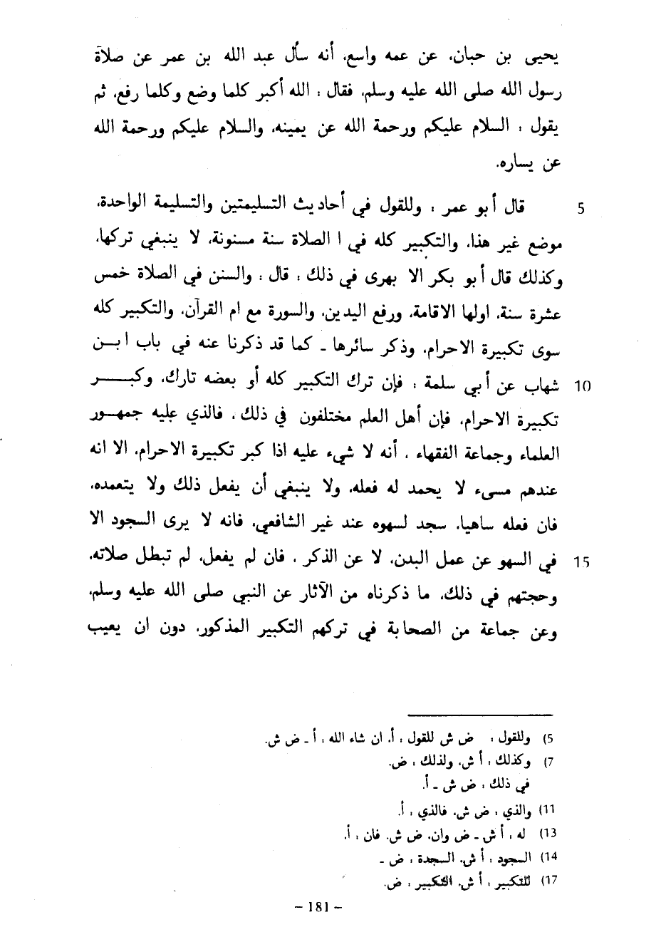 يَحْيَى بْنِ حَبَّانَ عَنْ عَمِّهِ وَاسِعٍ أَنَّهُ سَأَلَ عَبْدَ اللَّهِ بْنَ عُمَرَ عَنْ صَلَاةِ رَسُولِ اللَّهِ صَلَّى اللَّهُ عَلَيْهِ وسلم فقال اللَّهُ أَكْبَرُ كُلَّمَا وَضَعَ وَكُلَّمَا رَفَعَ ثُمَّ يَقُولُ السَّلَامُ عَلَيْكُمْ وَرَحْمَةُ اللَّهِ عَنْ يَمِينِهِ وَالسَّلَامُ عَلَيْكُمْ وَرَحْمَةُ اللَّهِ عَنْ يَسَارِهِ قَالَ أَبُو عُمَرَ وَلِلْقَوْلِ فِي أَحَادِيثِ التَّسْلِيمَتَيْنِ والتَّسْلِيمَةِ الْوَاحِدَةِ مَوْضِعٌ غَيْرُ هَذَا وَالتَّكْبِيرُ كُلُّهُ فِي الصَّلَاةِ سُنَّةٌ مَسْنُونَةٌ لَا يَنْبَغِي تَرْكُهَا وَكَذَلِكَ قَالَ أَبُو بَكْرٍ الْأَبْهَرِيُّ فِي ذَلِكَ قَالَ وَالسُّنَنُ فِي الصَّلَاةِ خَمْسَ عَشْرَةَ سُنَّةً أَوَّلُهَا الْإِقَامَةُ وَرَفْعُ الْيَدَيْنِ وَالسُّورَةُ مَعَ أُمِّ الْقُرْآنِ وَالتَّكْبِيرُ كله سوى تكبيرة الْإِحْرَامِ وَذَكَرَ سَائِرَهَا كَمَا قَدْ ذَكَرْنَا عَنْهُ فِي بَابِ ابْنِ شِهَابٍ عَنْ أَبِي سَلَمَةَ فَإِنْ تَرَكَ التَّكْبِيرَ كُلَّهُ أَوْ بَعْضَهُ تَارِكٌ وكبر تكبيرة الْإِحْرَامَ فَإِنَّ أَهْلَ الْعِلْمِ مُخْتَلِفُونَ فِي ذَلِكَ فَالَّذِي عَلَيْهِ جُمْهُورُ الْعُلَمَاءِ وَجَمَاعَةُ الْفُقَهَاءِ أَنَّهُ لا شيء عليه إذا كبر تكبيرة الْإِحْرَامَ إِلَّا أَنَّهُ عِنْدَهُمْ مُسِيءٌ لَا يُحْمَدُ لَهُ فِعْلُهُ وَلَا يَنْبَغِي أَنْ يَفْعَلَ ذَلِكَ وَلَا يَتَعَمَّدُهُ فَإِنْ فَعَلَهُ سَاهِيًا سَجَدَ لِسَهْوِهِ عِنْدَ غَيْرِ الشَّافِعِيِّ فَإِنَّهُ لَا يَرَى السُّجُودَ إِلَّا فِي السَّهْوِ عَنْ عَمَلِ الْبَدَنِ لَا عَنِ الذِّكْرِ فَإِنْ لَمْ يَفْعَلْ لَمْ تَبْطُلْ صَلَاتُهُ وَحُجَّتُهُمْ فِي ذَلِكَ مَا ذَكَرْنَاهُ مِنَ الْآثَارِ عَنِ النَّبِيِّ صَلَّى اللَّهُ عَلَيْهِ وَسَلَّمَ وَعَنْ جَمَاعَةٍ مِنَ الصَّحَابَةِ فِي تَرْكِهِمُ التَّكْبِيرَ المذكور دون أن يعيب