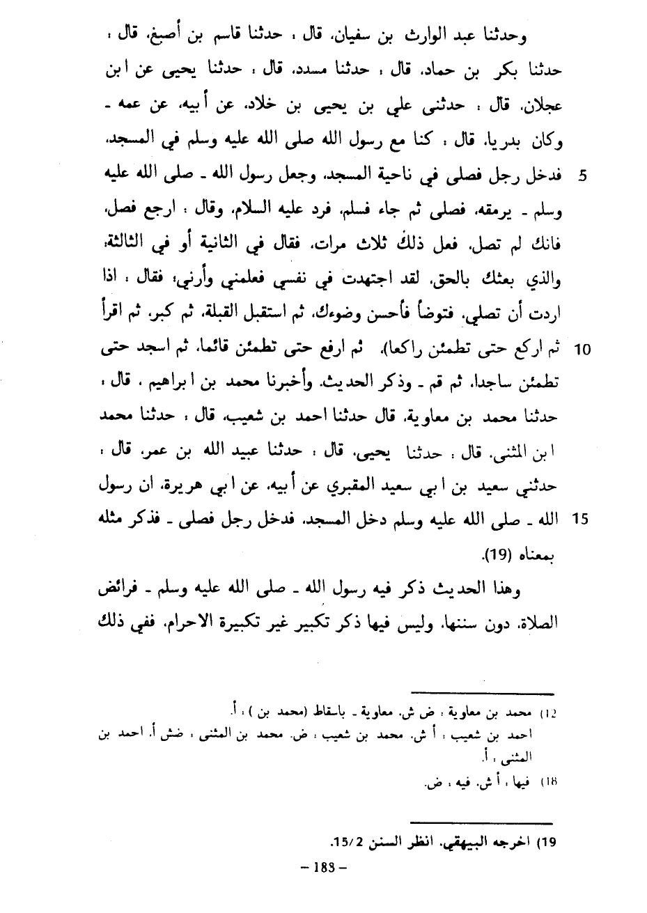 وَحَدَّثَنَا عَبْدُ الْوَارِثِ بْنُ سُفْيَانَ قَالَ حَدَّثَنَا قَاسِمُ بْنُ أَصْبَغَ قَالَ حَدَّثَنَا بَكْرُ بْنُ حماد قال حدثنا مسدد قال حدثا يَحْيَى عَنِ ابْنِ عَجْلَانَ قَالَ حَدَّثَنِي عَلِيُّ بْنُ يَحْيَى بْنِ خَلَّادٍ عَنِ أبِيهِ عَنْ عَمِّهِ وَكَانَ بَدْرِيًّا قَالَ كُنَّا مَعَ رَسُولِ اللَّهِ صَلَّى اللَّهُ عَلَيْهِ وَسَلَّمَ فِي الْمَسْجِدِ فَدَخَلَ رَجُلٌ فَصَلَّى فِي نَاحِيَةِ الْمَسْجِدِ وَجَعَلَ رَسُولُ اللَّهِ صَلَّى اللَّهُ عَلَيْهِ وَسَلَّمَ يَرْمُقُهُ فصلى ثم جاء فسلم فَرَدَّ عَلَيْهِ السَّلَامَ وَقَالَ ارْجِعْ فَصَلِّ فَإِنَّكَ لَمْ تُصَلِّ فَعَلَ ذَلِكَ ثَلَاثَ مَرَّاتٍ فَقَالَ فِي الثَّانِيَةِ أَوْ فِي الثَّالِثَةِ وَالَّذِي بَعَثَكَ بِالْحَقِّ لَقَدِ اجْتَهَدْتُ فِي نَفْسِي فَعَلِّمْنِي وَأَرِنِي فقال إذا أردت أن تصلي فتوضأ فأحسن وُضُوءَكَ ثُمَّ اسْتَقْبِلِ الْقِبْلَةَ ثُمَّ كَبِّرْ ثُمَّ اقْرَأْ ثُمَّ ارْكَعْ حَتَّى تَطْمَئِنَّ رَاكِعًا) ثُمَّ ارْفَعْ حَتَّى تَطْمَئِنَّ قَائِمًا ثُمَّ اسْجُدْ حَتَّى تَطْمَئِنَّ سَاجِدًا ثُمَّ قُمْ وَذَكَرَ الْحَدِيثَ وَأَخْبَرَنَا مُحَمَّدُ بْنُ إِبْرَاهِيمَ قَالَ حَدَّثَنَا مُحَمَّدُ بْنُ مُعَاوِيَةَ قَالَ حَدَّثَنَا أَحْمَدُ بْنُ شُعَيْبٍ قَالَ حَدَّثَنَا مُحَمَّدُ بْنُ الْمُثَنَّى قَالَ حَدَّثَنَا يَحْيَى قَالَ حَدَّثَنَا عُبَيْدُ اللَّهِ بْنُ عُمَرَ قَالَ حَدَّثَنِي سَعِيدُ بْنُ أَبِي سَعِيدٍ الْمَقْبُرِيُّ عَنْ أَبِيهِ عَنْ أَبِي هُرَيْرَةَ أَنَّ رَسُولَ اللَّهِ صَلَّى اللَّهُ عَلَيْهِ وَسَلَّمَ دَخَلَ الْمَسْجِدَ فَدَخَلَ رَجُلٌ فَصَلَّى فَذَكَرَ مِثْلَهُ بِمَعْنَاهُ وَهَذَا الْحَدِيثُ ذَكَرَ فِيهِ رَسُولُ اللَّهِ صَلَّى اللَّهُ عَلَيْهِ وَسَلَّمَ فَرَائِضَ الصَّلَاةِ دُونَ سُنَنِهَا وَلَيْسَ فِيهَا ذِكْرُ تَكْبِيرٍ غَيْرَ تَكْبِيرَةِ الْإِحْرَامِ فَفِي ذَلِكَ