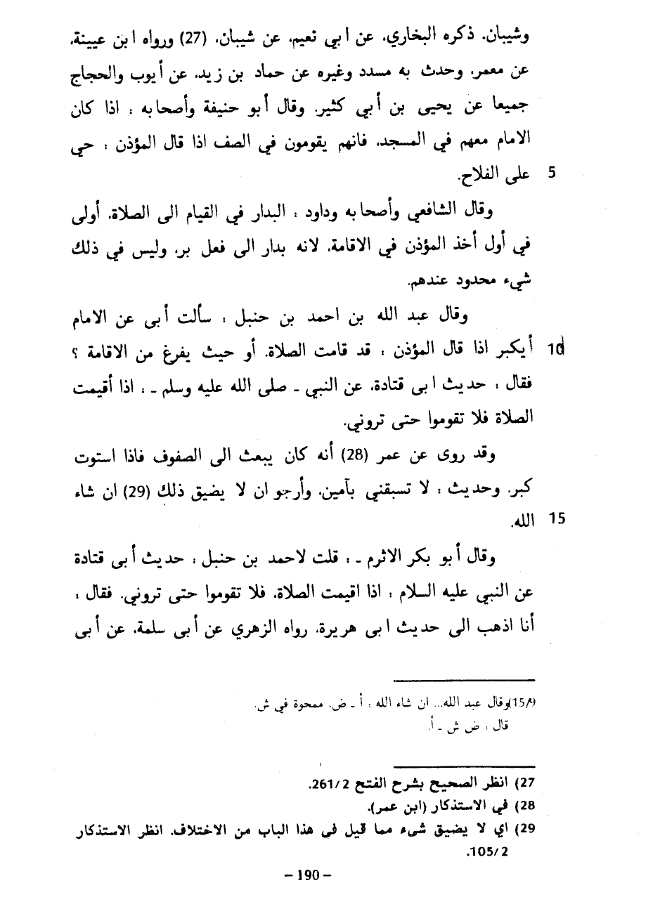 وَشَيْبَانُ ذَكَرَهُ الْبُخَارِيُّ عَنْ أَبِي نُعَيْمٍ عَنْ شَيْبَانَ وَرَوَاهُ ابْنُ عُيَيْنَةَ عَنْ مَعْمَرٍ وَحَدَّثَ بِهِ مُسَدَّدٌ وَغَيْرُهُ عَنْ حَمَّادِ بْنِ زَيْدٍ عَنْ أَيُّوبَ وَالْحَجَّاجِ جَمِيعًا عَنْ يَحْيَى بْنِ أَبِي كَثِيرٍ وَقَالَ أَبُو حَنِيفَةَ وَأَصْحَابُهُ إِذَا كَانَ الْإِمَامُ مَعَهُمْ فِي الْمَسْجِدِ فَإِنَّهُمْ يَقُومُونَ فِي الصَّفِّ إِذَا قَالَ الْمُؤَذِّنُ حَيَّ عَلَى الْفَلَاحِ وَقَالَ الشَّافِعِيُّ وَأَصْحَابُهُ وَدَاوُدُ الْبِدَارُ فِي الْقِيَامِ إِلَى الصَّلَاةِ أَوْلَى فِي أَوَّلِ أَخْذِ الْمُؤَذِّنِ فِي الْإِقَامَةِ لِأَنَّهُ بِدَارٌ إِلَى فِعْلِ بِرٍّ وَلَيْسَ فِي ذَلِكَ شَيْءٌ مَحْدُودٌ عِنْدَهُمْ وَقَالَ عَبْدُ اللَّهِ بْنُ أَحْمَدَ بْنِ حَنْبَلٍ سَأَلْتُ أَبِي عَنِ الْإِمَامِ أَيُكَبِّرُ إِذَا قَالَ الْمُؤَذِّنُ قَدْ قَامَتِ الصَّلَاةُ أَوْ حَيْثُ يَفْرُغُ مِنَ الْإِقَامَةِ فَقَالَ حَدِيثِ أَبِي قَتَادَةَ عَنِ النَّبِيِّ صَلَّى اللَّهُ عَلَيْهِ وَسَلَّمَ إِذَا أُقِيمَتِ الصَّلَاةُ فَلَا تَقُومُوا حَتَّى تَرَوْنِي وَقَدْ رُوِيَ عَنْ عُمَرَ أَنَّهُ كَانَ يَبْعَثُ إِلَى الصُّفُوفِ فَإِذَا اسْتَوَتْ كَبَّرَ وَحَدِيثُ لَا تَسْبِقْنِي بِآمِينَ وَأَرْجُو أَنْ لَا يُضَيِّقَ ذَلِكَ إِنْ شَاءَ اللَّهُ وَقَالَ أَبُو بَكْرٍ الْأَثْرَمُ قُلْتُ لِأَحْمَدَ بْنِ حَنْبَلٍ حَدِيثِ أَبِي قَتَادَةَ عَنِ النَّبِيِّ عَلَيْهِ السَّلَامُ إِذَا أُقِيمَتِ الصَّلَاةُ فَلَا تَقُومُوا حَتَّى تَرَوْنِي فَقَالَ أَنَا أَذْهَبُ إِلَى حَدِيثِ أَبِي هُرَيْرَةَ رَوَاهُ الزُّهْرِيِّ عَنْ أَبِي سَلَمَةَ عَنْ أَبِي