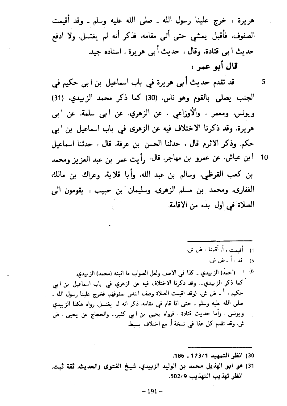 هُرَيْرَةَ خَرَجَ عَلَيْنَا رَسُولُ اللَّهِ صَلَّى اللَّهُ عَلَيْهِ وَسَلَّمَ وَقَدْ أُقِيمَتِ الصُّفُوفُ فَأَقْبَلَ يَمْشِي حَتَّى أَتَى مَقَامَهُ فَذَكَرَ أَنَّهُ لَمْ يَغْتَسِلْ وَلَا أَدْفَعُ حَدِيثَ أَبِي قَتَادَةَ وَقَالَ حَدِيثُ أَبِي هُرَيْرَةَ إِسْنَادُهُ جَيِّدٌ قَالَ أَبُو عُمَرَ قَدْ تَقَدَّمَ حَدِيثُ أَبِي هُرَيْرَةَ فِي بَابِ إِسْمَاعِيلَ بْنِ أَبِي حَكِيمٍ فِي الْجُنُبِ يُصَلِّي بِالْقَوْمِ وَهُوَ نَاسٍ كَمَا ذَكَرَ مُحَمَّدٌ الزُّبَيْدِيُّ وَيُونُسُ وَمَعْمَرٌ وَالْأَوْزَاعِيُّ عَنِ الزُّهْرِيِّ عَنْ أَبِي سَلَمَةَ عَنْ أَبِي هُرَيْرَةَ وَقَدْ ذَكَرْنَا الِاخْتِلَافَ فِيهِ عَنِ الزُّهْرِيِّ فِي بَابِ إِسْمَاعِيلَ بْنِ أَبِي حَكَمٍ وَذَكَرَ الْأَثْرَمُ قَالَ حَدَّثَنَا الْحَسَنُ بْنُ عَرَفَةَ قَالَ حَدَّثَنَا إِسْمَاعِيلُ بْنُ عَيَّاشٍ عَنْ عَمْرِو بْنِ مُهَاجِرٍ قَالَ رَأَيْتُ عُمَرَ بْنَ عَبْدِ الْعَزِيزِ وَمُحَمَّدَ بْنَ كَعْبٍ الْقُرَظِيَّ وَسَالِمَ بْنَ عَبْدِ اللَّهِ وَأَبَا قِلَابَةَ وَعِرَاكَ بْنَ مَالِكٍ الْغِفَارِيَّ وَمُحَمَّدَ بْنَ مُسْلِمٍ الزُّهْرِيَّ وَسُلَيْمَانَ بْنَ حَبِيبٍ يَقُومُونَ إِلَى الصَّلَاةِ فِي أَوَّلِ بَدْءٍ مِنَ الْإِقَامَةِ