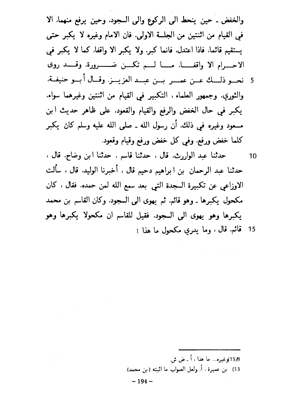 وَالْخَفْضِ حِينَ يَنْحَطُّ إِلَى الرُّكُوعِ وَإِلَى السُّجُودِ وَحِينَ يَرْفَعُ مِنْهُمَا إِلَّا فِي الْقِيَامِ مِنَ اثْنَتَيْنِ مِنَ الْجَلْسَةِ الْأُولَى فَإِنَّ الْإِمَامَ وَغَيْرَهُ لَا يُكَبِّرُ حَتَّى يَسْتَقِيمَ قَائِمًا فَإِذَا اعْتَدَلَ فَإِنَّمَا كَبَّرَ وَلَا يُكَبِّرُ إِلَّا وَاقِفًا كَمَا لَا يُكَبِّرُ فِي الْإِحْرَامِ إِلَّا وَاقِفًا مَا لَمْ تَكُنْ ضَرُورَةً وَقَدْ رُوِيَ نَحْوُ ذَلِكَ عَنْ عُمَرَ بْنِ عَبْدِ الْعَزِيزِ وَقَالَ أَبُو حَنِيفَةَ وَالثَّوْرِيُّ وَجُمْهُورُ الْعُلَمَاءِ التَّكْبِيرُ فِي الْقِيَامِ مِنَ اثْنَتَيْنِ وَغَيْرِهِمَا سَوَاءٌ يُكَبِّرُ فِي حَالِ الْخَفْضِ وَالرَّفْعِ وَالْقِيَامِ وَالْقُعُودِ عَلَى ظَاهِرِ حَدِيثِ ابْنِ مَسْعُودٍ وَغَيْرِهِ فِي ذَلِكَ أَنَّ رَسُولَ اللَّهِ صَلَّى اللَّهُ عَلَيْهِ وَسَلَّمَ كَانَ يُكَبِّرُ كُلَّمَا خَفَضَ وَرَفَعَ وَفِي كُلِّ خَفْضٍ وَرَفْعٍ وَقِيَامٍ وَقُعُودٍ حَدَّثَنَا عَبْدُ الْوَارِثِ قَالَ حَدَّثَنَا قَاسِمٌ حَدَّثَنَا ابْنُ وَضَّاحٍ قَالَ حَدَّثَنَا عَبْدُ الرحمان بْنُ إِبْرَاهِيمَ دُحَيْمٌ قَالَ أَخْبَرَنَا الْوَلِيدُ قَالَ سَأَلْتُ الْأَوْزَاعِيَّ عَنْ تَكْبِيرَةِ السَّجْدَةِ الَّتِي بَعْدَ سَمِعَ اللَّهُ لِمَنْ حَمِدَهُ فَقَالَ كَانَ مَكْحُولٌ يُكَبِّرُهَا وَهُوَ قَائِمٌ ثُمَّ يَهْوِي إِلَى السُّجُودِ وَكَانَ الْقَاسِمُ بْنُ مُحَمَّدٍ يُكَبِّرُهَا وَهُوَ يَهْوِي إِلَى السُّجُودِ فَقِيلَ لِلْقَاسِمِ إِنَّ مَكْحُولًا يُكَبِّرُهَا وَهُوَ قَائِمٌ قَالَ وَمَا يَدْرِي مَكْحُولٌ مَا هذا