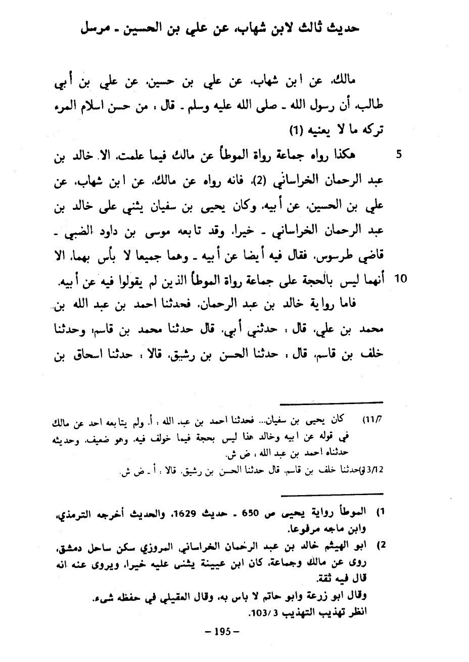 حَدِيثٌ ثَالِثٌ لِابْنِ شِهَابٍ عَنْ عَلِيِّ بْنِ الْحُسَيْنِ مُرْسَلٌ مَالِكٌ عَنِ ابْنِ شِهَابٍ عَنْ عَلِيِّ بْنِ حُسَيْنٍ عَنْ عَلِيِّ بْنِ أَبِي طَالِبٍ أَنَّ رَسُولَ اللَّهِ صَلَّى اللَّهُ عَلَيْهِ وَسَلَّمَ قَالَ مَنْ حسن إسلام المرء تركه مَا لَا يَعْنِيهِ هَكَذَا رَوَاهُ جَمَاعَةُ رُوَاةِ الْمُوَطَّأِ عَنْ مَالِكٍ فِيمَا عَلِمْتُ إِلَّا خَالِدَ بن عبد الرحمان الْخُرَاسَانِيَّ فَإِنَّهُ رَوَاهُ عَنْ مَالِكٍ عَنِ ابْنِ شِهَابٍ عَنْ عَلِيِّ بْنِ الْحُسَيْنِ عَنِ أبِيهِ وَكَانَ يَحْيَى بْنُ سُفْيَانَ يُثْنِي عَلَى خَالِدِ بن عبد الرحمان الْخُرَاسَانِيِّ خَيْرًا وَقَدْ تَابَعَهُ مُوسَى بْنُ دَاوُدَ الضَّبِّيُّ قَاضِي طَرْسُوسَ فَقَالَ فِيهِ أَيْضًا عَنِ أبِيهِ وَهُمَا جَمِيعًا لَا بَأْسَ بِهِمَا إِلَّا أَنَّهُمَا لَيْسَ بِالْحُجَّةِ عَلَى جَمَاعَةِ رُوَاةِ الْمُوَطَّأِ الَّذِينَ لَمْ يَقُولُوا فِيهِ عَنِ أبِيهِ فَأَمَّا رواية خالد بن عبد الرحمان فَحَدَّثَنَا أَحْمَدُ بْنُ عَبْدِ اللَّهِ بْنِ مُحَمَّدِ بْنِ عَلِيٍّ قَالَ حَدَّثَنِي أَبِي قَالَ حَدَّثَنَا مُحَمَّدُ بْنُ قَاسِمٍ وَحَدَّثَنَا خَلَفُ بْنُ قَاسِمٍ قَالَ حَدَّثَنَا الْحَسَنُ بْنُ رَشِيقٍ قَالَا حَدَّثَنَا إِسْحَاقُ بْنُ