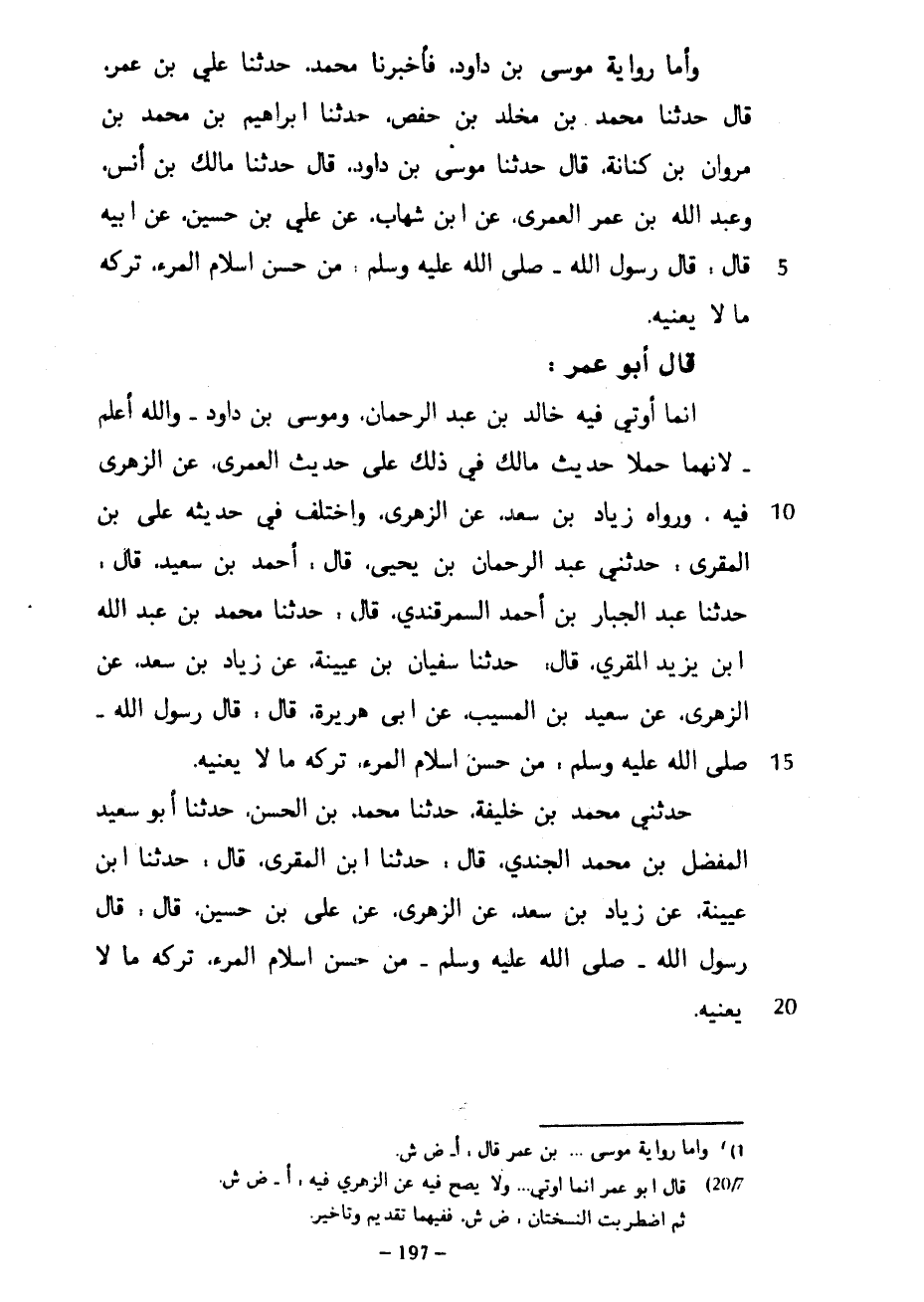 وَأَمَّا رِوَايَةُ مُوسَى بْنِ دَاوُدَ فَأَخْبَرَنَا مُحَمَّدٌ حَدَّثَنَا عَلِيُّ بْنُ عُمَرَ قَالَ حَدَّثَنَا مُحَمَّدُ بْنُ مَخْلَدِ بْنِ حَفْصٍ حَدَّثَنَا إِبْرَاهِيمُ بْنُ مُحَمَّدِ بْنِ مَرْوَانِ بْنِ كِنَانَةَ قَالَ حَدَّثَنَا مُوسَى بْنُ دَاوُدَ قَالَ حَدَّثَنَا مَالِكُ بْنُ أَنَسٍ وَعَبْدُ اللَّهِ بْنُ عُمَرَ الْعُمَرِيُّ عَنِ ابْنِ شِهَابٍ عَنْ عَلِيِّ بْنِ حُسَيْنٍ عَنْ أَبِيهِ قَالَ قَالَ رَسُولُ اللَّهِ صَلَّى الله عَلَيْهِ وَسَلَّمَ مِنْ حُسْنِ إِسْلَامِ الْمَرْءِ تَرْكُهُ مَا لَا يَعْنِيهِ قَالَ أَبُو عُمَرَ إِنَّمَا أوتي فيه خالد بن عبد الرحمان وَمُوسَى بْنُ دَاوُدَ وَاللَّهُ أَعْلَمُ لِأَنَّهُمَا حَمَلَا حَدِيثَ مَالِكٍ فِي ذَلِكَ عَلَى حَدِيثِ الْعُمَرِيِّ عَنِ الزُّهْرِيِّ فِيهِ وَرَوَاهُ زِيَادُ بْنُ سَعْدٍ عَنِ الزُّهْرِيِّ وَاخْتَلَفَ فِي حَدِيثِهِ عَلِيُّ بْنُ المقري حدثني عبد الرحمان بْنُ يَحْيَى قَالَ أَحْمَدُ بْنُ سَعِيدٍ قَالَ حَدَّثَنَا عَبْدُ الْجَبَّارِ بْنُ أَحْمَدَ السَّمَرْقَنْدِيُّ قَالَ حَدَّثَنَا مُحَمَّدُ بْنُ عَبْدِ اللَّهِ بْنِ يَزِيدَ الْمَقْرِيُّ قَالَ حَدَّثَنَا سُفْيَانُ بْنُ عُيَيْنَةَ عَنْ زِيَادِ بْنِ سَعْدٍ عَنِ الزُّهْرِيِّ عَنْ سَعِيدِ بْنِ الْمُسَيَّبِ عَنْ أَبِي هُرَيْرَةَ قَالَ قَالَ رَسُولُ اللَّهِ صَلَّى اللَّهُ عَلَيْهِ وَسَلَّمَ مِنْ حُسْنِ إسلام المرء تركه ما لا يعنيه حَدَّثَنِي مُحَمَّدُ بْنُ خَلِيفَةَ حَدَّثَنَا مُحَمَّدُ بْنُ الْحَسَنِ حَدَّثَنَا أَبُو سَعِيدٍ الْمُفَضَّلُ بْنُ مُحَمَّدٍ الْجُنْدِيُّ قَالَ حَدَّثَنَا ابْنُ الْمَقْرِيِّ قَالَ حَدَّثَنَا ابْنُ عُيَيْنَةَ عَنْ زِيَادِ بْنِ سَعْدٍ عَنِ الزُّهْرِيِّ عَنْ عَلِيِّ بْنِ حُسَيْنٍ قَالَ قَالَ رَسُولُ اللَّهِ صَلَّى اللَّهُ عَلَيْهِ وَسَلَّمَ من حسن إسلام المرء تركه ما لا يعنيه