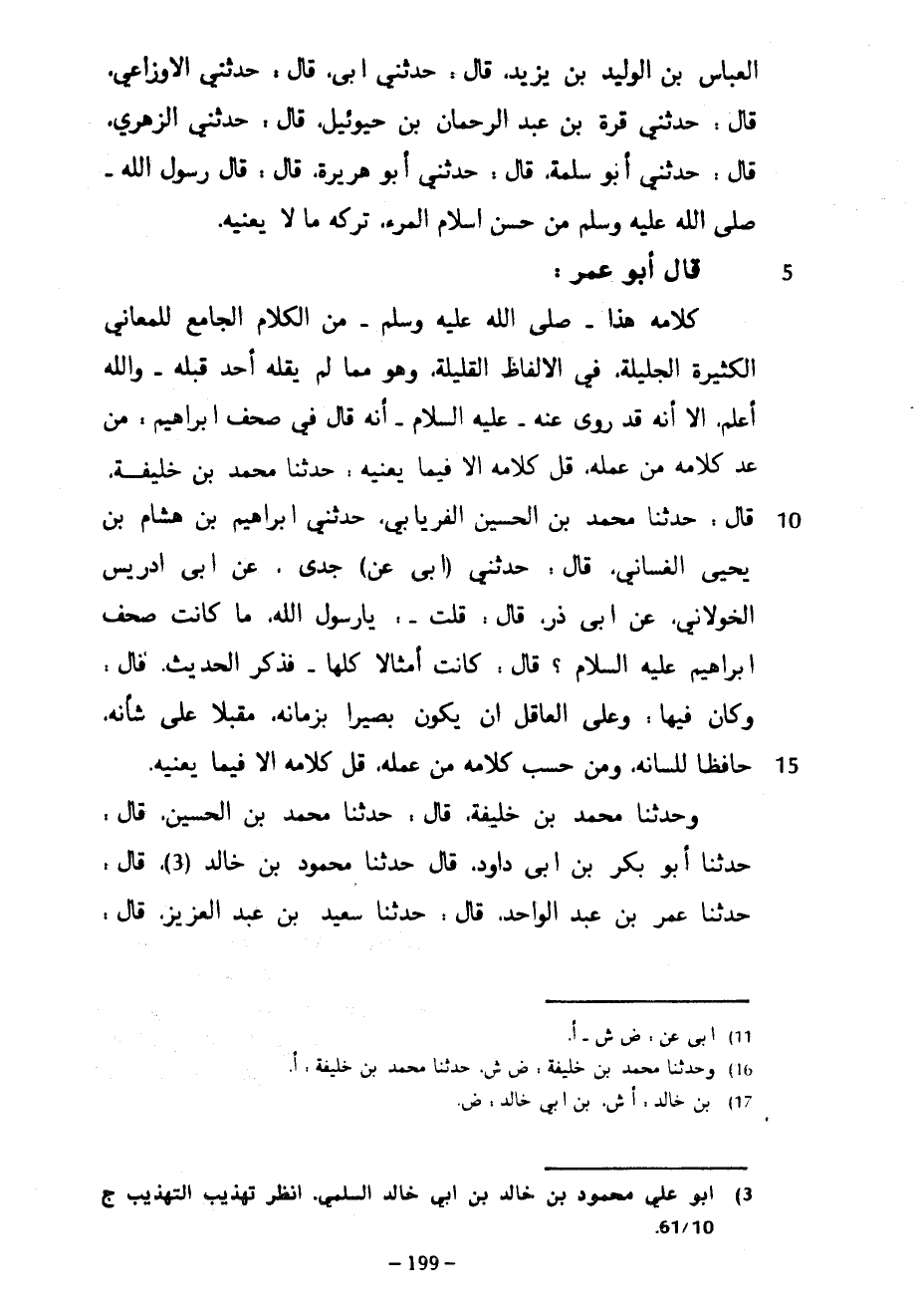 الْعَبَّاسُ بْنُ الْوَلِيدِ بْنِ يَزِيدَ قَالَ حَدَّثَنِي أبي قال حدثني الوزاعي قال حدثني قرة بن عبد الرحمان بْنِ حَيْوَئِيلَ قَالَ حَدَّثَنِي الزُّهْرِيُّ قَالَ حَدَّثَنِي أَبُو سَلَمَةَ قَالَ حَدَّثَنِي أَبُو هُرَيْرَةَ قَالَ قَالَ رَسُولُ اللَّهِ صَلَّى اللَّهُ عَلَيْهِ وَسَلَّمَ من حسن إسلام المرء تركه ما لا يَعْنِيهِ قَالَ أَبُو عُمَرَ كَلَامُهُ هَذَا صَلَّى اللَّهُ عَلَيْهِ وَسَلَّمَ مِنَ الْكَلَامِ الْجَامِعِ لِلْمَعَانِي الْكَثِيرَةِ الْجَلِيلَةِ فِي الْأَلْفَاظِ الْقَلِيلَةِ وَهُوَ مِمَّا لَمْ يَقُلْهُ أَحَدٌ قَبْلَهُ وَاللَّهُ أَعْلَمُ إِلَّا أَنَّهُ قَدْ رُوِيَ عَنْهُ عَلَيْهِ السَّلَامُ أَنَّهُ قَالَ فِي صُحُفِ إِبْرَاهِيمَ مَنْ عَدَّ كَلَامَهُ مِنْ عَمَلِهِ قَلَّ كَلَامُهُ إِلَّا فِيمَا يَعْنِيهِ حَدَّثَنَا مُحَمَّدُ بْنُ خَلِيفَةَ قَالَ حَدَّثَنَا مُحَمَّدُ بْنُ الْحُسَيْنِ الْفِرْيَابِيُّ حَدَّثَنِي إِبْرَاهِيمُ بْنُ هِشَامِ بْنِ يَحْيَى الْغَسَّانِيُّ قَالَ حَدَّثَنِي (أَبِي عَنْ) جَدِّي عَنْ أَبِي إِدْرِيسَ الْخَوْلَانِيِّ عَنْ أَبِي ذَرٍّ قَالَ قُلْتُ يَا رَسُولَ اللَّهِ مَا كَانَتْ صُحُفُ إِبْرَاهِيمَ عَلَيْهِ السَّلَامُ قَالَ كَانَتْ أَمْثَالًا كُلُّهَا فَذَكَرَ الْحَدِيثَ قَالَ وَكَانَ فِيهَا وَعَلَى الْعَاقِلِ أَنْ يَكُونَ بَصِيرًا بِزَمَانِهِ مُقْبِلًا عَلَى شَأْنِهِ حَافِظًا لِلِسَانِهِ وَمَنْ حَسَبَ كَلَامَهُ مِنْ عَمَلِهِ قَلَّ كَلَامُهُ إِلَّا فِيمَا يَعْنِيهِ وَحَدَّثَنَا مُحَمَّدُ بْنُ خَلِيفَةَ قَالَ حَدَّثَنَا مُحَمَّدُ بْنُ الْحُسَيْنِ قَالَ حَدَّثَنَا أَبُو بَكْرِ بْنُ أَبِي دَاوُدَ قَالَ حَدَّثَنَا مَحْمُودُ بْنُ خَالِدٍ قَالَ حَدَّثَنَا عُمَرُ بْنُ عَبْدِ الْوَاحِدِ قَالَ حَدَّثَنَا سَعِيدُ بْنُ عَبْدِ الْعَزِيزِ قَالَ
