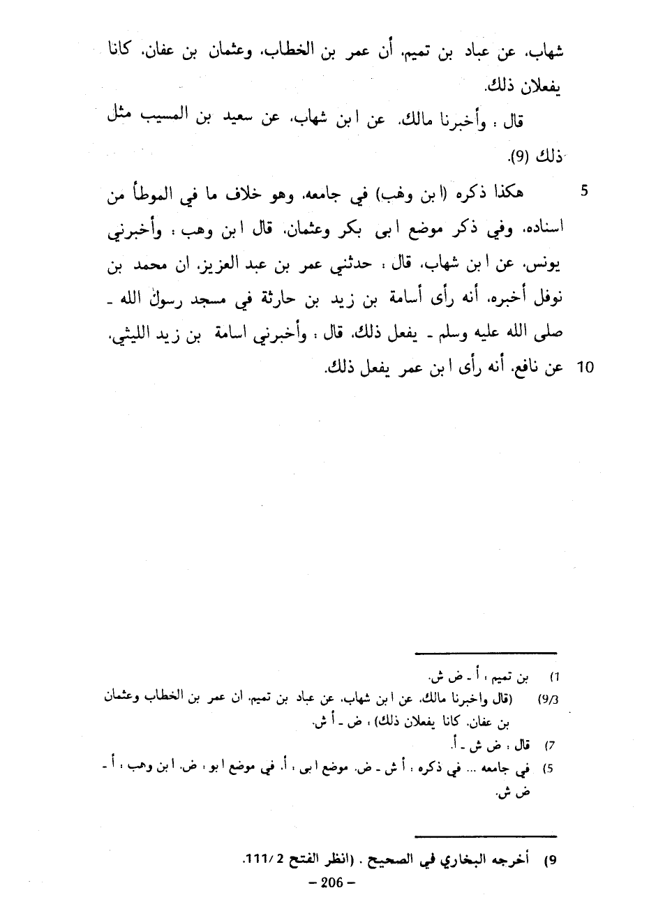 شِهَابٍ عَنْ عَبَّادِ بْنِ تَمِيمٍ أَنَّ عُمَرَ بْنَ الْخَطَّابِ وَعُثْمَانَ بْنَ عَفَّانَ كَانَا يَفْعَلَانِ ذَلِكَ قَالَ وَأَخْبَرَنَا مَالِكٌ عَنِ ابْنِ شِهَابٍ عَنْ سَعِيدِ بْنِ الْمُسَيَّبِ مِثْلَ ذَلِكَ هَكَذَا ذَكَرَهُ (ابْنُ وَهْبٍ) فِي جَامِعِهِ وَهُوَ خِلَافُ مَا فِي الْمُوَطَّأِ مِنْ إِسْنَادِهِ وَفِي ذِكْرِ مَوْضِعِ أَبِي بَكْرٍ وَعُثْمَانَ قَالَ ابْنُ وَهْبٍ وَأَخْبَرَنِي يُونُسُ عَنِ ابْنِ شِهَابٍ قَالَ حَدَّثَنِي عُمَرُ بْنُ عَبْدِ الْعَزِيزِ أَنَّ مُحَمَّدَ بْنَ نَوْفَلٍ أَخْبَرَهُ أَنَّهُ رَأَى أُسَامَةَ بْنَ زَيْدِ بْنِ حَارِثَةَ فِي مَسْجِدِ رَسُولِ اللَّهِ صَلَّى اللَّهُ عَلَيْهِ وَسَلَّمَ يَفْعَلُ ذَلِكَ قَالَ وَأَخْبَرَنِي أُسَامَةُ بْنُ زَيْدٍ اللَّيْثِيُّ عَنْ نَافِعٍ أَنَّهُ رَأَى ابْنَ عُمَرَ يَفْعَلُ ذَلِكَ