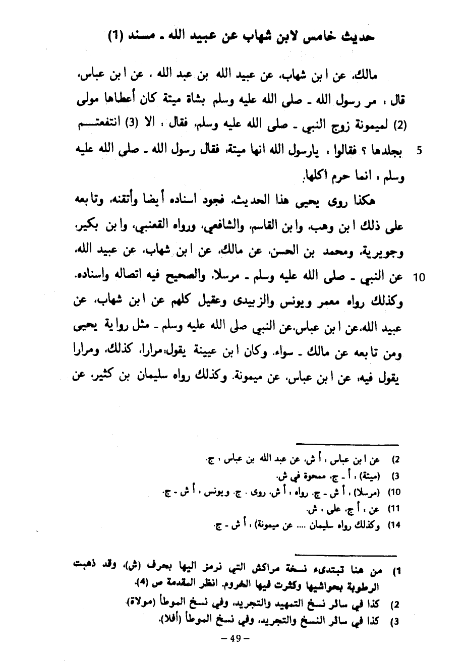 حَدِيثٌ خَامِسٌ لِابْنِ شِهَابٍ عَنْ عُبَيْدِ اللَّهِ مُسْنَدٌ مَالِكٌ عَنِ ابْنِ شِهَابٍ عَنْ عُبَيْدِ اللَّهِ بْنِ عَبْدِ اللَّهِ عَنِ ابْنِ عَبَّاسٍ قَالَ مَرَّ رَسُولُ اللَّهِ صَلَّى اللَّهُ عَلَيْهِ وَسَلَّمَ بِشَاةٍ مَيْتَةٍ كَانَ أَعْطَاهَا مَوْلًى لِمَيْمُونَةَ زَوْجِ النَّبِيِّ صَلَّى اللَّهُ عَلَيْهِ وَسَلَّمَ فَقَالَ أَلَا انْتَفَعْتُمْ بِجِلْدِهَا فَقَالُوا يَا رَسُولَ اللَّهِ إِنَّهَا مَيِّتَةٌ فَقَالَ رَسُولُ اللَّهِ صَلَّى اللَّهُ عَلَيْهِ وَسَلَّمَ إِنَّمَا حُرِّمَ أَكْلُهَا هَكَذَا رَوَى يَحْيَى هَذَا الْحَدِيثَ فَجَوَّدَ إِسْنَادَهُ أَيْضًا وَأَتْقَنَهُ وَتَابَعَهُ عَلَى ذَلِكَ ابْنُ وَهْبٍ وَابْنُ الْقَاسِمِ والشافعي ورواه القعنبي وَابْنُ بُكَيْرٍ وَجُوَيْرِيَّةُ وَمُحَمَّدُ بْنُ الْحَسَنِ عَنْ مَالِكٍ عَنِ ابْنِ شِهَابٍ عَنْ عُبَيْدِ اللَّهِ عَنِ النَّبِيِّ صَلَّى اللَّهُ عَلَيْهِ وَسَلَّمَ مُرْسَلًا وَالصَّحِيحُ فِيهِ اتِّصَالُهُ وَإِسْنَادُهُ وَكَذَلِكَ رَوَاهُ مَعْمَرٌ وَيُونُسُ وَالزُّبَيْدِيُّ وَعُقَيْلٌ كُلُّهُمْ عَنِ ابْنِ شِهَابٍ عَنْ عُبَيْدِ اللَّهِ عَنِ ابْنِ عَبَّاسٍ عَنِ النَّبِيِّ صَلَّى اللَّهُ عَلَيْهِ وَسَلَّمَ مِثْلَ رِوَايَةِ يَحْيَى وَمَنْ تَابَعَهُ عَنْ مَالِكٍ سَوَاءً وَكَانَ ابْنُ عُيَيْنَةَ يَقُولُ مِرَارًا كَذَلِكَ وَمِرَارًا يَقُولُ فِيهِ عَنِ ابْنِ عَبَّاسٍ عَنْ مَيْمُونَةَ وَكَذَلِكَ رَوَاهُ سُلَيْمَانُ بْنُ كَثِيرٍ عَنِ