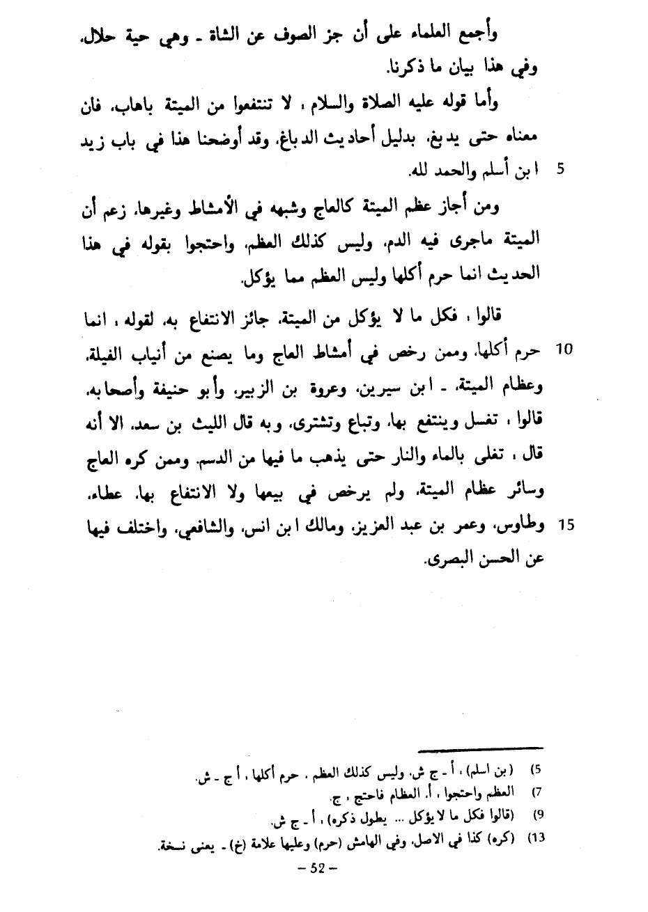 وَأَجْمَعَ الْعُلَمَاءُ عَلَى أَنَّ جَزَّ الصُّوفِ عَنِ الشَّاةِ وَهِيَ حَيَّةٌ حَلَالٌ وَفِي هَذَا بَيَانُ مَا ذَكَرْنَا وَأَمَّا قَوْلُهُ عَلَيْهِ الصَّلَاةُ وَالسَّلَامُ لَا تَنْتَفِعُوا مِنَ الْمَيْتَةِ بِإِهَابٍ فَإِنَّ مَعْنَاهُ حَتَّى يُدْبَغَ بِدَلِيلِ أَحَادِيثِ الدِّبَاغِ وَقَدْ أَوْضَحْنَا هذا في باب زيد ابن أَسْلَمَ وَالْحَمْدُ لِلَّهِ وَمَنْ أَجَازَ عَظْمَ الْمَيْتَةِ كَالْعَاجِ وَشِبْهِهِ فِي الْأَمْشَاطِ وَغَيْرِهَا زَعَمَ أَنَّ الْمَيْتَةَ مَا جَرَى فِيهِ الدَّمُ وَلَيْسَ كَذَلِكَ الْعَظْمُ وَاحْتَجُّوا بِقَوْلِهِ فِي هَذَا الْحَدِيثِ إِنَّمَا حُرِّمَ أَكْلُهَا وَلَيْسَ الْعَظْمُ مِمَّا يُؤْكَلُ قَالُوا فَكُلُّ مَا لَا يُؤْكَلُ مِنَ الْمَيْتَةِ جَائِزٌ الِانْتِفَاعُ بِهِ لِقَوْلِهِ إِنَّمَا حُرِّمَ أَكْلُهَا وَمِمَّنْ رَخَّصَ فِي أَمْشَاطِ الْعَاجِ وَمَا يُصْنَعُ مِنْ أَنْيَابِ الْفِيَلَةِ وَعِظَامِ الْمَيْتَةِ ابْنُ سِيرِينَ وَعُرْوَةُ بْنُ الزُّبَيْرِ وَأَبُو حَنِيفَةَ وَأَصْحَابُهُ قَالُوا تُغْسَلُ وَيُنْتَفَعُ بِهَا وَتُبَاعُ وَتُشْتَرَى وَبِهِ قَالَ اللَّيْثُ بْنُ سَعْدٍ إِلَّا أَنَّهُ قَالَ تُغْلَى بِالْمَاءِ وَالنَّارِ حَتَّى يَذْهَبَ مَا فِيهَا مِنَ الدَّسَمِ وَمِمَّنْ كَرِهَ الْعَاجَ وَسَائِرَ عِظَامِ الْمَيْتَةِ وَلَمْ يُرَخِّصْ فِي بَيْعِهَا وَلَا الِانْتِفَاعِ بِهَا عَطَاءٌ وطاوس وعمر بن عبد العزيز ومالك ابن أَنَسٍ وَالشَّافِعِيُّ وَاخْتُلِفَ فِيهَا عَنِ الْحَسَنِ الْبَصْرِيِّ