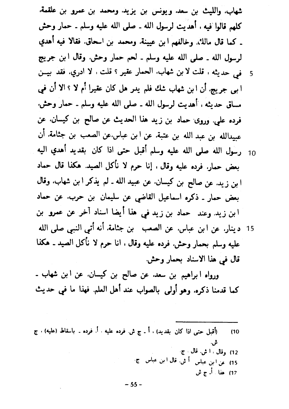 شِهَابٍ وَاللَّيْثُ بْنُ سَعْدٍ وَيُونُسُ بْنُ يَزِيدَ وَمُحَمَّدُ بْنُ عَمْرِو بْنِ عَلْقَمَةَ كُلُّهُمْ قَالُوا فِيهِ أَهْدَيْتُ لِرَسُولِ اللَّهِ صَلَّى اللَّهُ عَلَيْهِ وَسَلَّمَ حِمَارَ وَحْشٍ كَمَا قَالَ مَالِكٌ وَخَالَفَهُمْ ابْنُ عُيَيْنَةَ وَمُحَمَّدُ بْنُ إِسْحَاقَ فَقَالَا فِيهِ أُهْدِيَ لِرَسُولِ اللَّهِ صَلَّى اللَّهُ عَلَيْهِ وَسَلَّمَ لَحْمَ حِمَارِ وَحْشٍ وَقَالَ ابْنُ جُرَيْجٍ فِي حديثه قلت لابن شهاب الحمار عقير قلت لا ادري فقد بين أبي جُرَيْجٍ أَنَّ ابْنَ شِهَابٍ شَكَّ فَلَمْ يَدْرِ هَلْ كَانَ عَقِيرًا أَمْ لَا إِلَّا أَنَّ فِي مَسَاقِ حَدِيثِهِ أَهْدَيْتُ لِرَسُولِ اللَّهِ صَلَّى اللَّهُ عَلَيْهِ وَسَلَّمَ حِمَارَ وَحْشٍ فَرَدَّهُ عَلَيَّ وَرَوَى حَمَّادُ بْنُ زَيْدٍ هَذَا الْحَدِيثَ عَنْ صَالِحِ بْنِ كَيْسَانَ عَنْ عُبَيْدِ اللَّهِ بْنِ عَبْدِ اللَّهِ بْنِ عُتْبَةَ عَنِ ابْنِ عَبَّاسٍ عَنِ الصَّعْبِ بْنِ جَثَّامَةَ أَنَّ رَسُولَ اللَّهِ صَلَّى اللَّهُ عَلَيْهِ وَسَلَّمَ أَقْبَلَ حَتَّى إِذَا كَانَ بِقُدَيْدٍ أُهْدِيَ إِلَيْهِ بَعْضُ حِمَارٍ فَرَدَّهُ عَلَيْهِ وَقَالَ إِنَّا حُرُمٌ لَا نَأْكُلُ الصَّيْدَ هكذا قال حماد ابن زَيْدٍ عَنْ صَالِحِ بْنِ كَيْسَانَ عَنْ عُبَيْدِ اللَّهِ لَمْ يَذْكُرِ ابْنَ شِهَابٍ وَقَالَ بَعْضُ حِمَارٍ ذَكَرَهُ إِسْمَاعِيلُ الْقَاضِي عَنْ سُلَيْمَانَ بْنِ حَرْبٍ عَنْ حَمَّادِ ابن زَيْدٍ وَعِنْدَ حَمَّادِ بْنِ زَيْدٍ فِي هَذَا أَيْضًا إِسْنَادٌ آخَرُ عَنْ عَمْرِو بْنِ دِينَارٍ عَنِ ابْنِ عَبَّاسٍ عَنِ الصَّعْبِ بْنِ جَثَّامَةَ أَنَّهُ أَتَى النَّبِيَّ صَلَّى اللَّهُ عَلَيْهِ وَسَلَّمَ بِحِمَارِ وَحْشٍ فَرَدَّهُ عَلَيْهِ وَقَالَ إِنَّا حُرُمٌ لَا نَأْكُلُ الصَّيْدَ هَكَذَا قَالَ فِي هَذَا الْإِسْنَادِ بِحِمَارِ وَحْشٍ وَرَوَاهُ إِبْرَاهِيمُ بْنُ سَعْدٍ عَنْ صَالِحِ بْنِ كَيْسَانَ عَنِ ابْنِ شِهَابٍ كَمَا قَدَّمْنَا ذِكْرَهُ وَهُوَ أَوْلَى بِالصَّوَابِ عِنْدَ أَهْلِ الْعِلْمِ فَهَذَا مَا فِي حَدِيثِ