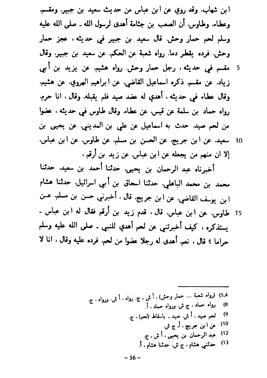 ابْنِ شِهَابٍ وَقَدْ رُوِيَ عَنِ ابْنِ عَبَّاسٍ مِنْ حَدِيثِ سَعِيدِ بْنِ جُبَيْرٍ وَمِقْسَمٍ وَعَطَاءٍ وَطَاوُسٍ أَنَّ الصَّعْبَ بْنَ جَثَّامَةَ أَهْدَى لِرَسُولِ اللَّهِ صَلَّى اللَّهُ عَلَيْهِ وَسَلَّمَ لحم حمار وَحْشٍ قَالَ سَعِيدُ بْنُ جُبَيْرٍ فِي حَدِيثِهِ عَجُزَ حِمَارِ وَحْشٍ فَرَدَّهُ يَقْطُرُ دَمًا رَوَاهُ شُعْبَةُ عَنِ الْحَكَمِ عَنْ سَعِيدِ بْنِ جُبَيْرٍ وَقَالَ مِقْسَمٌ فِي حَدِيثِهِ رِجْلَ حِمَارِ وَحْشٍ رَوَاهُ هُشَيْمٌ عَنْ يَزِيدَ بْنِ أَبِي زِيَادٍ عَنْ مِقْسَمٍ ذَكَرَهُ إِسْمَاعِيلُ الْقَاضِي عَنْ إِبْرَاهِيمَ الْهَرَوِيِّ عَنْ هُشَيْمٍ وَقَالَ عَطَاءٌ فِي حَدِيثِهِ أَهْدَى لَهُ عَضُدَ صَيْدٍ فَلَمْ يَقْبَلْهُ وَقَالَ إِنَّا حُرُمٌ رَوَاهُ حَمَّادُ بْنُ سَلَمَةَ عَنْ قَيْسٍ عَنْ عَطَاءٍ وَقَالَ طَاوُسٌ فِي حَدِيثِهِ عُضْوًا مِنْ لَحْمِ صَيْدٍ حَدَّثَ بِهِ إِسْمَاعِيلُ عَنْ عَلِيُّ بْنُ الْمَدِينِيِّ عَنْ يَحْيَى بْنِ سَعِيدٍ عَنِ ابْنِ جُرَيْجٍ عَنِ الْحَسَنِ بْنِ مُسْلِمٍ عَنْ طَاوُسٍ عَنِ ابْنِ عَبَّاسٍ إِلَّا أَنَّ مِنْهُمْ مَنْ يَجْعَلُهُ عَنِ ابْنِ عَبَّاسٍ عن زيد بن أرقم أخبرناه عبد الرحمان بْنُ يَحْيَى حَدَّثَنَا أَحْمَدُ بْنُ سَعِيدٍ حَدَّثَنَا مُحَمَّدُ بْنُ مُحَمَّدٍ الْبَاهِلِيُّ حَدَّثَنَا إِسْحَاقُ بْنُ أبي إسرائيل حدثنا هشام ابن يُوسُفَ الْقَاضِي عَنِ ابْنِ جُرَيْجٍ قَالَ أَخْبَرَنِي حَسَنُ بْنُ مُسْلِمٍ عَنْ طَاوُسٍ عَنِ ابْنِ عَبَّاسٍ قَالَ قَدِمَ زَيْدُ بْنُ أَرْقَمَ فَقَالَ لَهُ ابْنُ عَبَّاسٍ يَسْتَذْكِرُهُ كَيْفَ أَخْبَرْتَنِي عَنْ لَحْمٍ أُهْدِيَ لِلنَّبِيِّ صَلَّى اللَّهُ عَلَيْهِ وَسَلَّمَ حراما قال نعم أهدى له رجلا عُضْوًا مِنْ لَحْمٍ فَرَدَّهُ عَلَيْهِ وَقَالَ إِنَّا لا